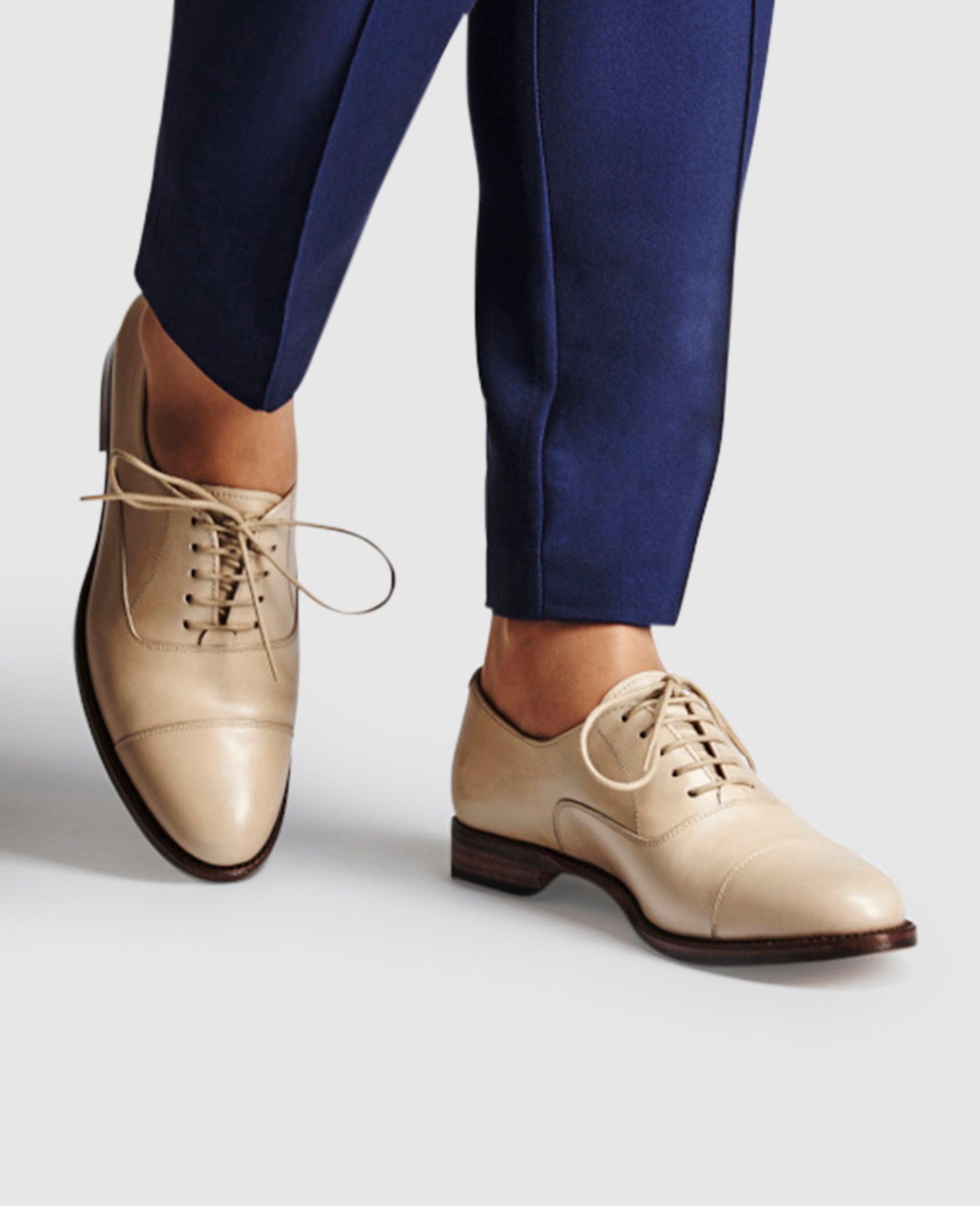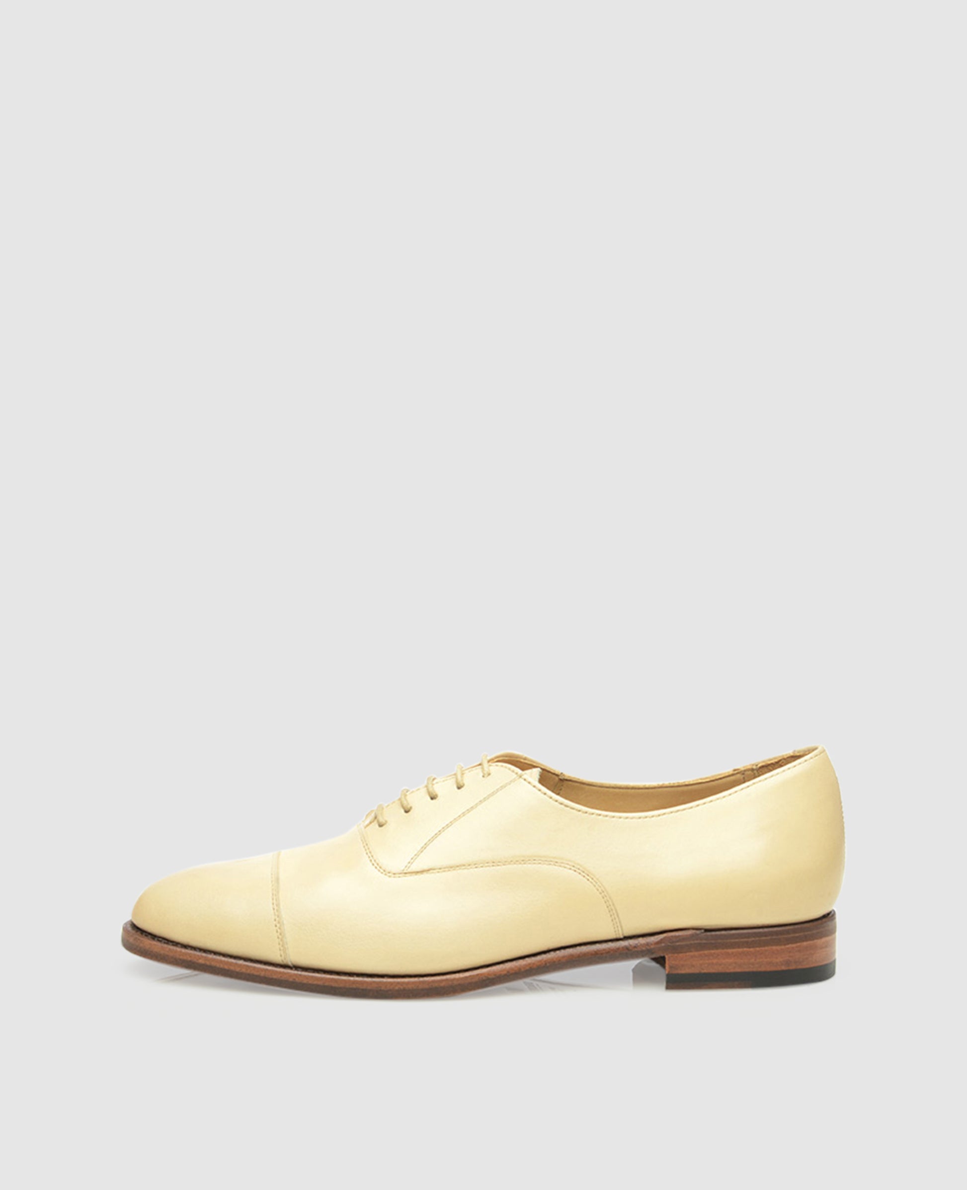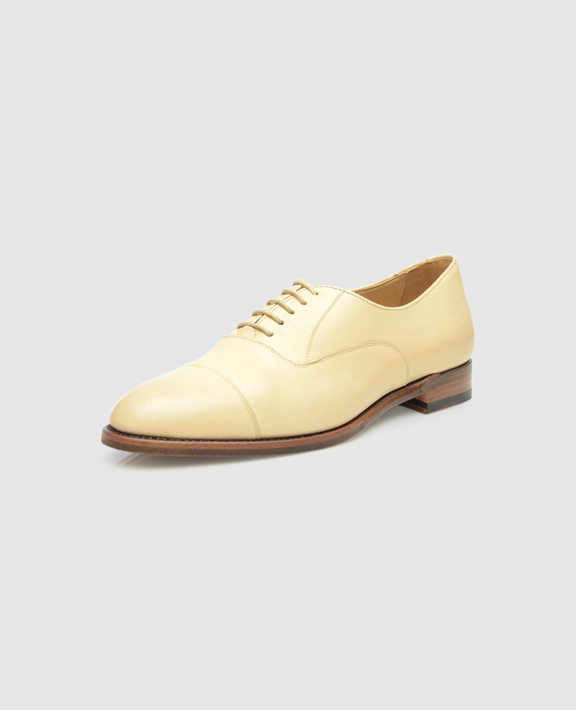 No. 122 combines high-quality materials and traditional style to extraordinary effect. This is a Goodyear-welted women’s cap toe oxford with closed five-eyelet lacing— the cut of the shaft evokes the most elegant men’s shoe in the world. Made with a distinctive feminine last form and featuring a stylish, cream-coloured leather upper, No. 122 is a masculine footwear classic reborn as a modern women’s flat shoe.