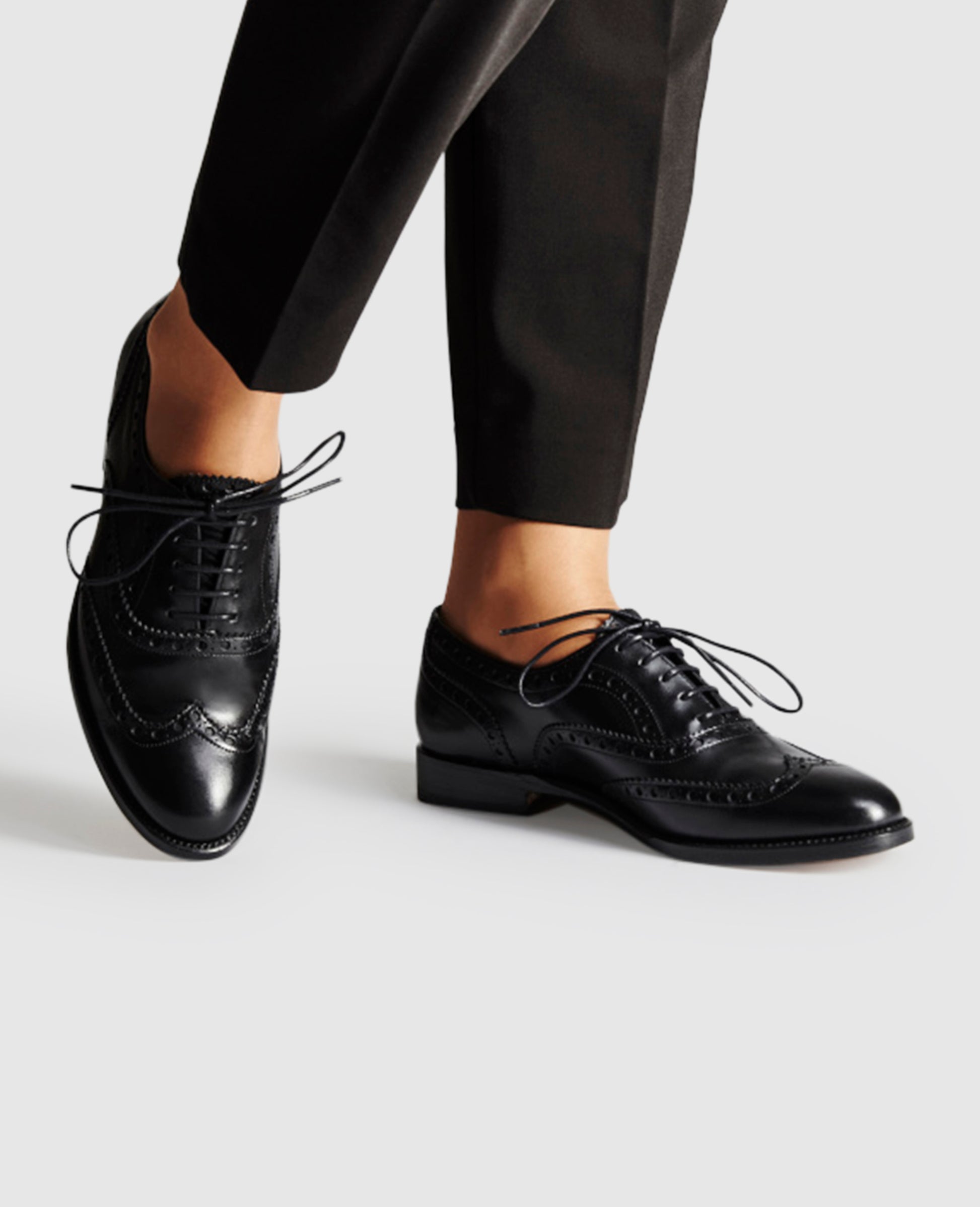 No. 150 is a classic black women’s brogue made of fully-dyed calfskin. Men’s full brogue oxfords are a traditional favourite, prized since the early 20th century for their sporty yet elegant style. The oxford, or so-called »trotteur«, crossed over into women’s footwear in the late 1910s. Today, women usually pair black variants of this lace-up shoe with office attire.