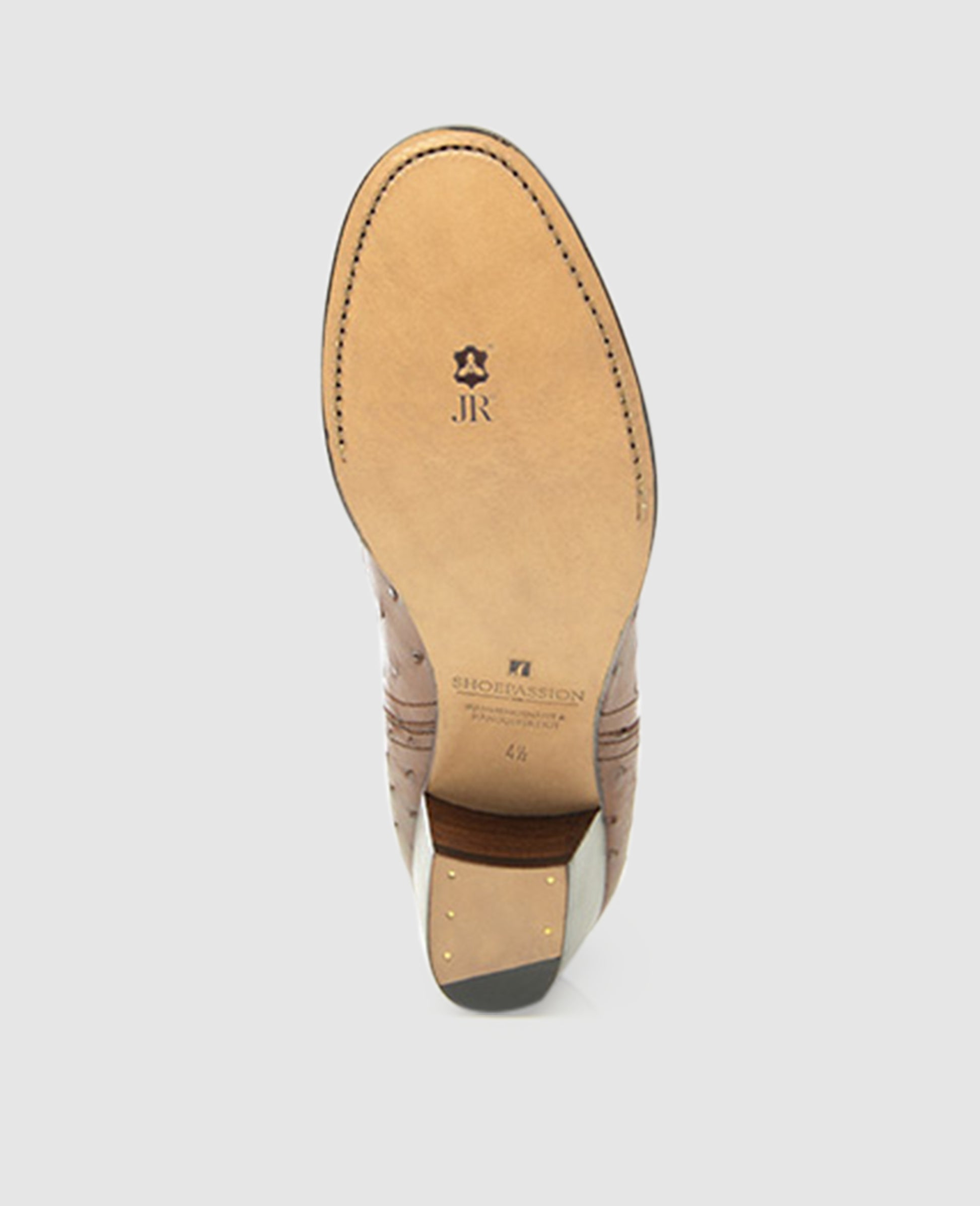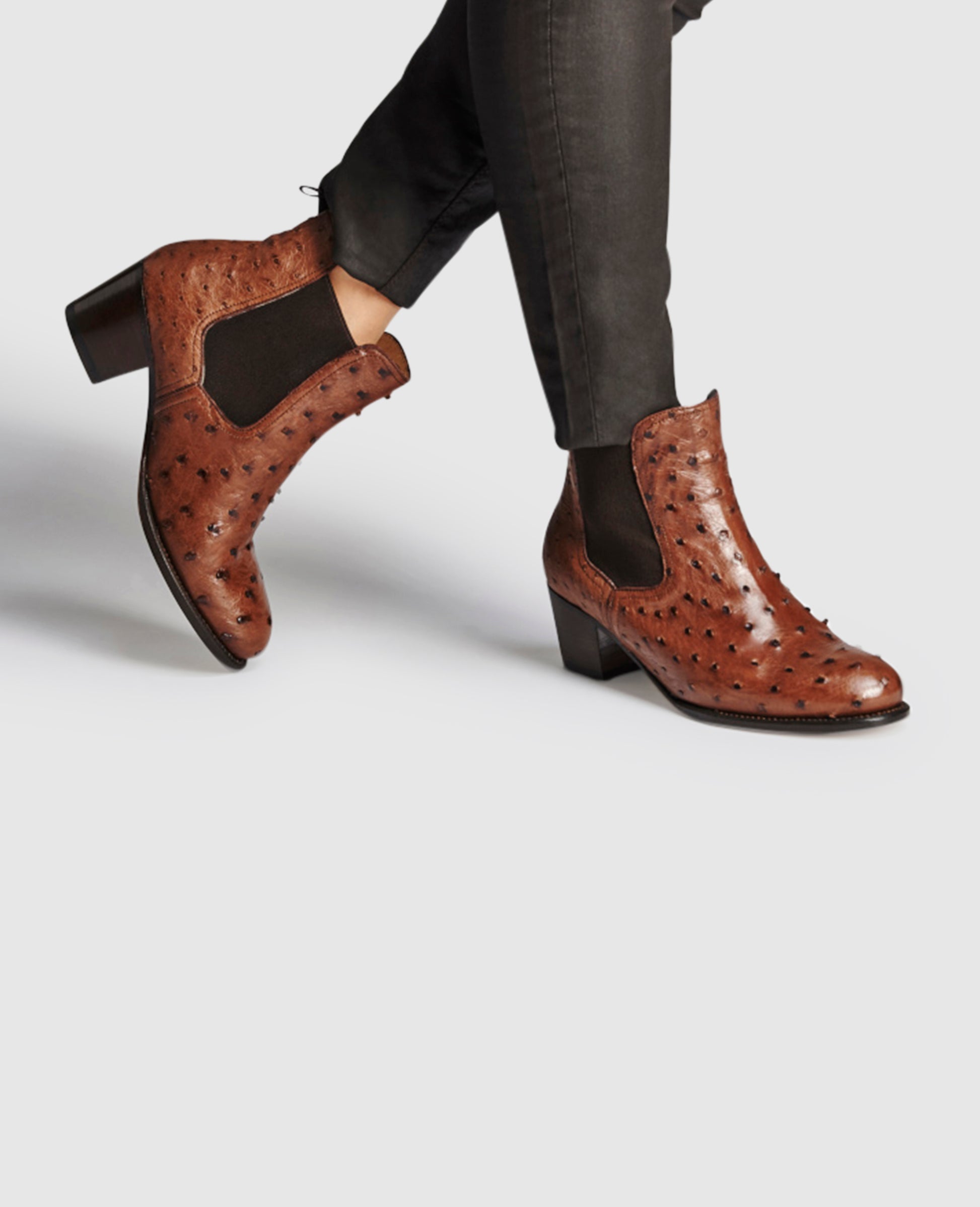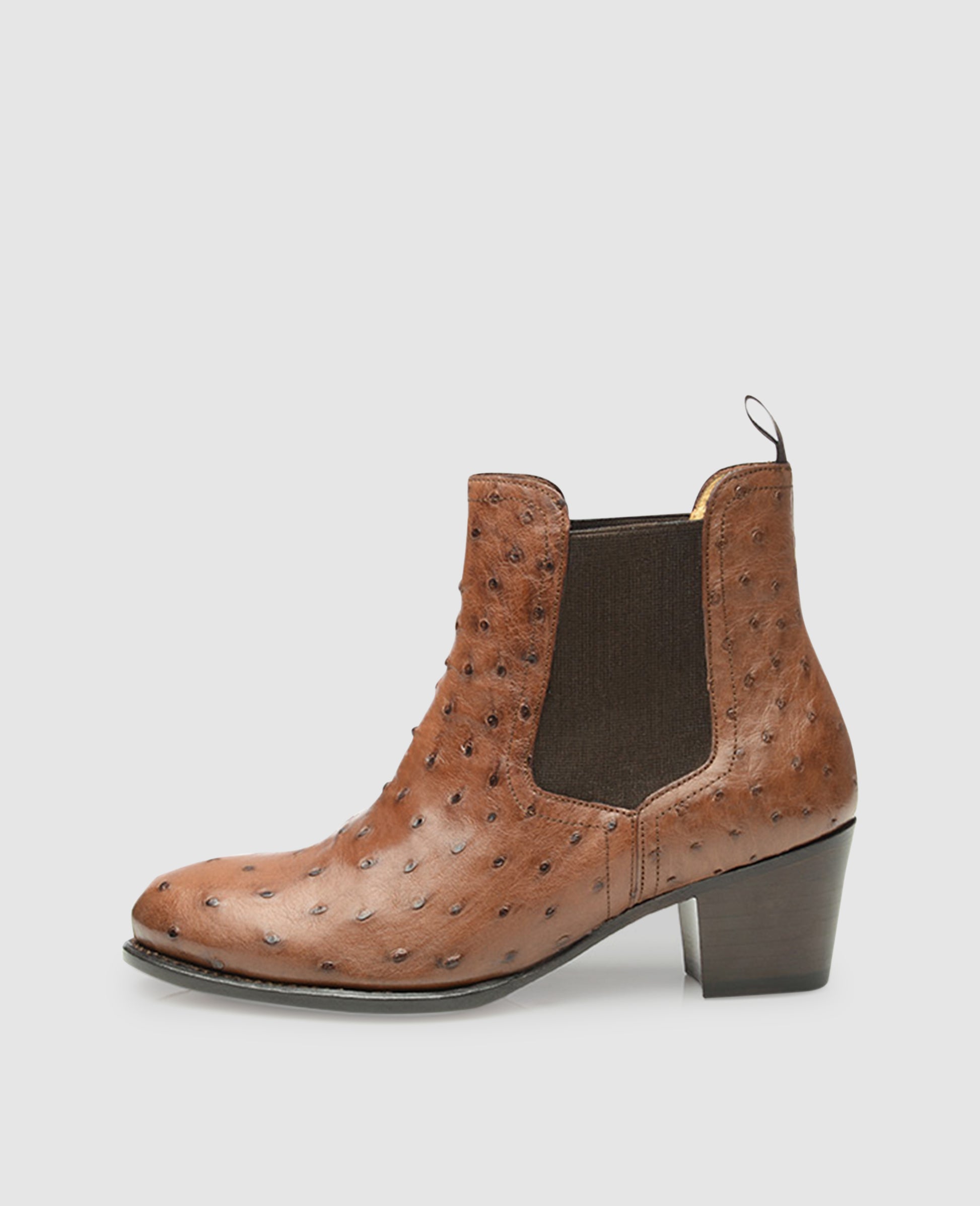 This tobacco-coloured ostrich heeled Chelsea boot is an exotic eyecatcher. The shaft consists entirely of leather taken from the largest flying bird in the world—the ostrich. Ostrich leather’s characteristic nubbly structure gives this full-leather shoe a fascinating look, coming from the stomach of this gigantic flying bird. Although this boot is made from an unusual material, it features a classic shaft cut that hearkens back to the days of the British Empire.