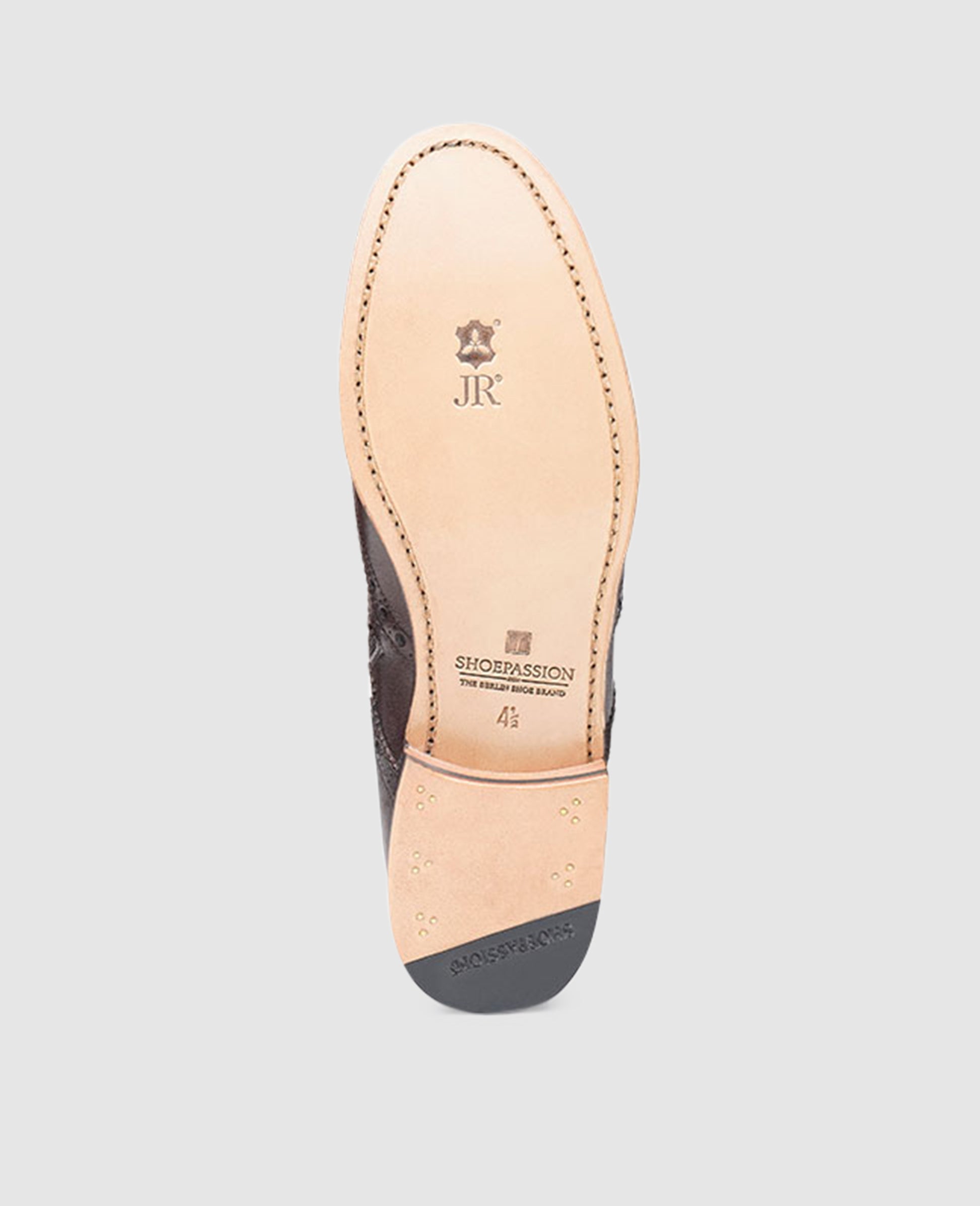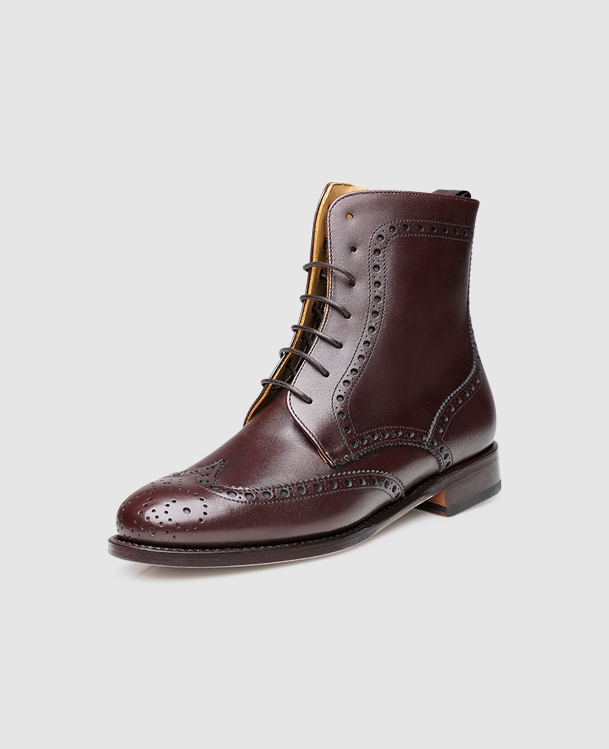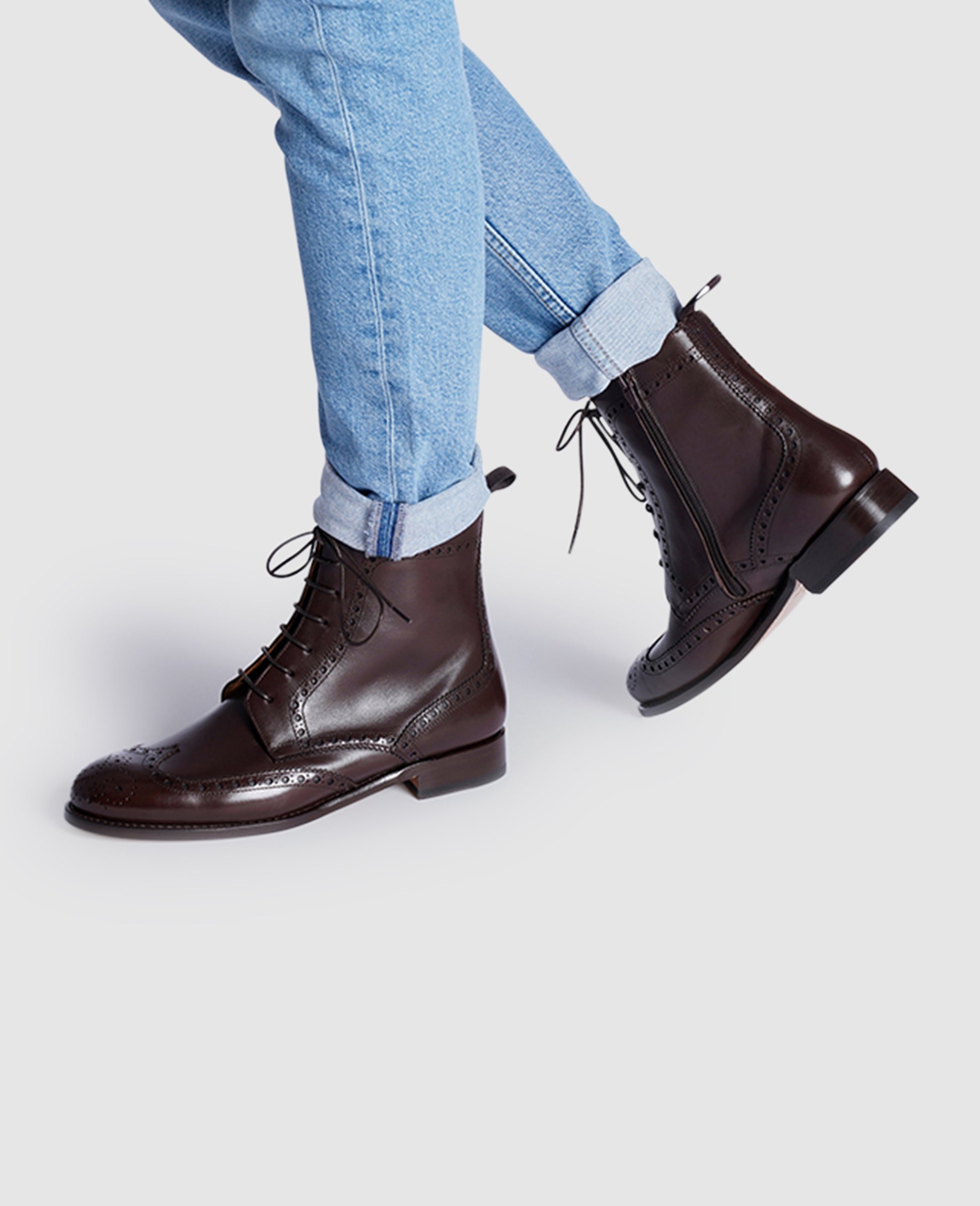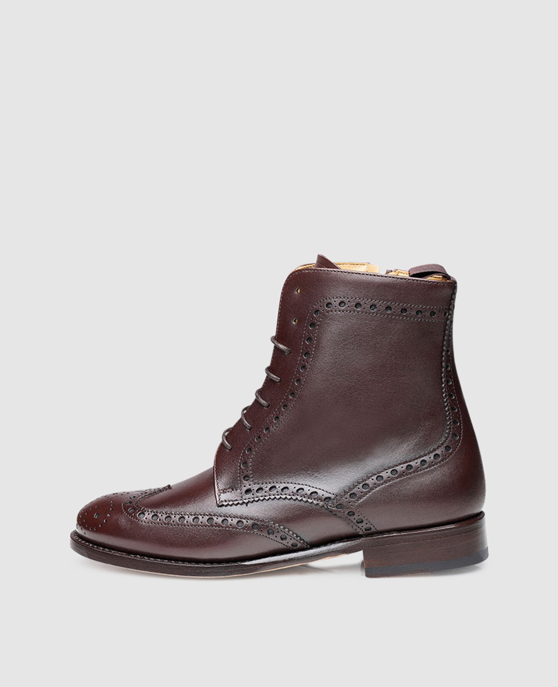 No. 250 is a full-brogue women’s derby boot in dark brown. While the cut and design evoke traditional men’s footwear, the shaft of this model extends significantly higher than that of the classic derby. Instead of the derby’s typical five-eyelet lacing, this dark brown lace-up boot features seven-eyelet lacing. A side zipper closure makes this shoe easy to put on and take off.