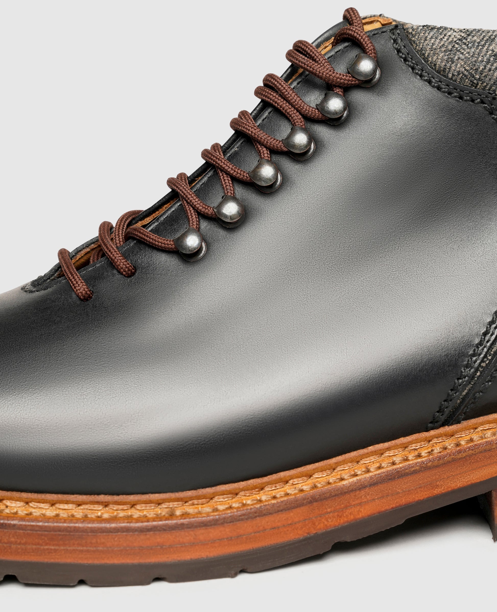 Heinrich Dinkelacker has reinterpreted a traditional hiking boot using carefully selected materials in a timeless design – the perfect addition to any sporting casual wardrobe. The exquisite calfskin offers a comfortable felt insert at the heel. Additional comfort is promised by the reinforced topline, which has been designed with soft padding. Thanks to the traditional double sole with its sturdy rubber profile, this men's boot guarantees a secure grip on the terrain even in unpleasant weather conditions.