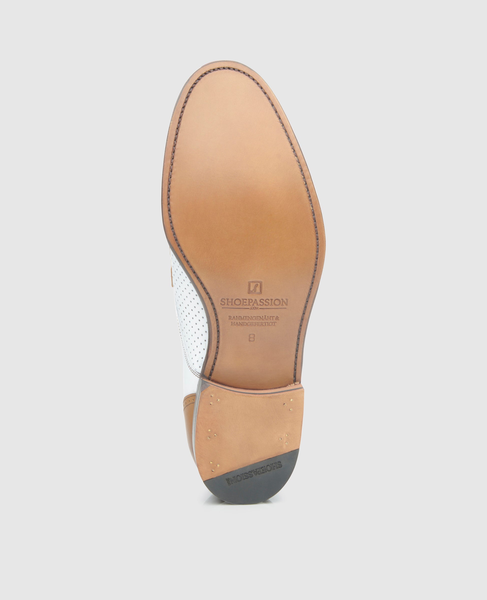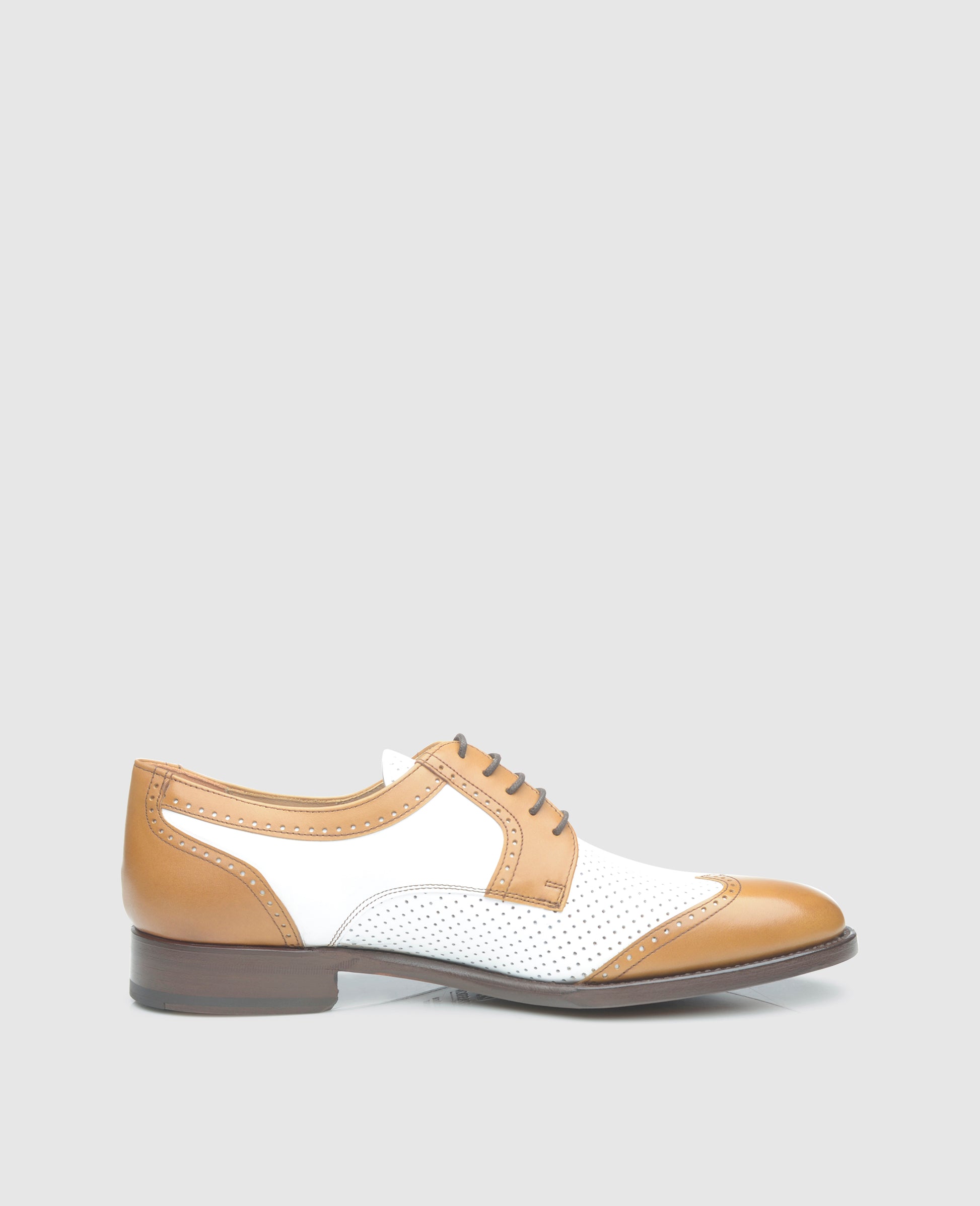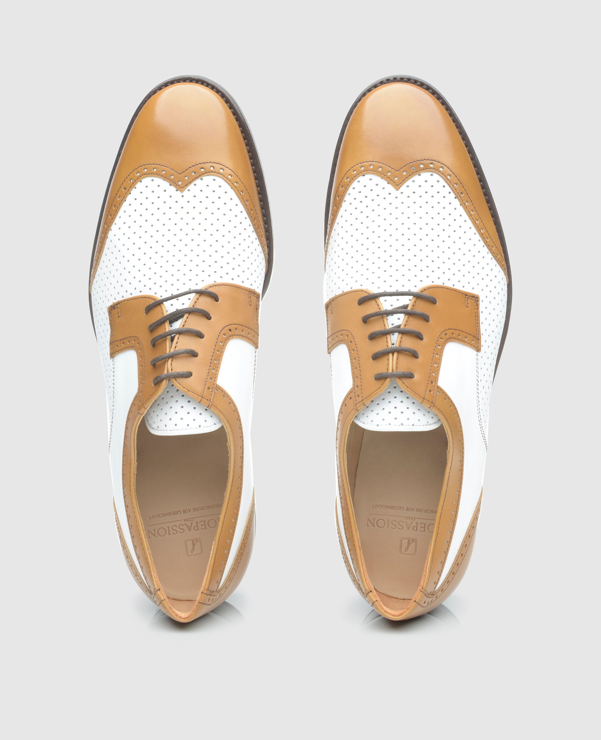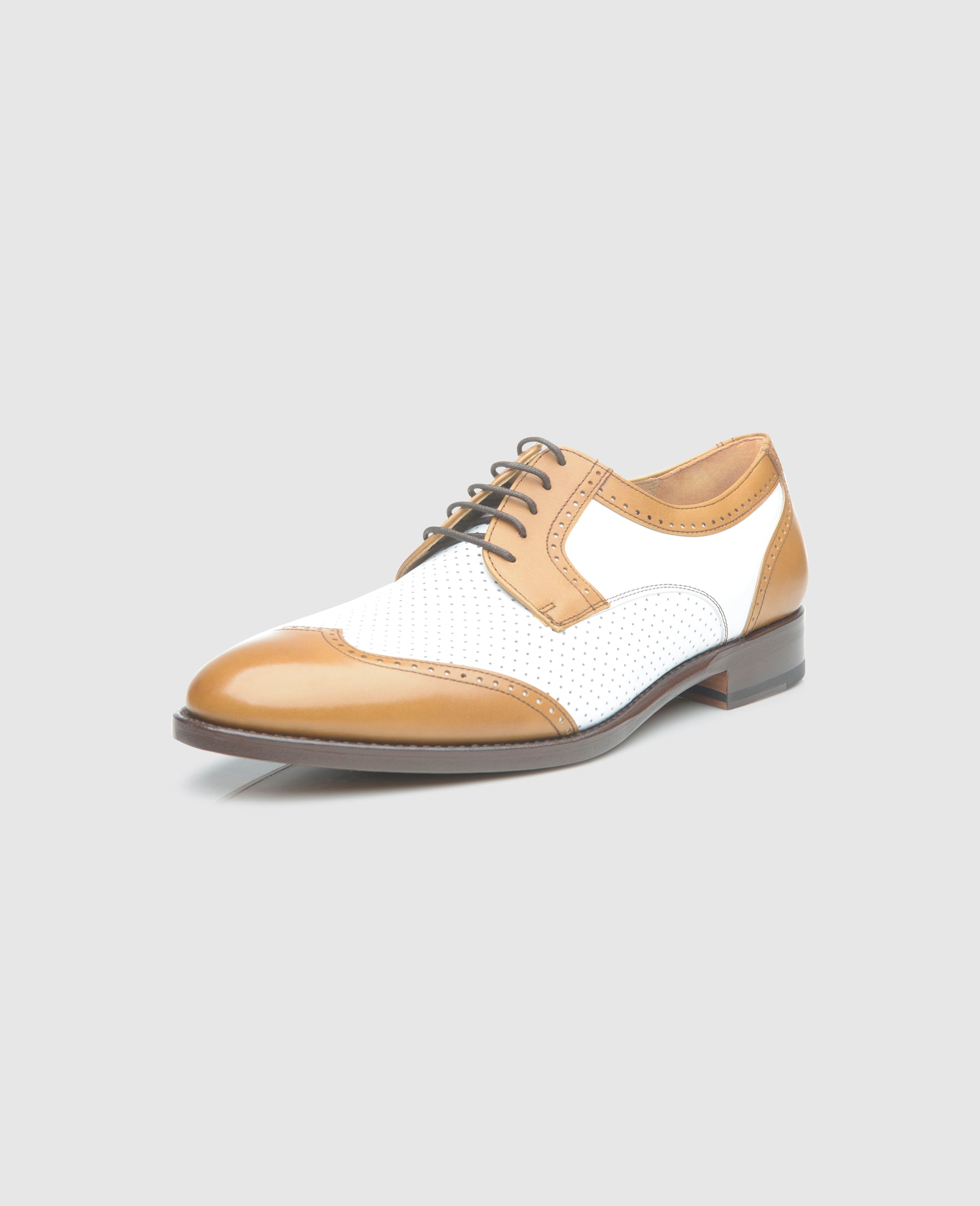 Our No. 381 is a dynamic two-tone shoe in cognac and white. The term “two-tone” denotes the shoe’s two different upper colours, which lend the shoe its signature dandyism. This Derby boasts decorative white side panels and a beautiful sewn-on wing cap in cognac. Rich in contrasts, the shoe’s stylings match the versatile character of the Derby shoe perfectly.