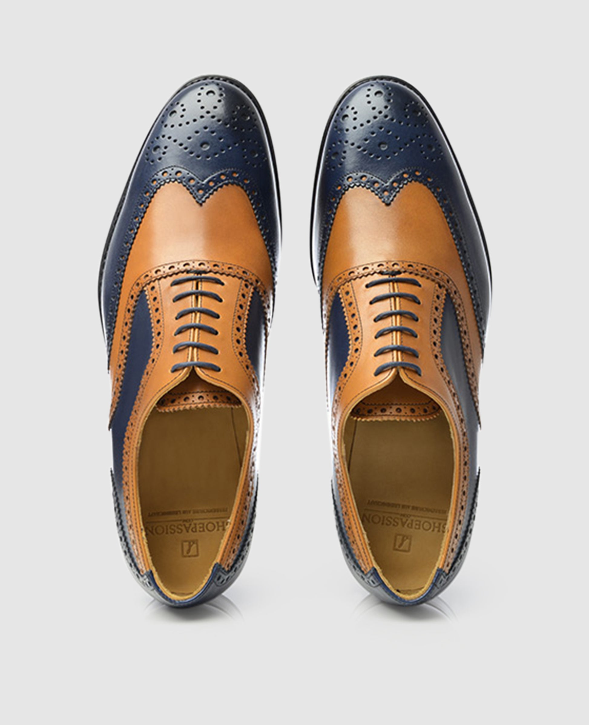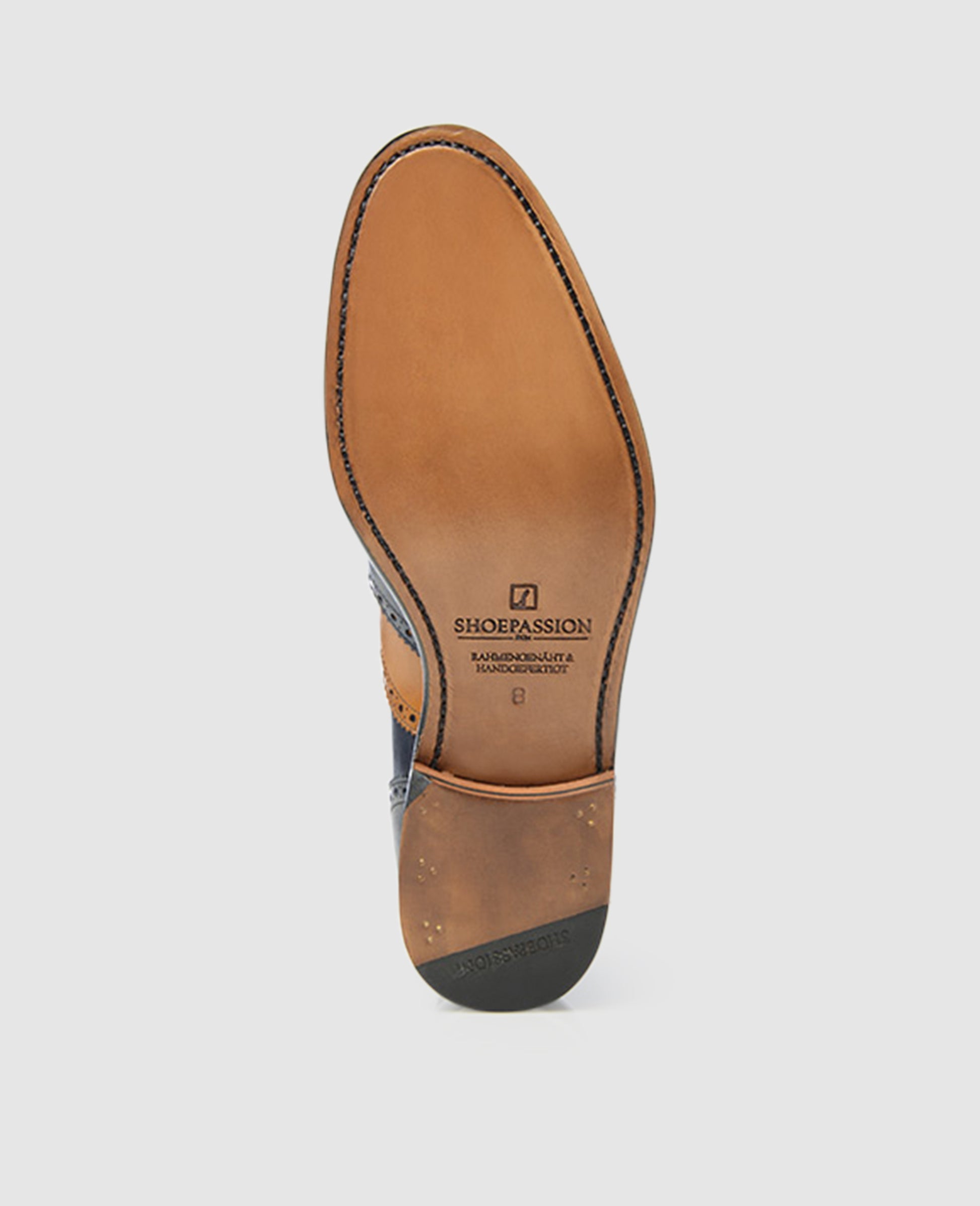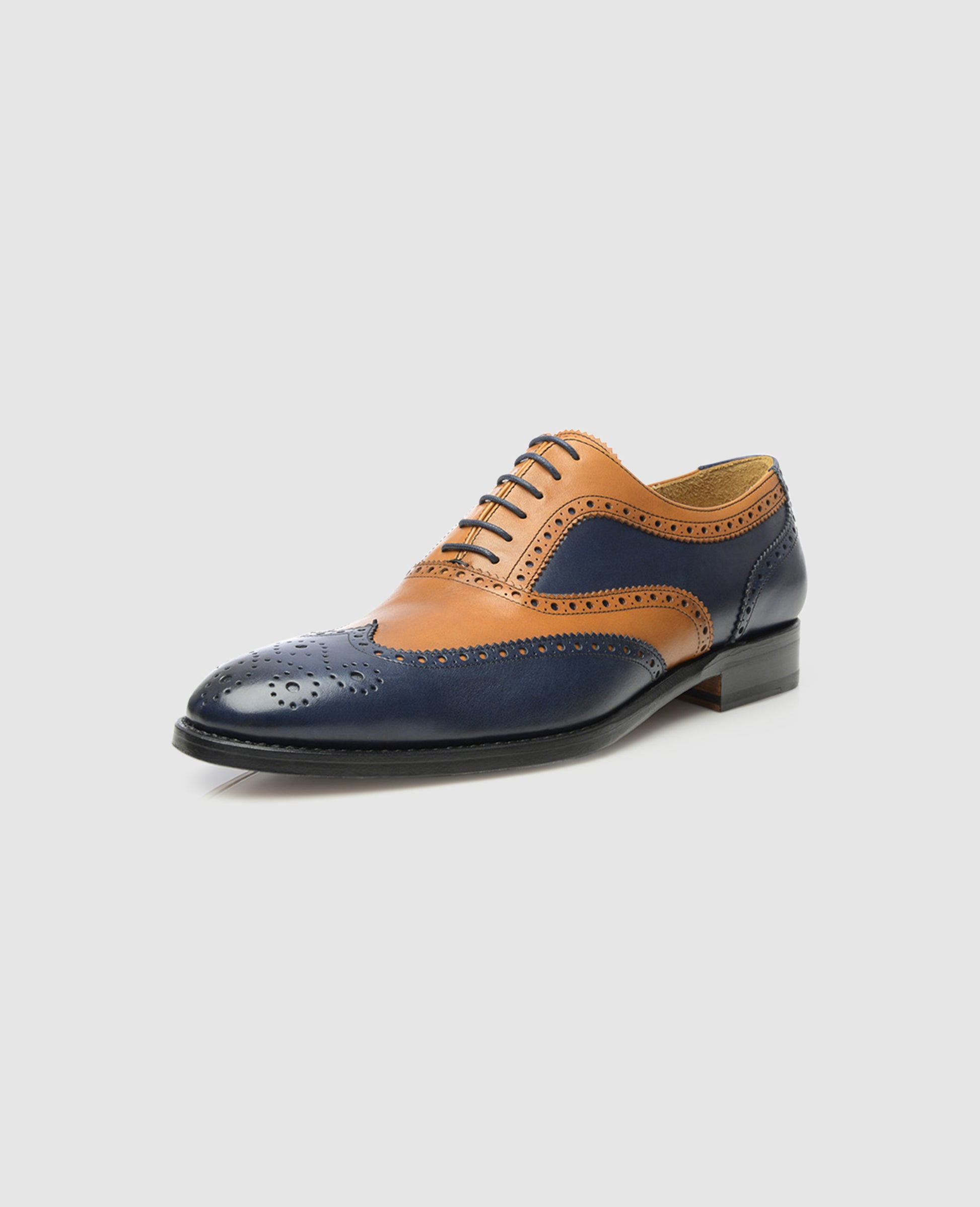 Our No. 382 is a Goodyear-welted full-brogue Oxford in blue and cognac. Thanks to its fashionable design this full-leather shoe is a so-called “two tone”. Shoes with two different colours featured on the leather upper first became popular at the beginning of the 20th century and developed into a firm favourite for Dandies everywhere. Even today this shoe style remains a real hit.
