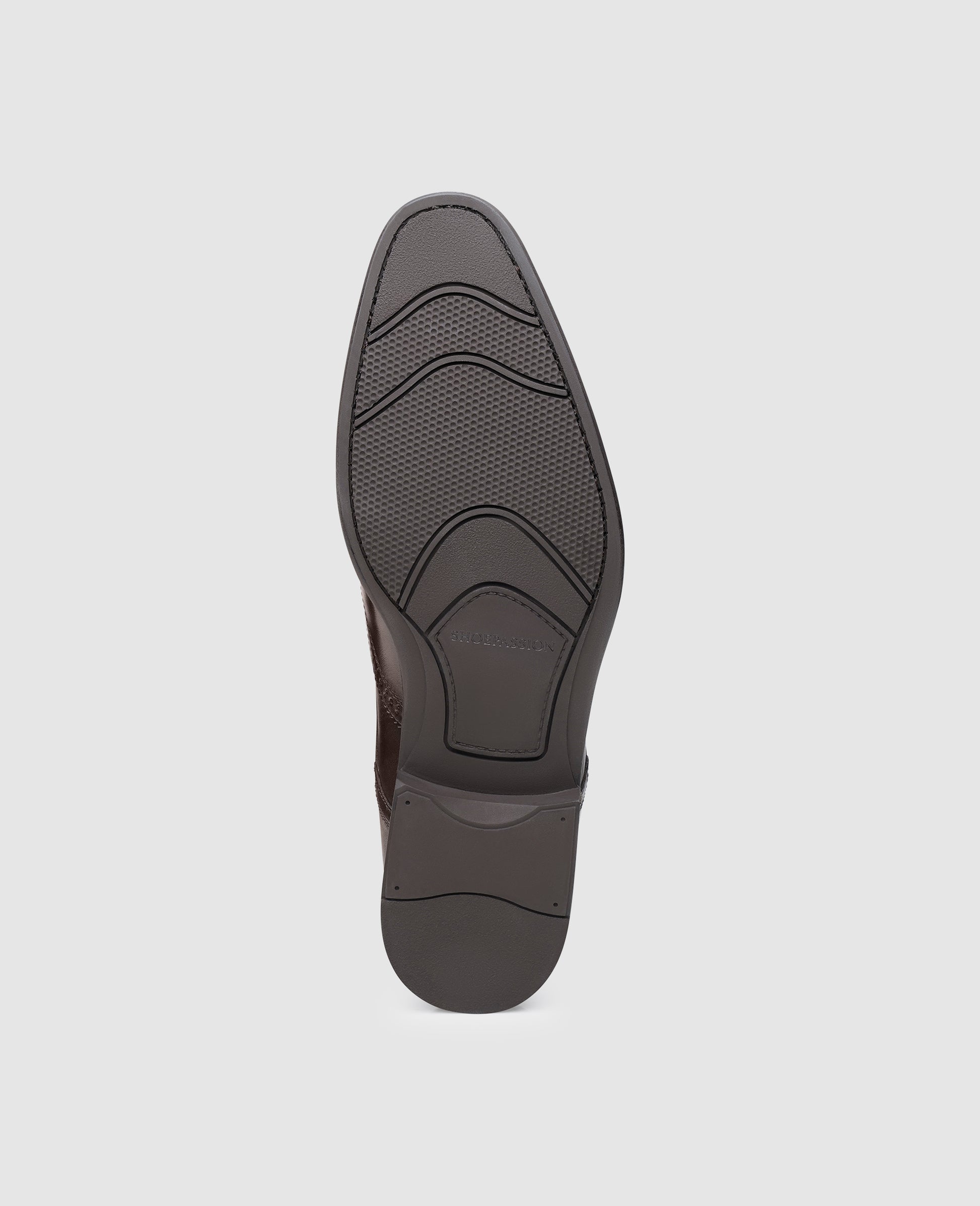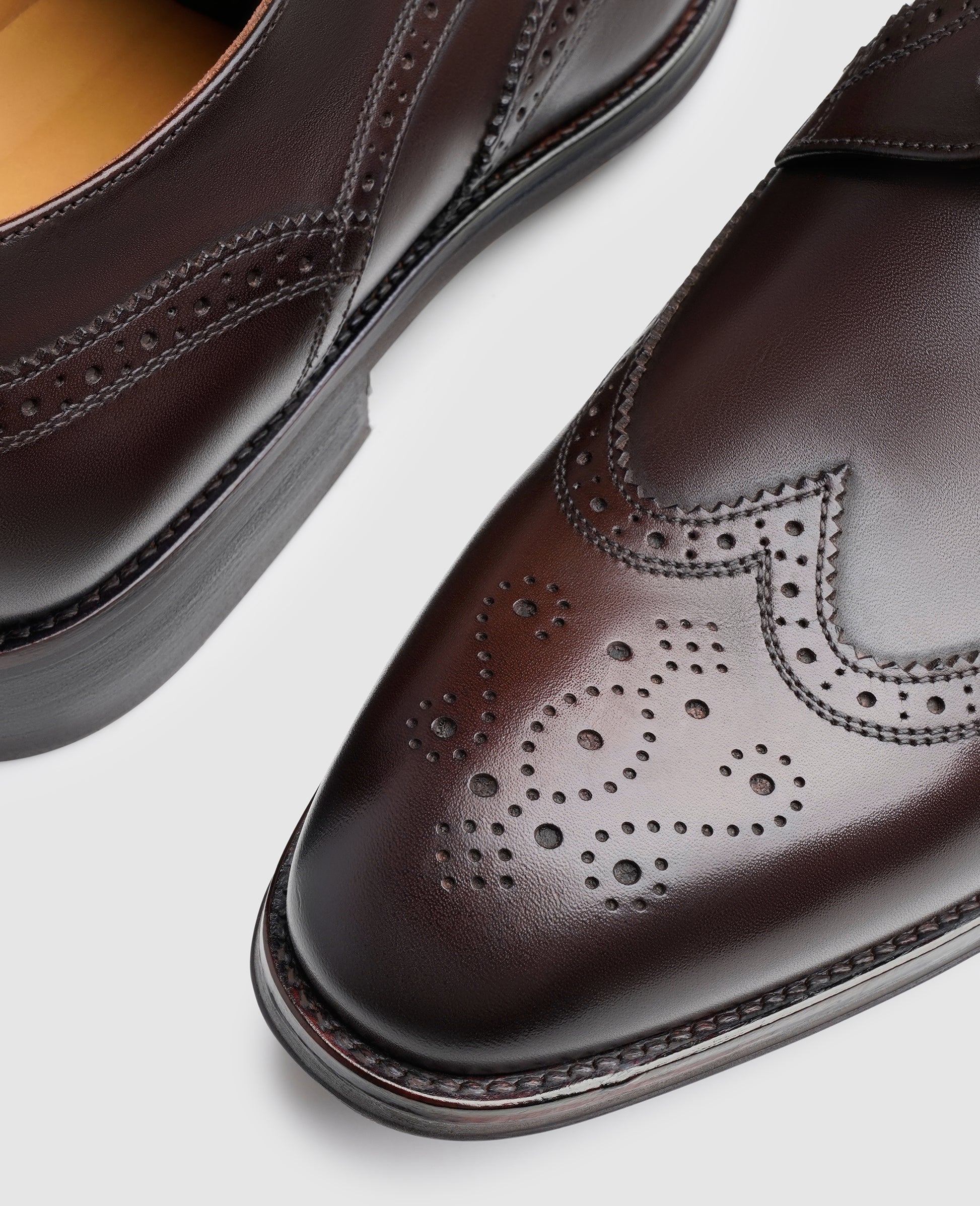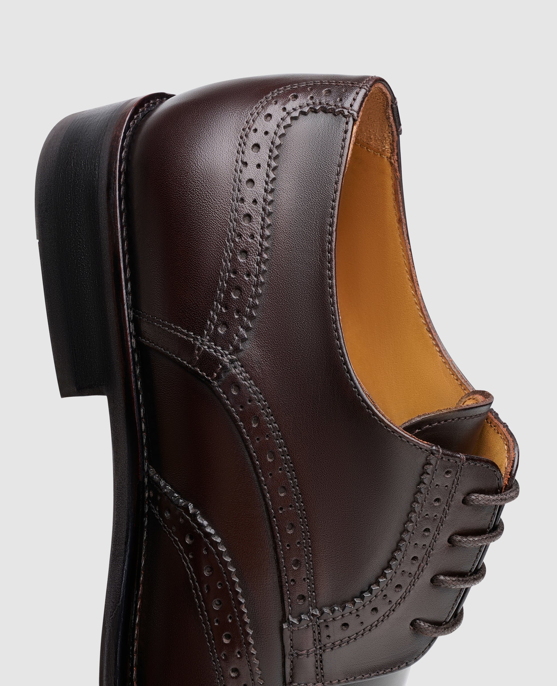 Pronounced lyra perforations along the edges of the upper and the attached wing and heel caps envelop this popular men's shoe model in a sophisticated yet playful guise. The dynamic character of this handcrafted, full-brogue Derby is complemented by the traditional open-eyelet lacing. Its suitability for everyday use is evidenced not only in the cowhide leather used for the upper, but also in the elaborate sole construction.