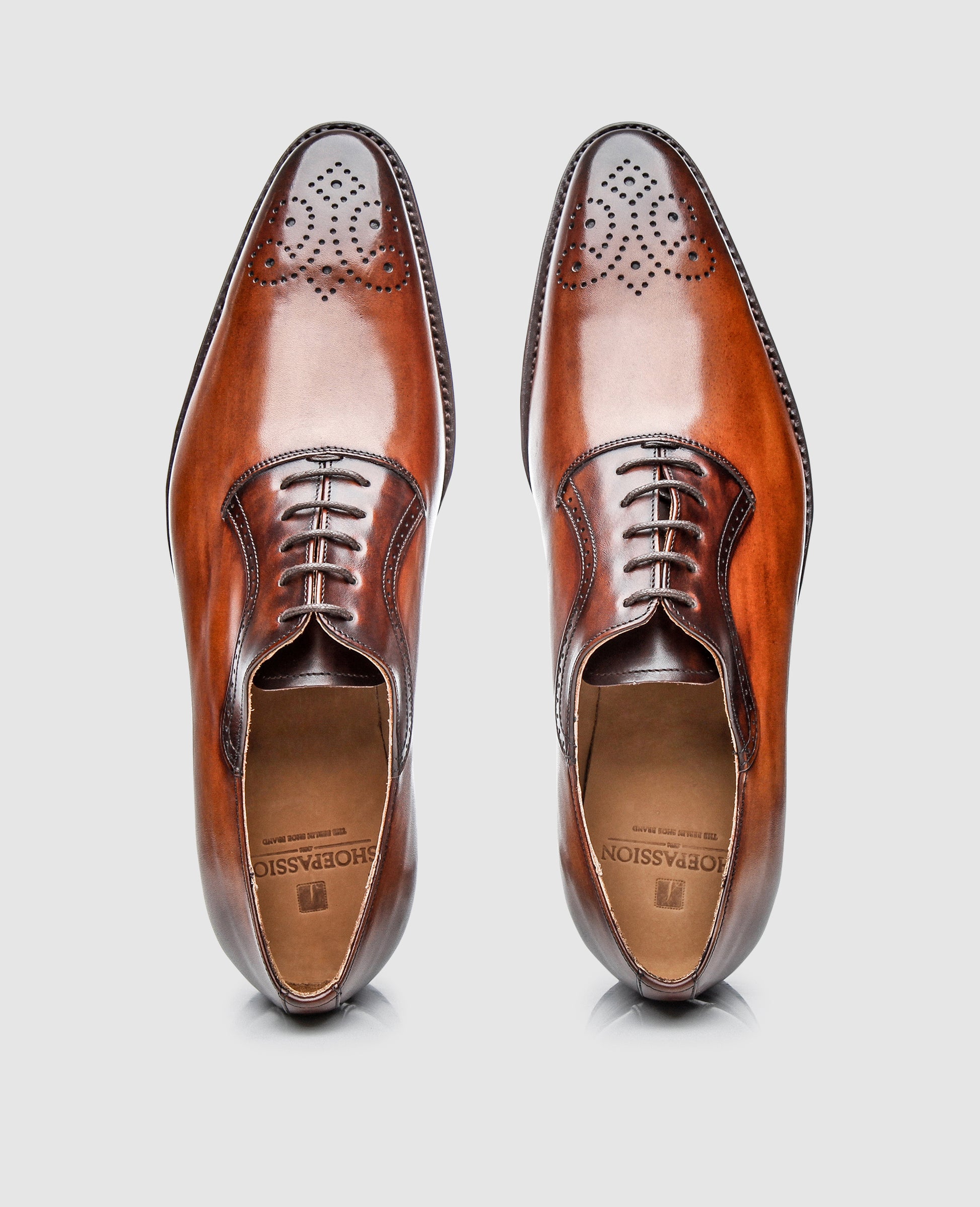 These two-tone, full-grain leather Oxfords are simultaneously classic and eccentric shoes. The detailed ornamentation on the toe cap and contrasting dark quarters make these shoes true eye-catchers.