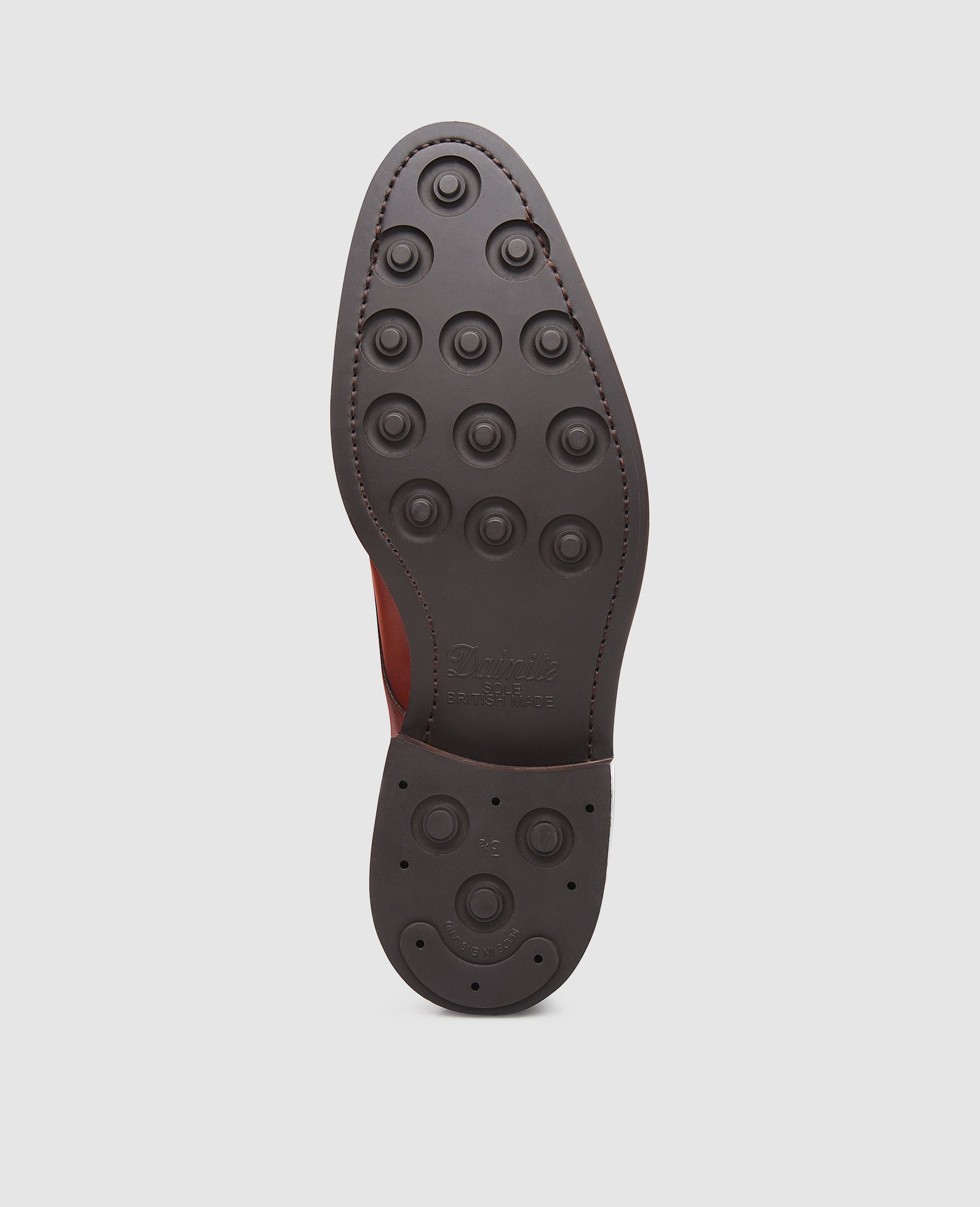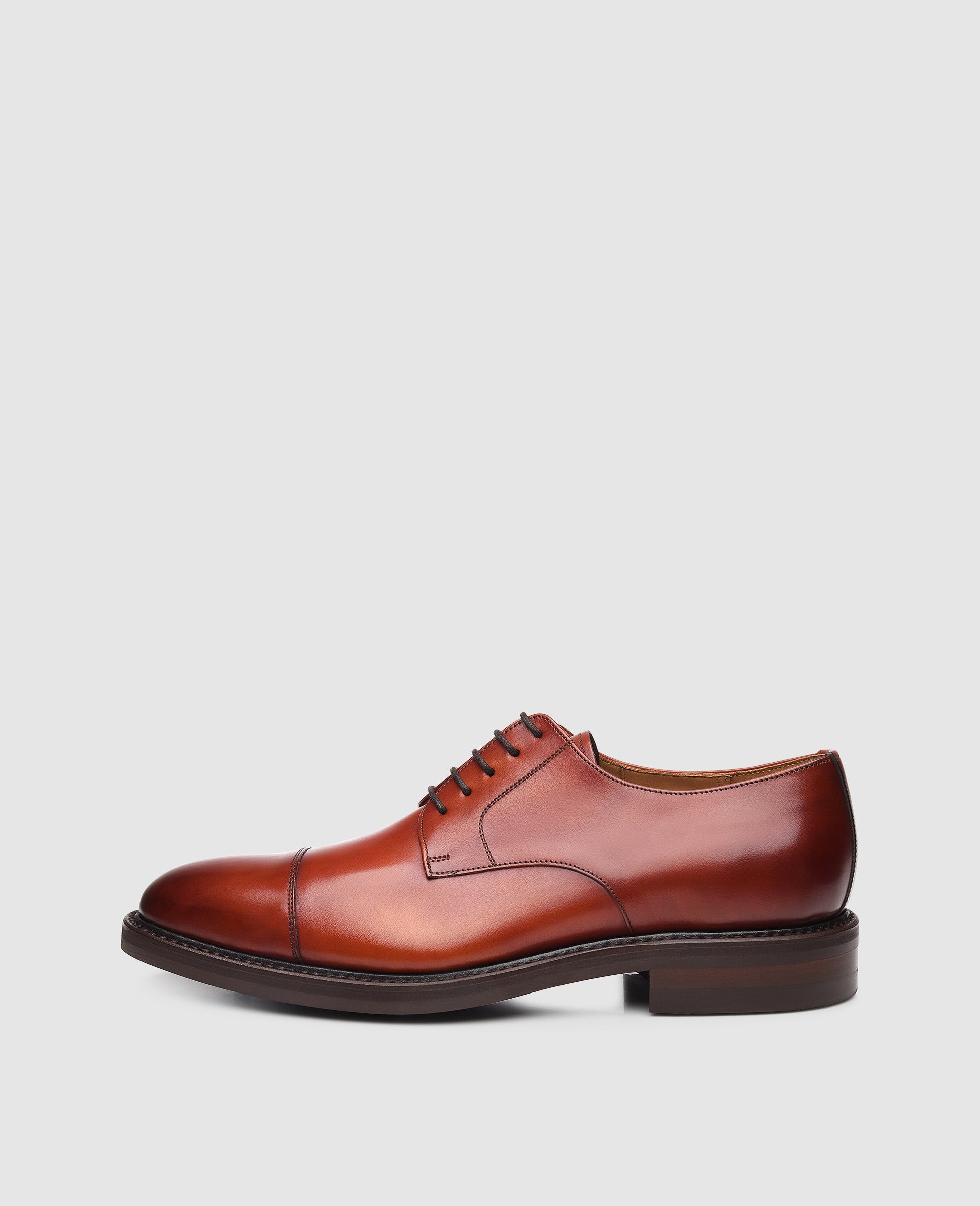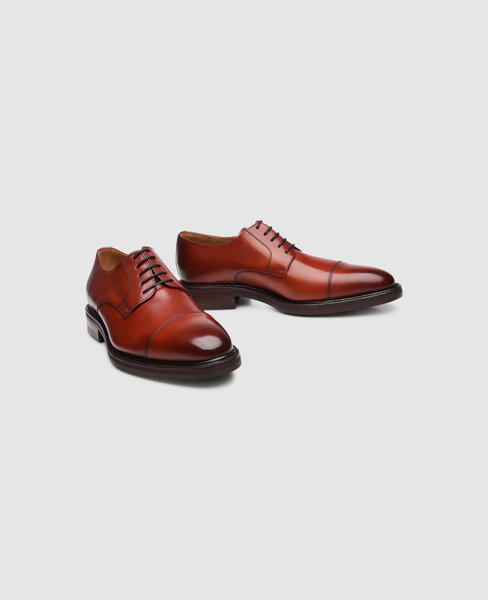 This men’s lace-up builds a bridge between classic tradition and exciting modernity. At first glance, this handcrafted and Goodyear-welted cap-toe Derby appears to be aimed at a classic dress code. But then playful color nuances on the gently tanned calfskin loosen up the character of this rather rare men's shoe model with its eponymous front cap seam in style. The dynamic hand finish is the result of an extremely elaborate procedure carried out by a master craftsman. The comfortable Dainite rubber outsole offers a secure grip, even in adverse weather conditions.