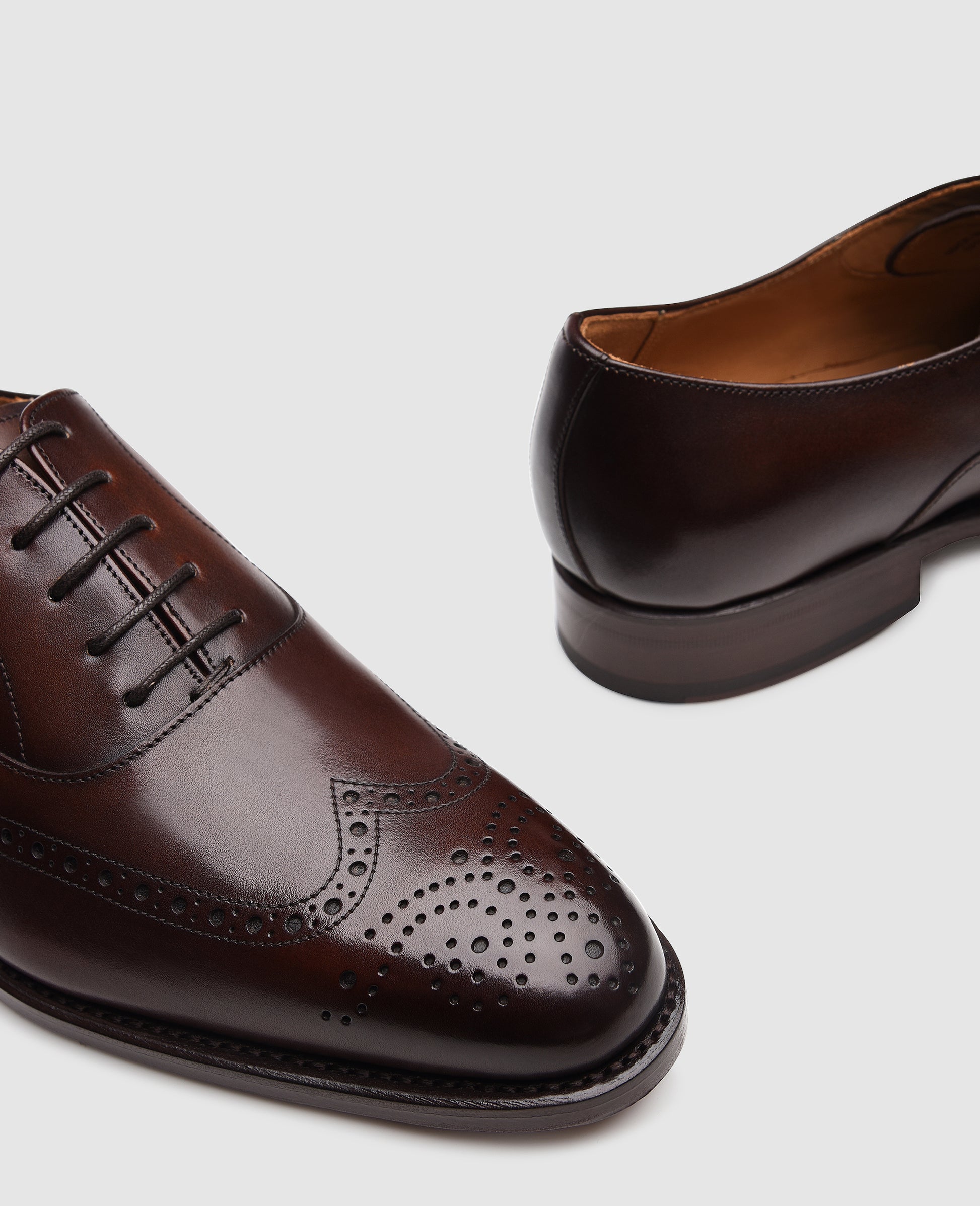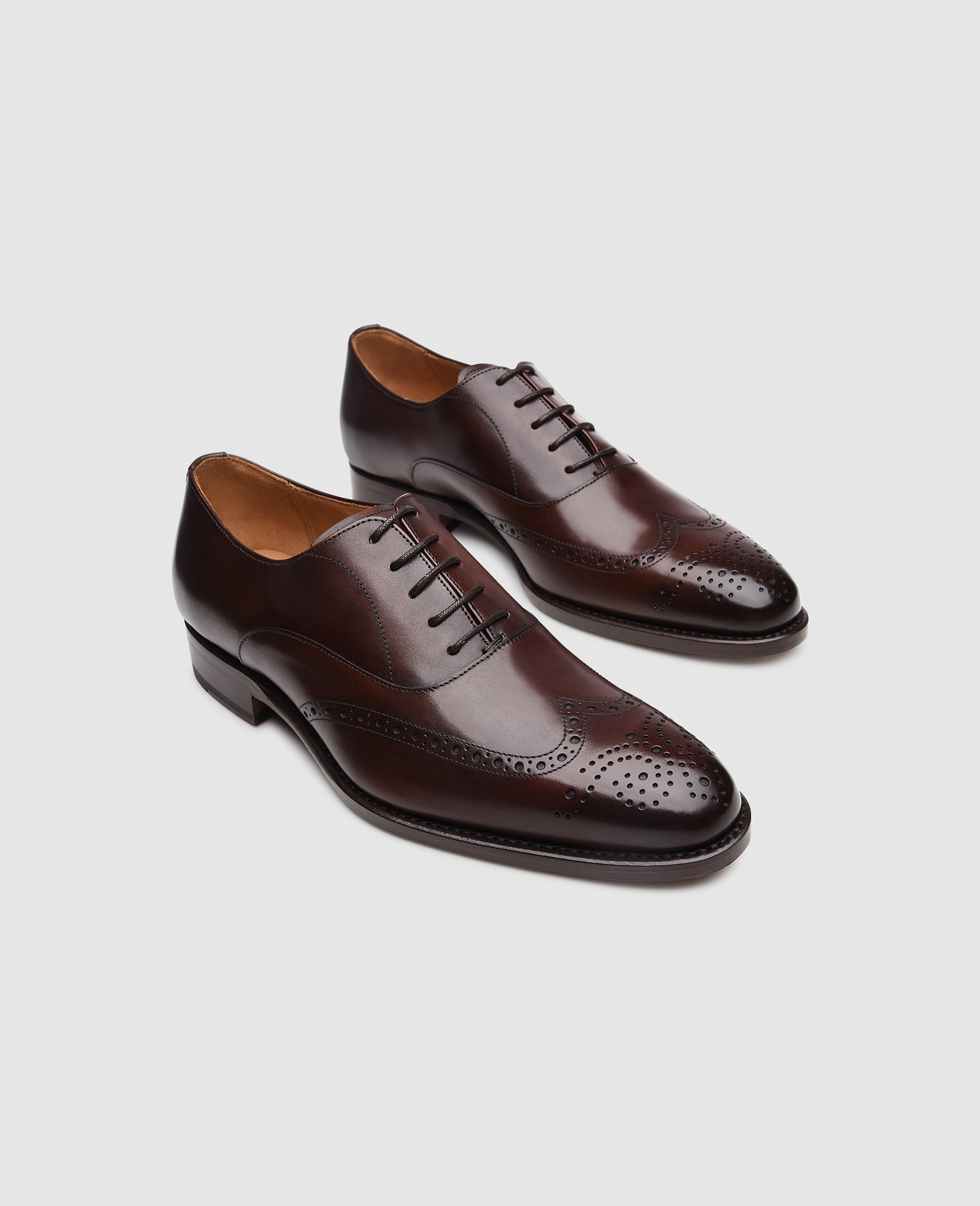 Men with a penchant for that certain something will find the right balance between classic grace and modern refinement in this men's shoe model. The playful lines of this brogue Oxford offer the traditional closed-eyelet lacing, a decorated wing cap and an elegant rosette. The novelty: the heel cap and other edges do not have any additional decoration. Instead, the focus lies on the enchanting hand finish of the fine calfskin. These subtle light-dark gradations guarantee an additional dynamism and transform this Goodyear-welted full leather shoe into the right match for an unforgettable appearance.