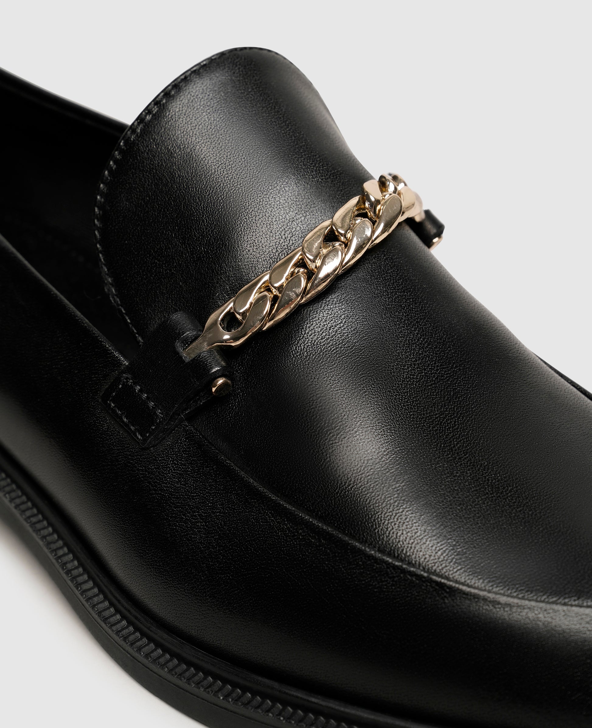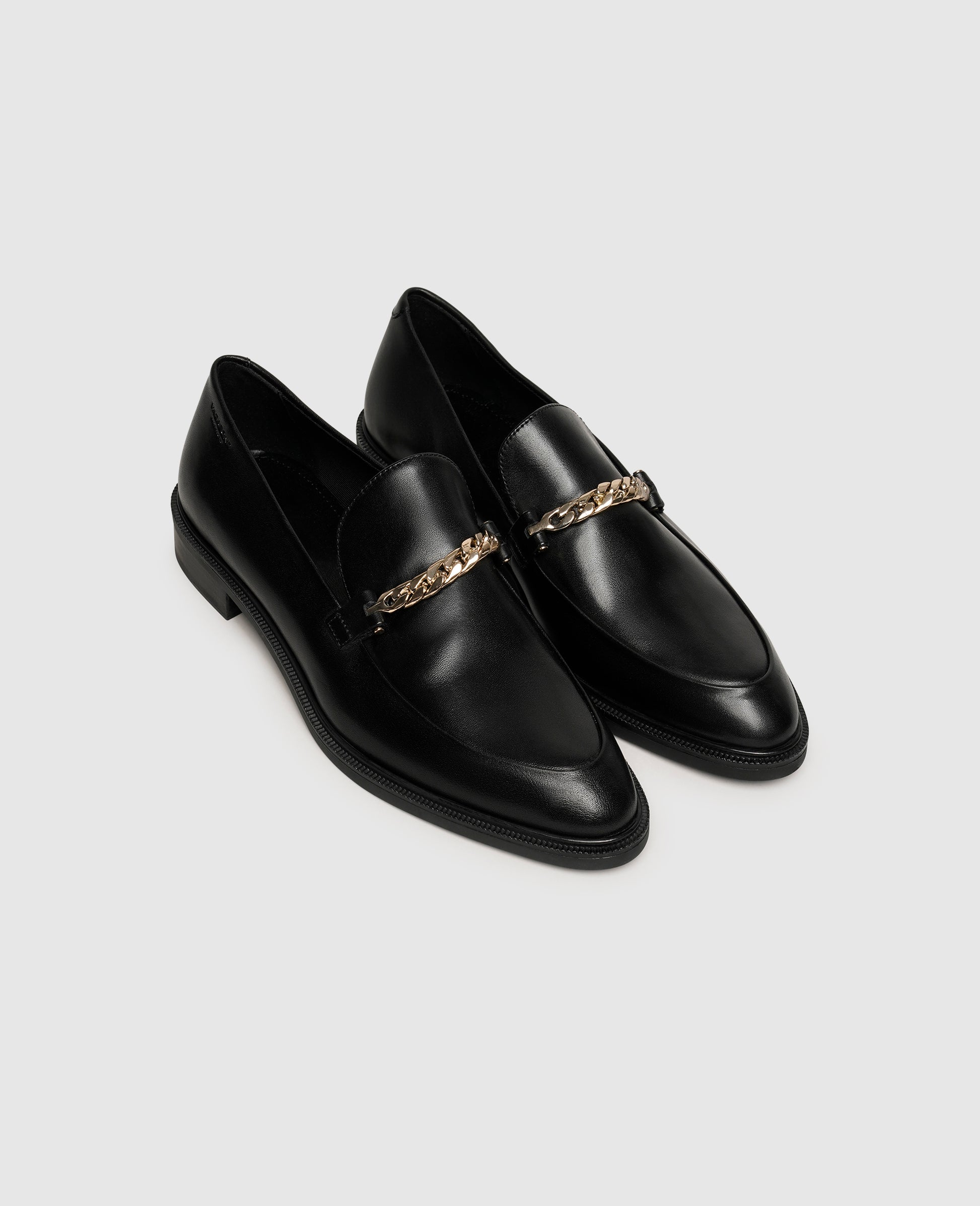 This smooth leather loafer from Vagabond is a sophisticated blend of classic elegance and on-trend contemporary style. Instead of the typical appliqué across the vamp that defines a Penny Loafer, this model is adorned with a gold-tone link chain as a special eye-catching detail. The pointed toe and 2.9-centimeter block heel add an additional feminine accent to this model.