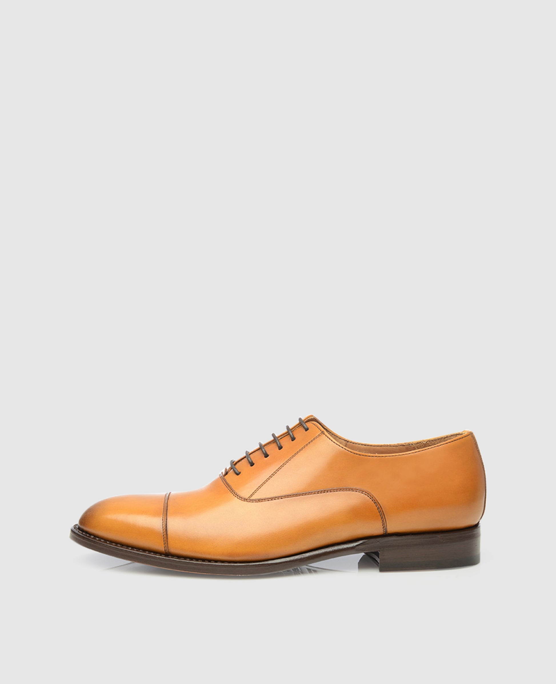 Our No. 549 is a cap-toe Oxford in cognac. Widely known black Oxfords are the most famous and elegant men’s shoes in the world. The upper on this cap-toe Oxford, though made from soft French calf leather in cognac, nevertheless boasts the same class of its better-known cousin.
