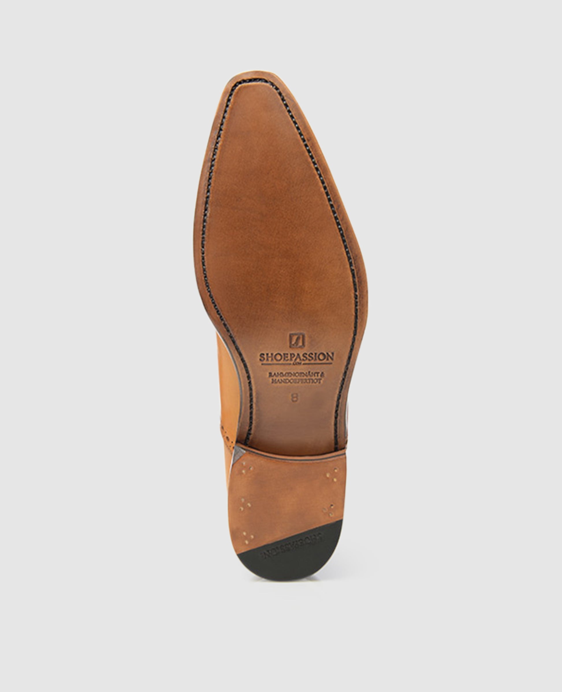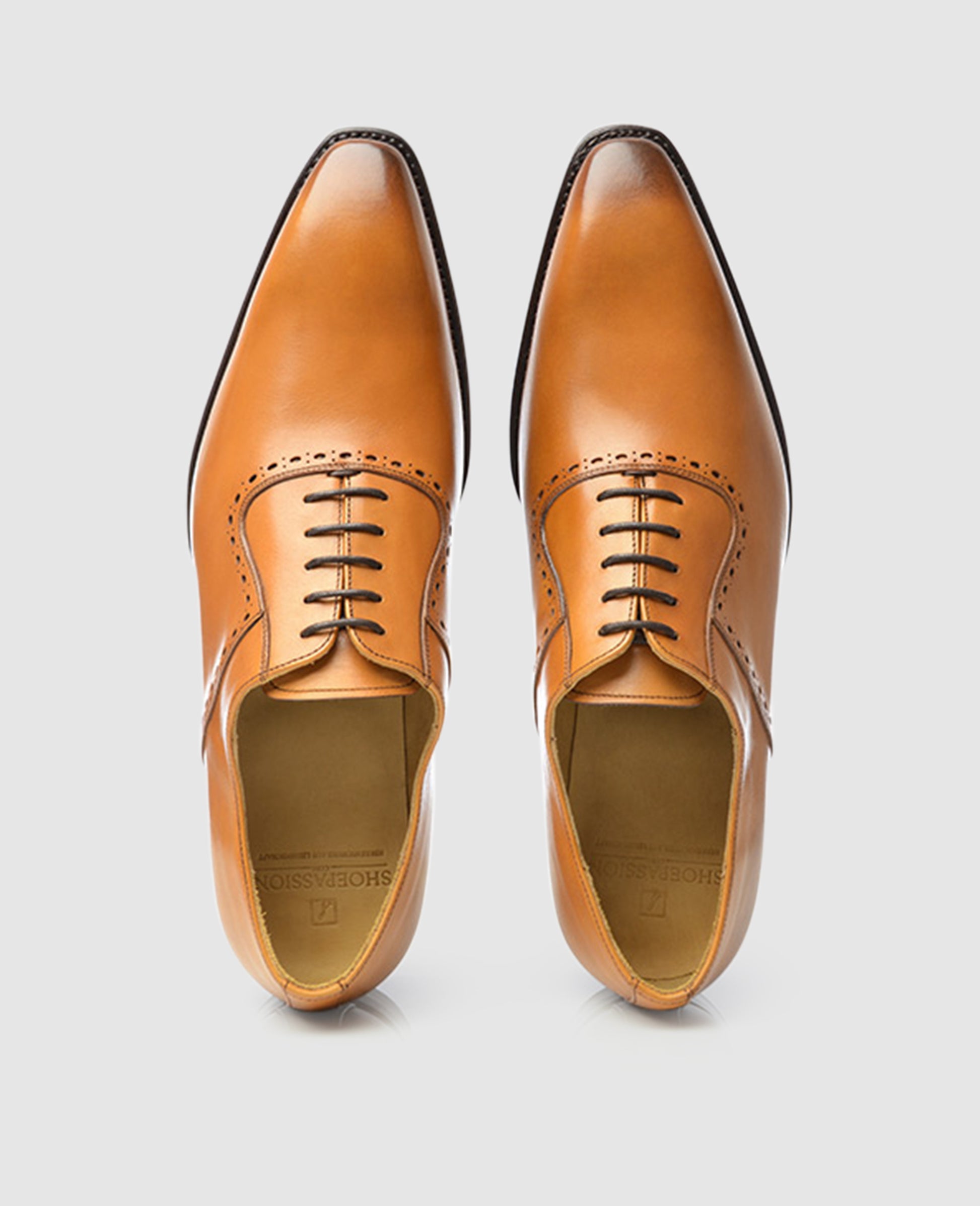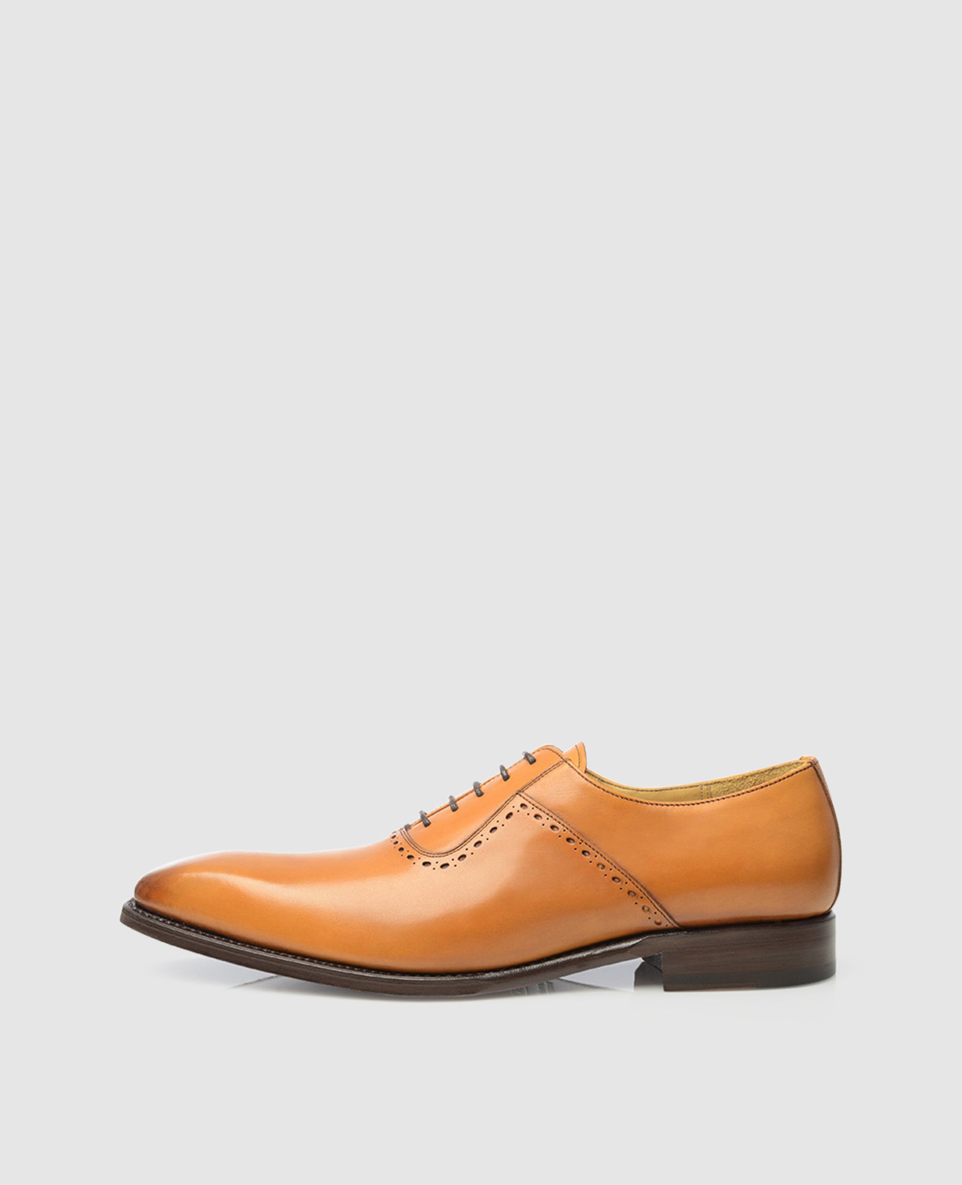 Goodyear-welted and handcrafted – our plain Oxford in cognac. These shoes are equipped with a closed five-hole lacing and fine brogueings along the seams, which accentuates the leather upper’s lines. The traditional antique finish and the small running-shoe last round off the modern, but elegant look.
