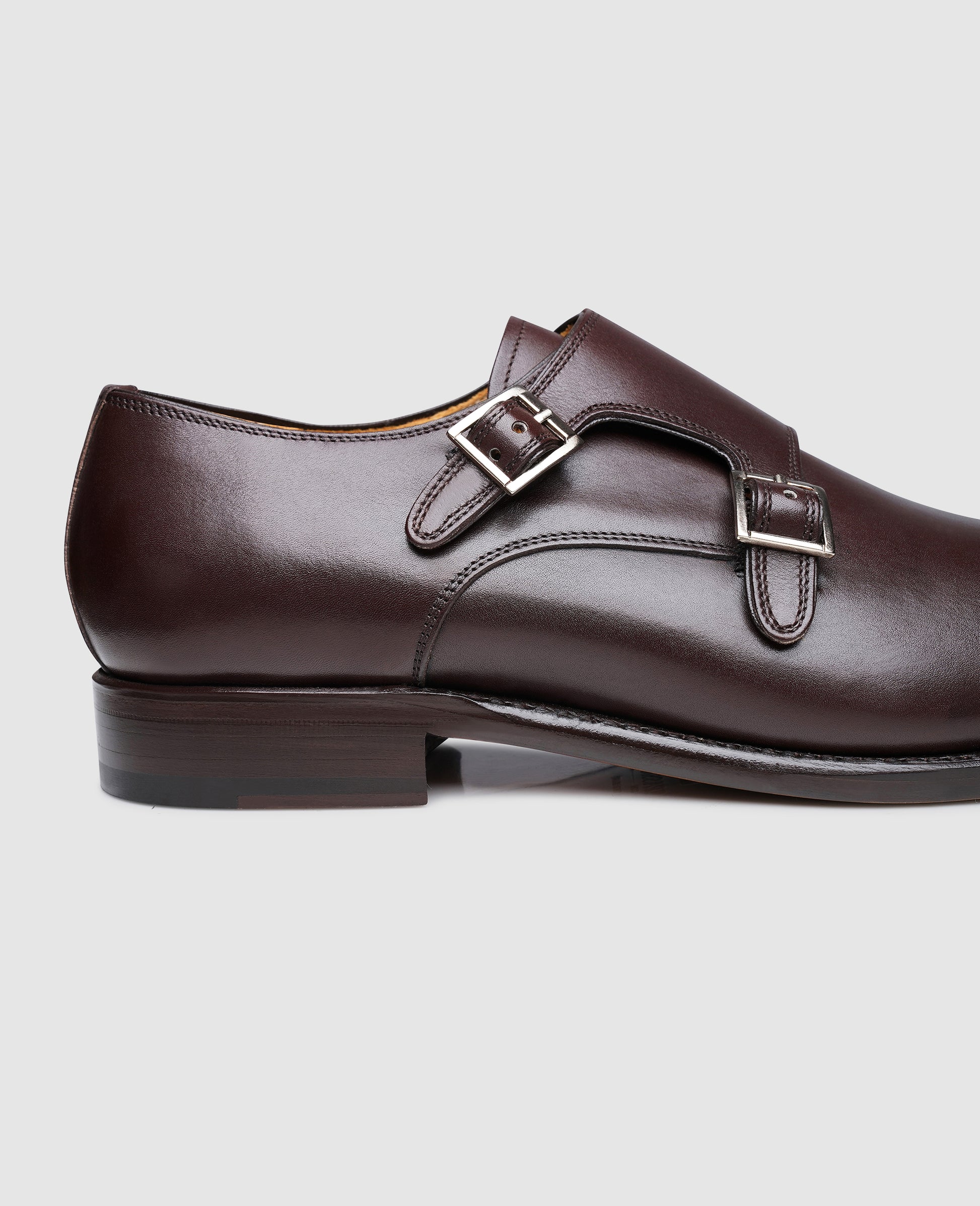 Allow us to introduce our dark brown double monk strap shoe to you. Instead of a traditional eyelet lacing this shoe type is characterised by two decorative buckles fastened on the side. Together with the broad leather strap, these two buckles form an exciting contrast to the wing cap, equipped with a stitched double seam. At the front, a smooth and shiny cap-toe, in the middle part, two shiny silver buckles.