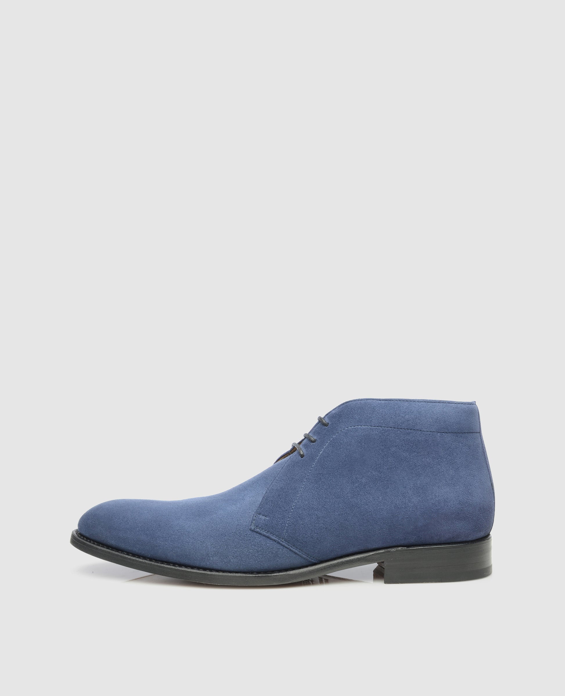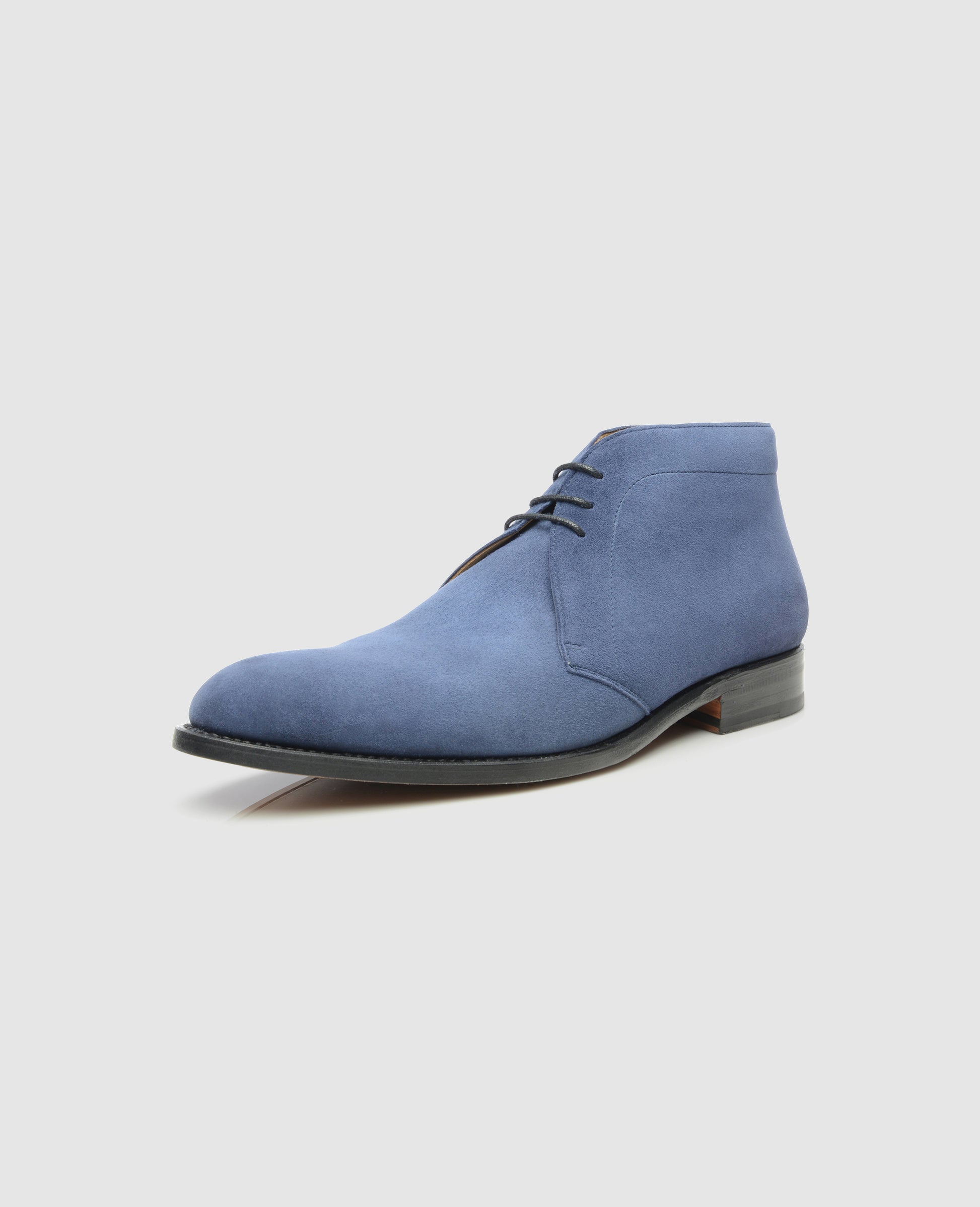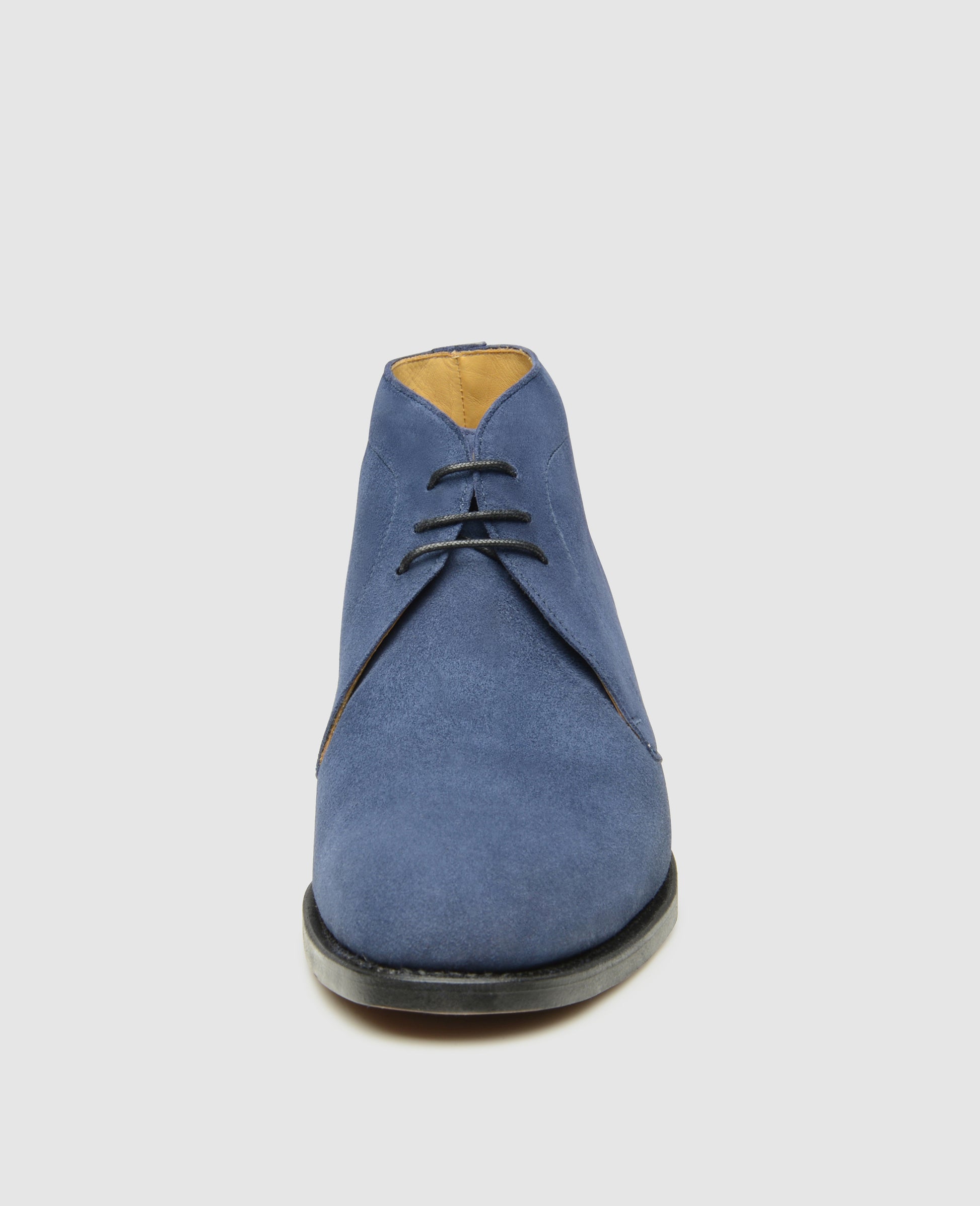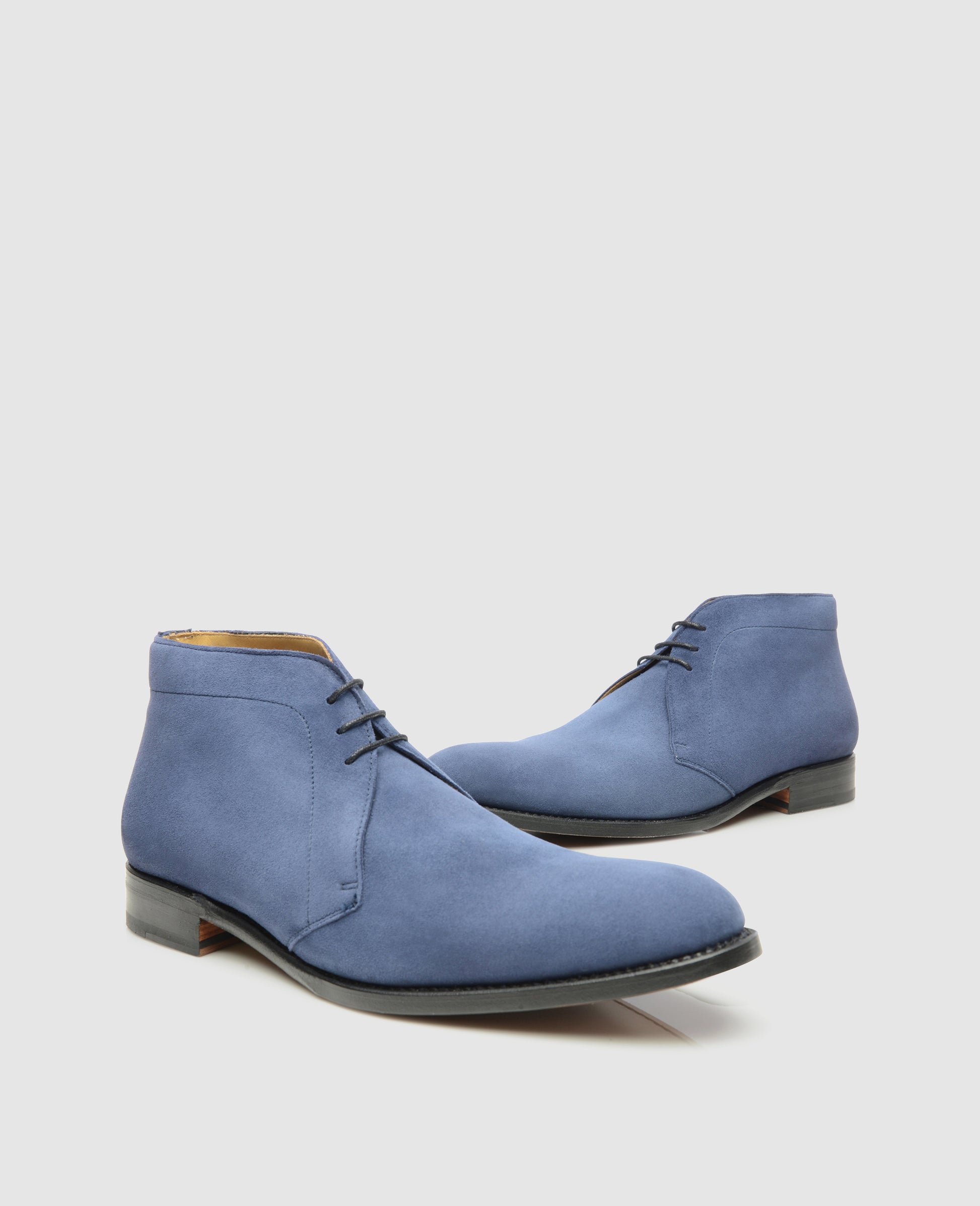 Our No. 604 is a blue suede boot, made of finest velours leather. Crafted in the traditional Goodyear-welting method this chukka boot is equipped with three-eyelet tabs. Normally these special men’s boots have a crepe rubber sole, ours is made of high-quality leather as well. The dynamic design enhances the flexible and comfortable character of our blue suede boot.