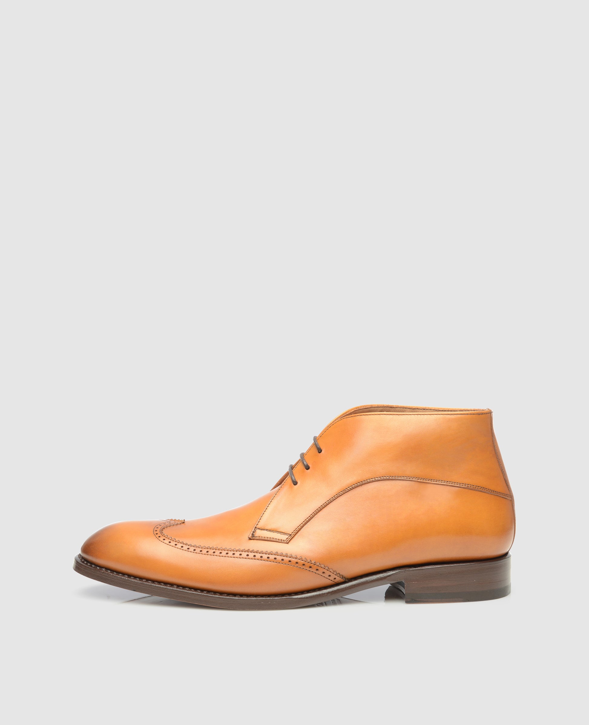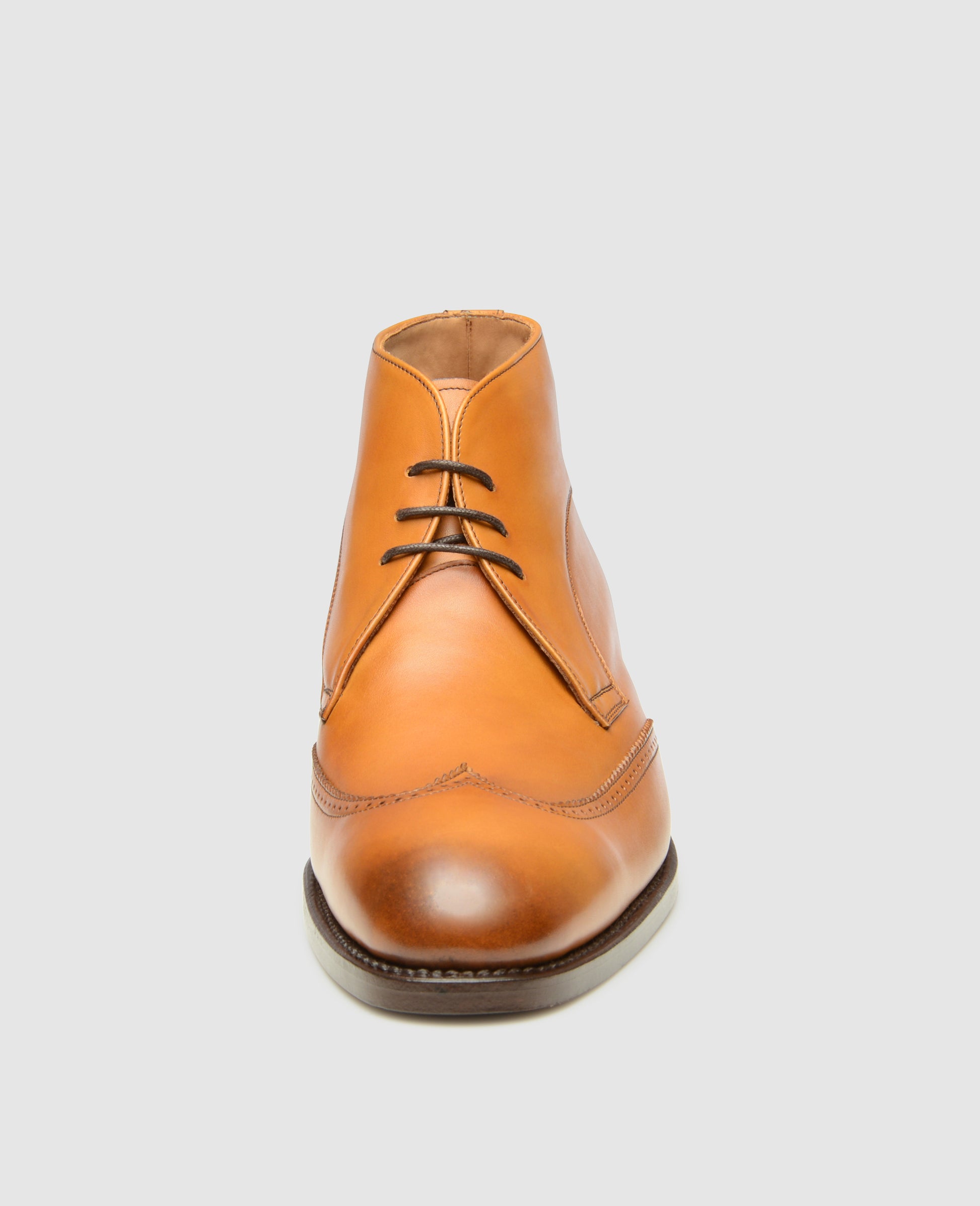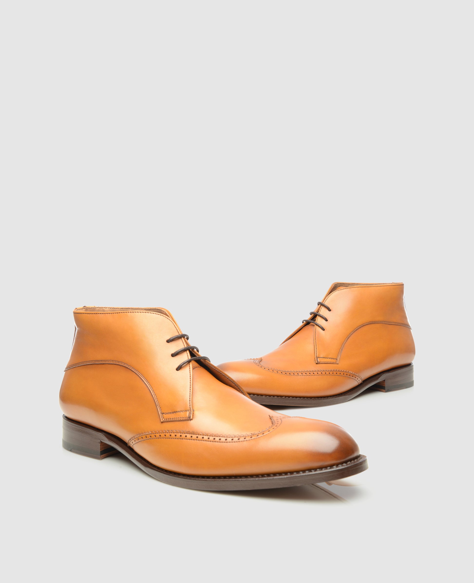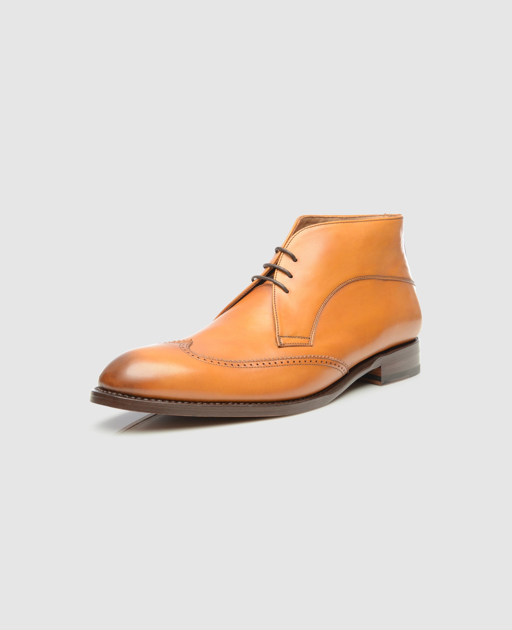 Our elegant George Boots in cognac are Goodyear-welted, following one of the oldest methods of shoe manufacture still used today. These men shoes are equipped with a wingtip, which is decorated with a lyra-perforation. The traditional Derby style with an open three-eyelet lacing guarantees high comfort and releases the instep, too.