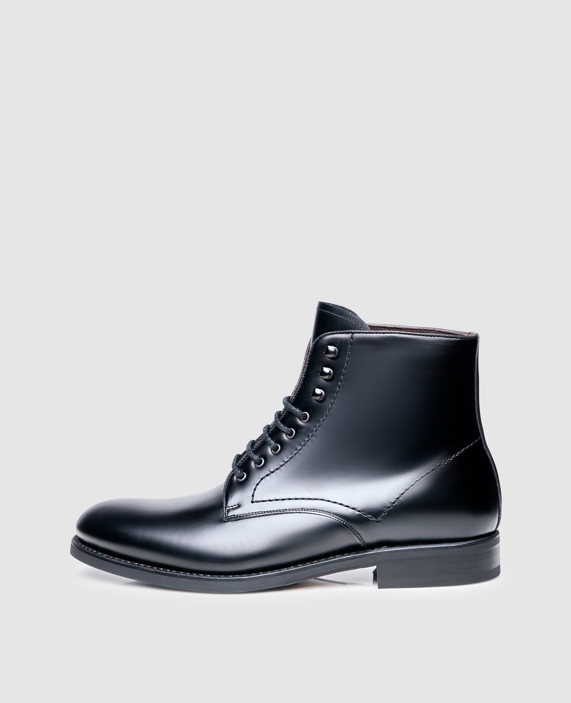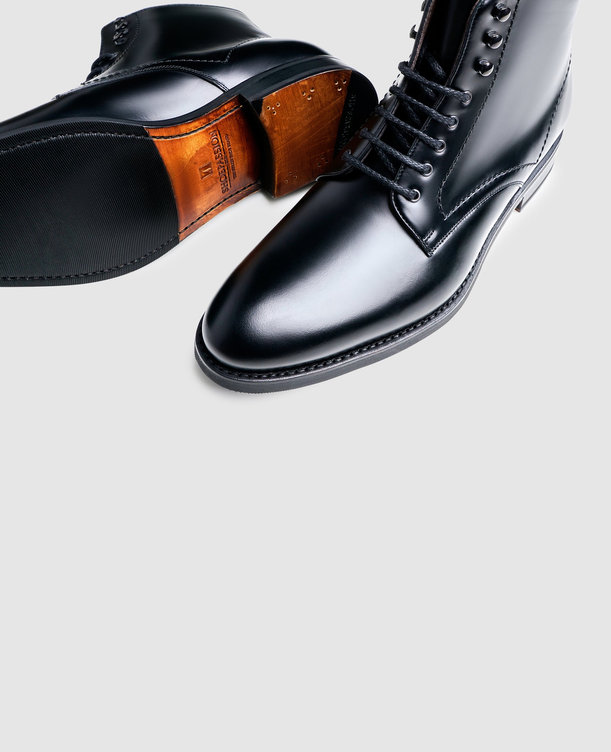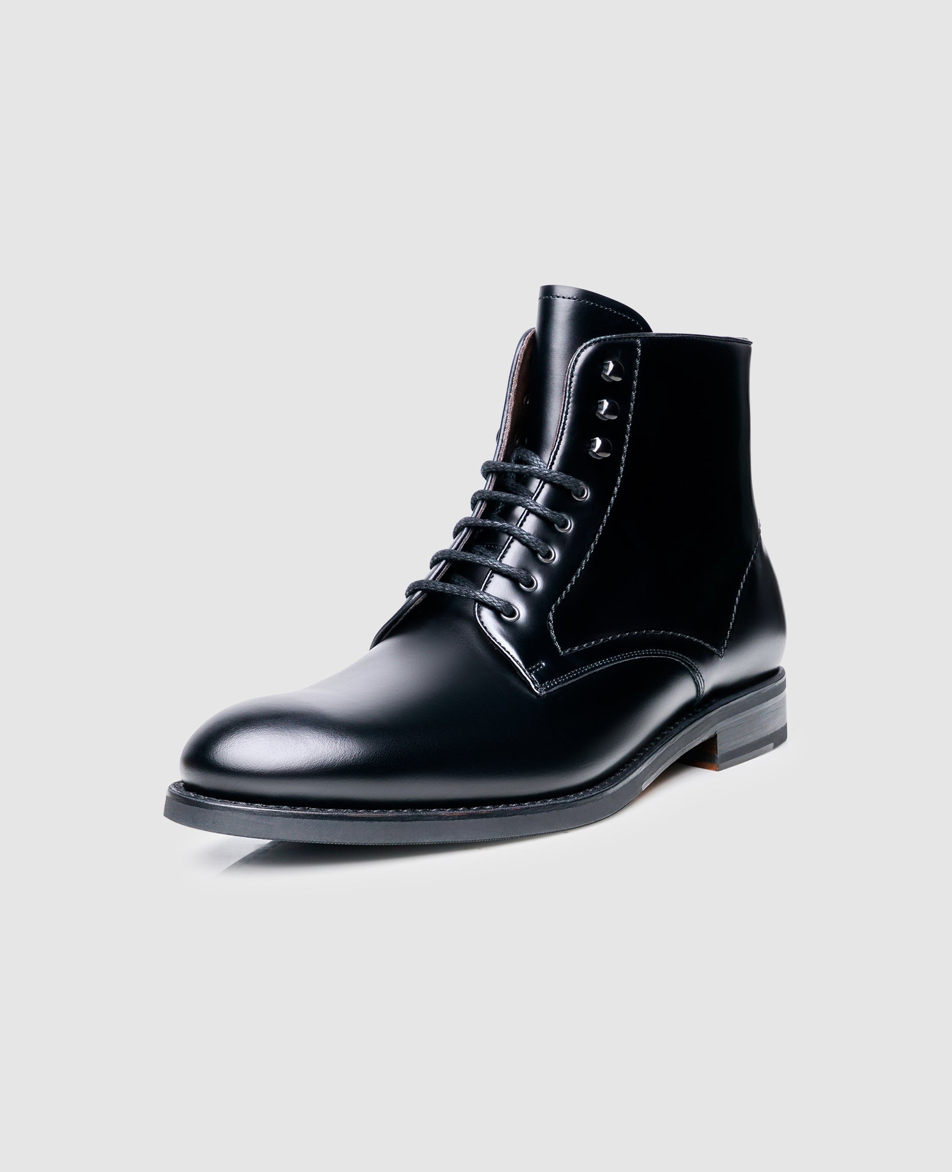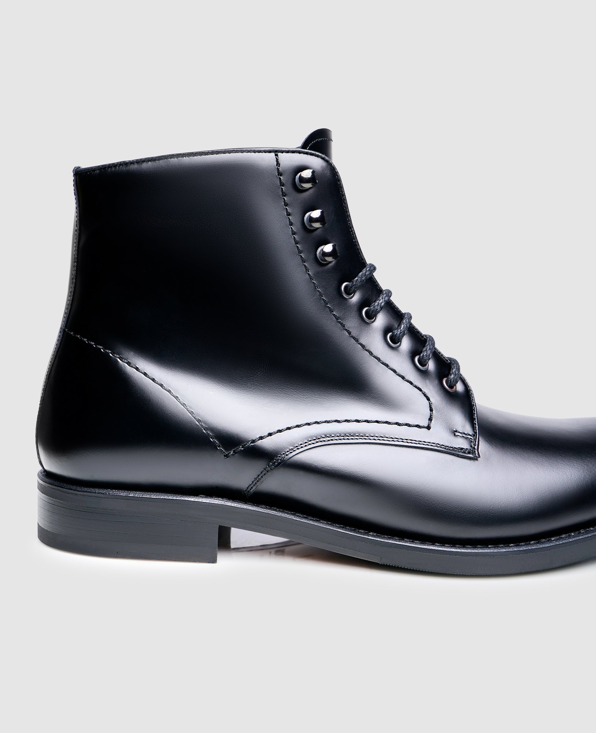 This Derby boot captivates with its glossy appearance and weatherproof construction. The distinctive base cut of the shaft is accentuated by the open hook-and-eye lacing, while the brushed calfskin and rubber outsole with its small leather insert also promise durability from a practical point of view.