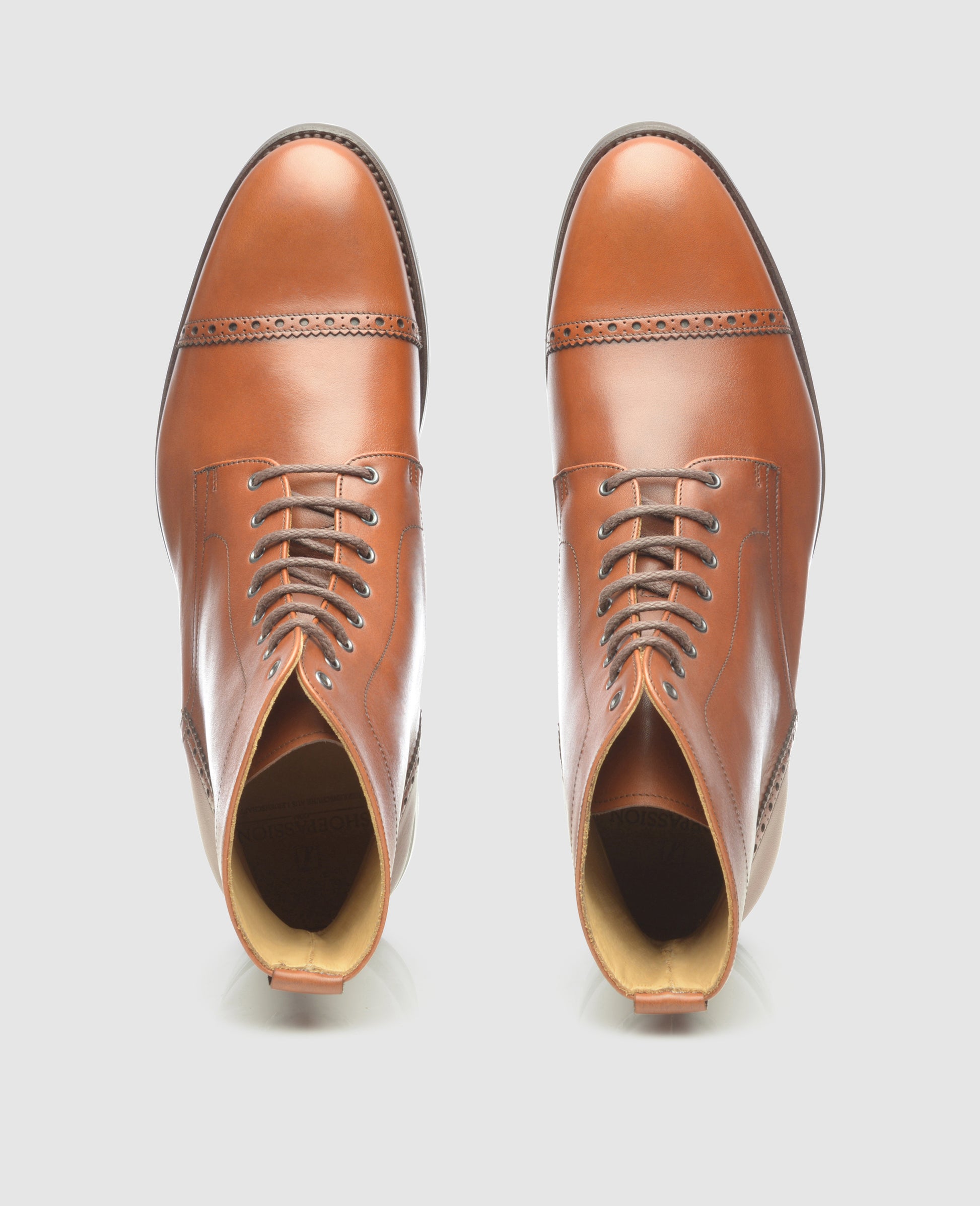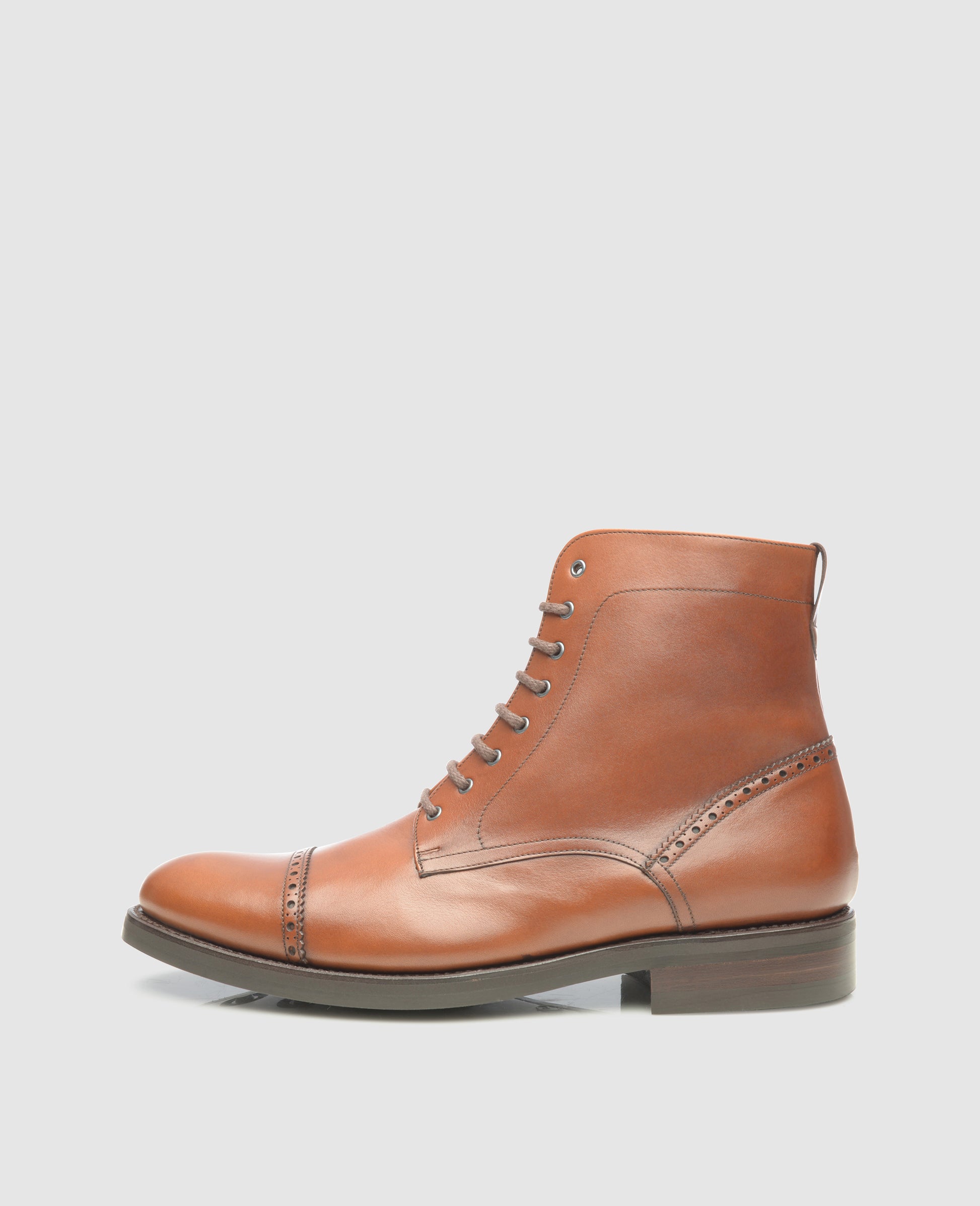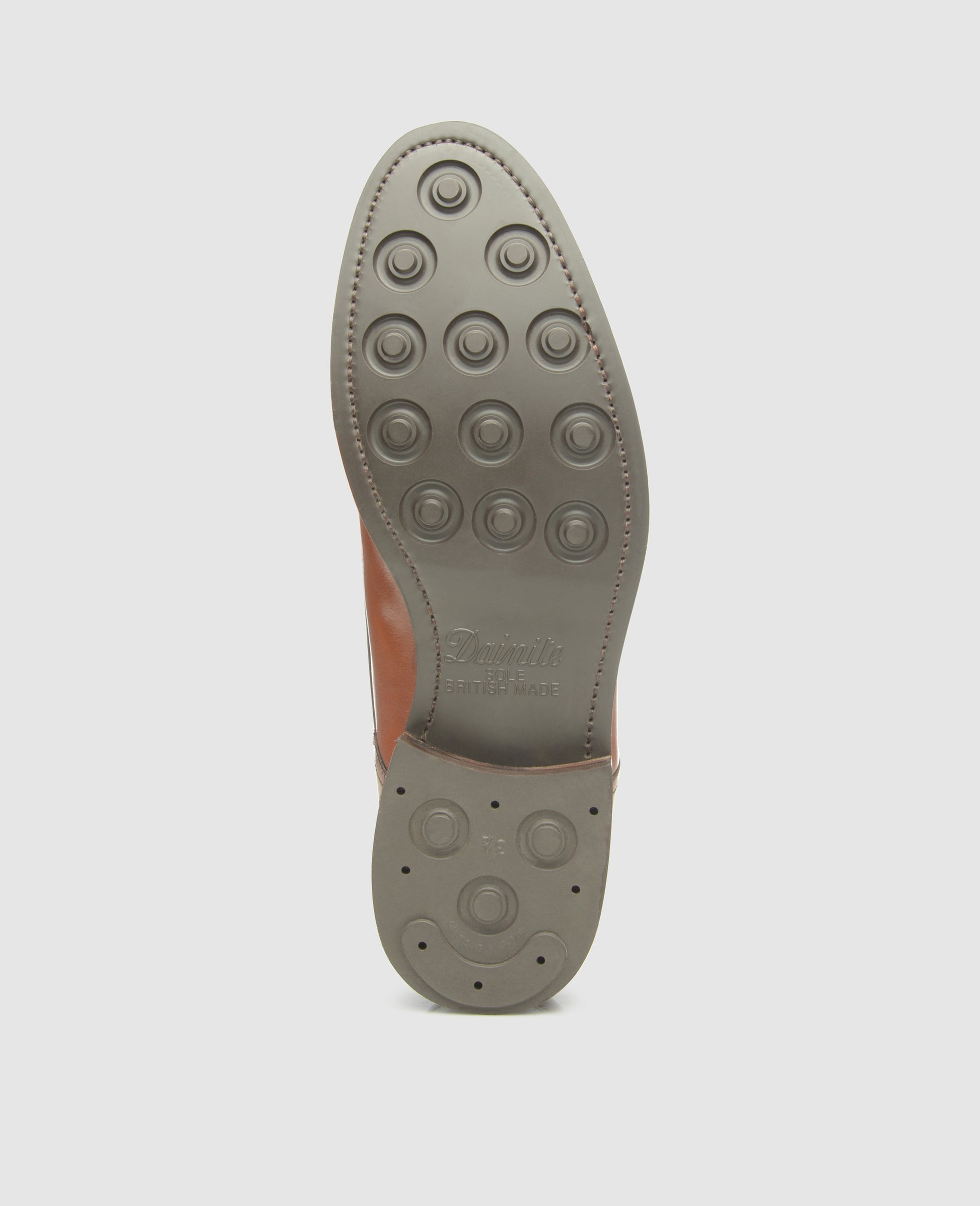This men’s boot boasts a stylish look and firm traction. Handcrafted and Goodyear-welted, this quarter-brogue Derby boot in red-brown is fitted with a discreet Dainite rubber sole. Dainite soles are internationally renowned—they look just like leather soles when viewed from the side, and provide extremely good traction, especially in cold and wet conditions.