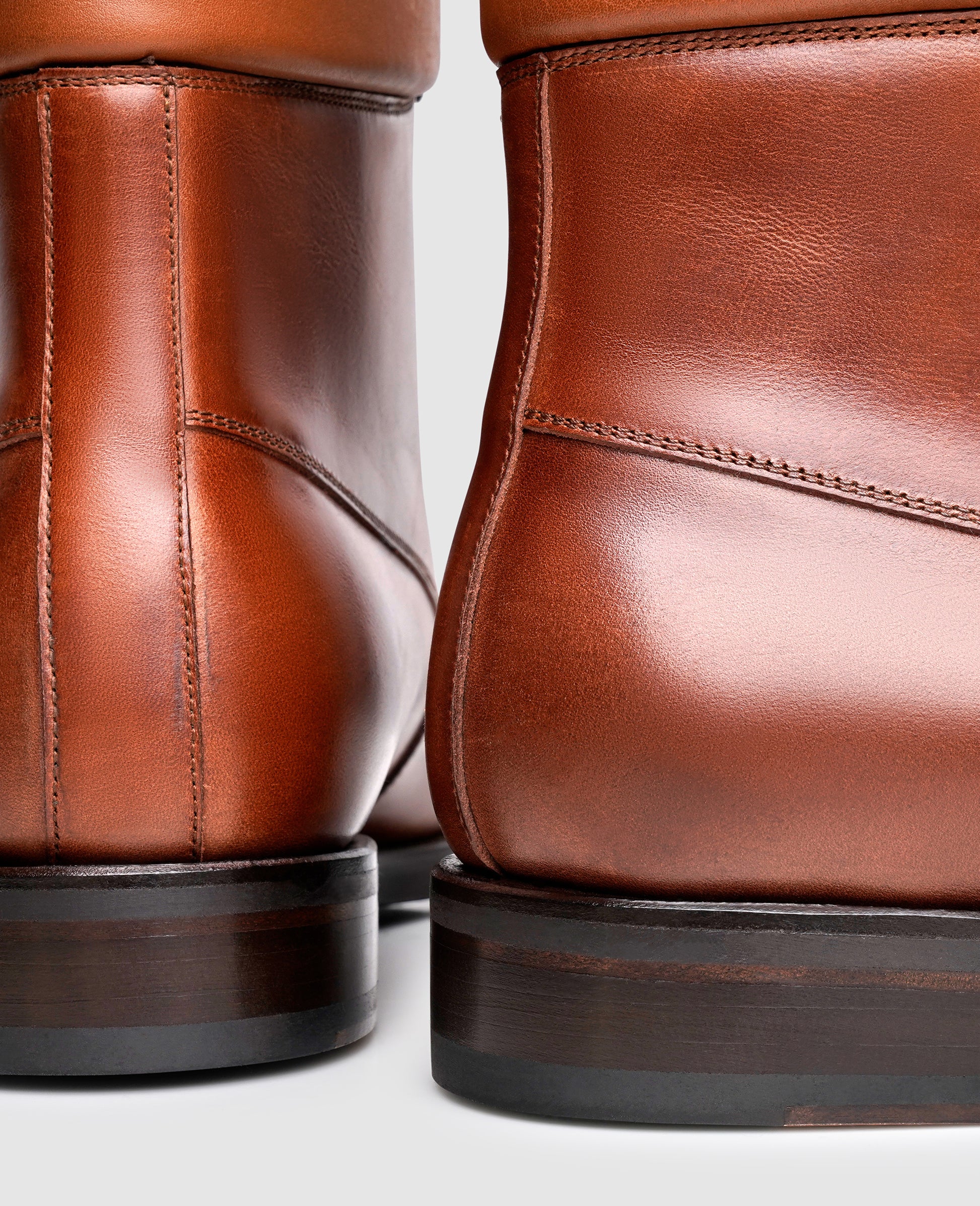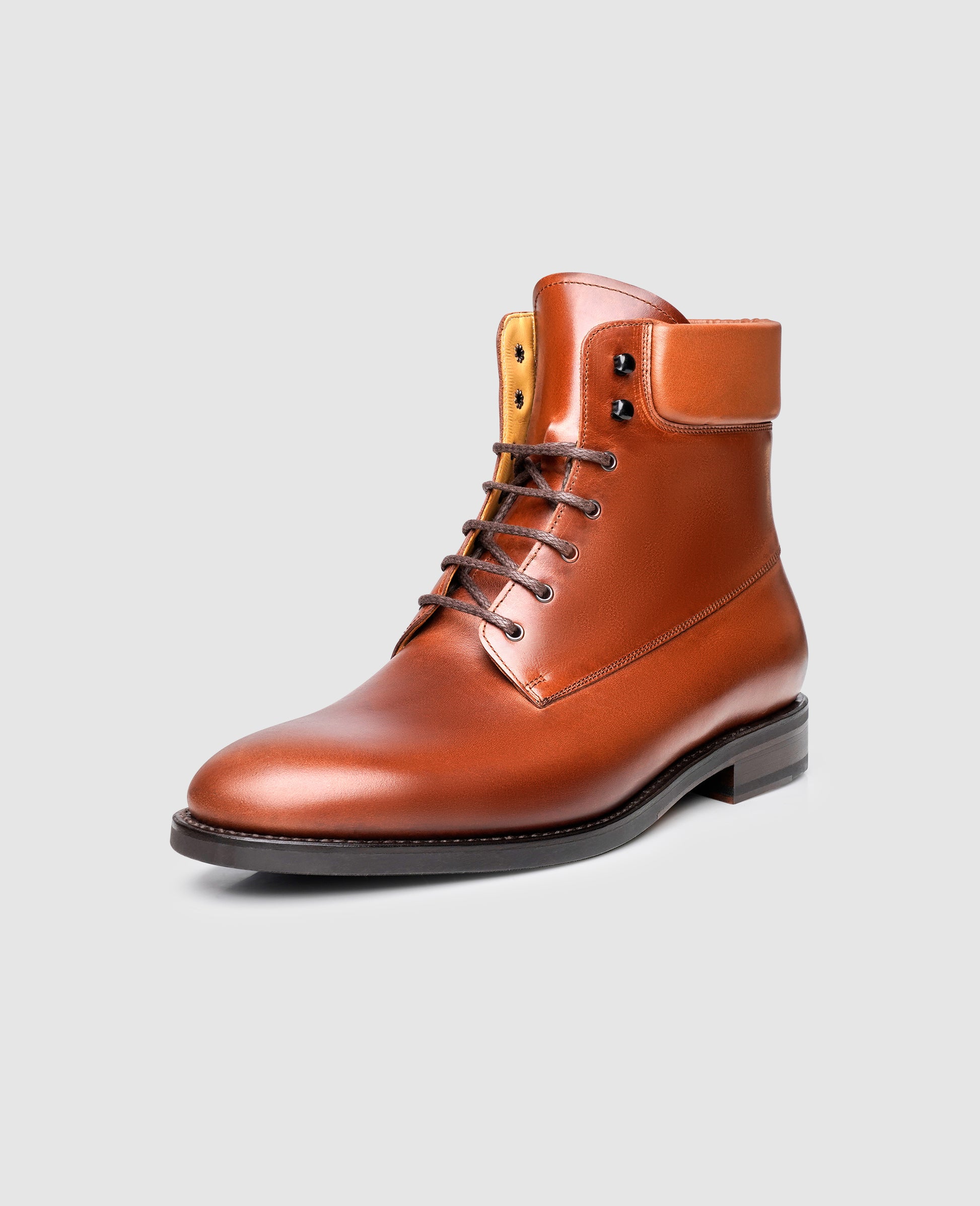 This model combines a tasteful visual appearance with weather-resistant qualities. The Box Calf used has been treated with oil to increase its resistance to moisture. The rubber outsole with its leather insert offers a secure grip on wet surfaces. The padded opening at the top of the shaft, as well as the high reaching hook-eye combination, are also characteristic features.