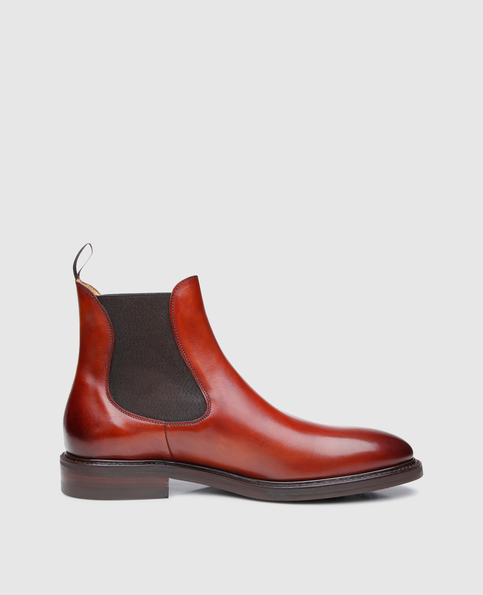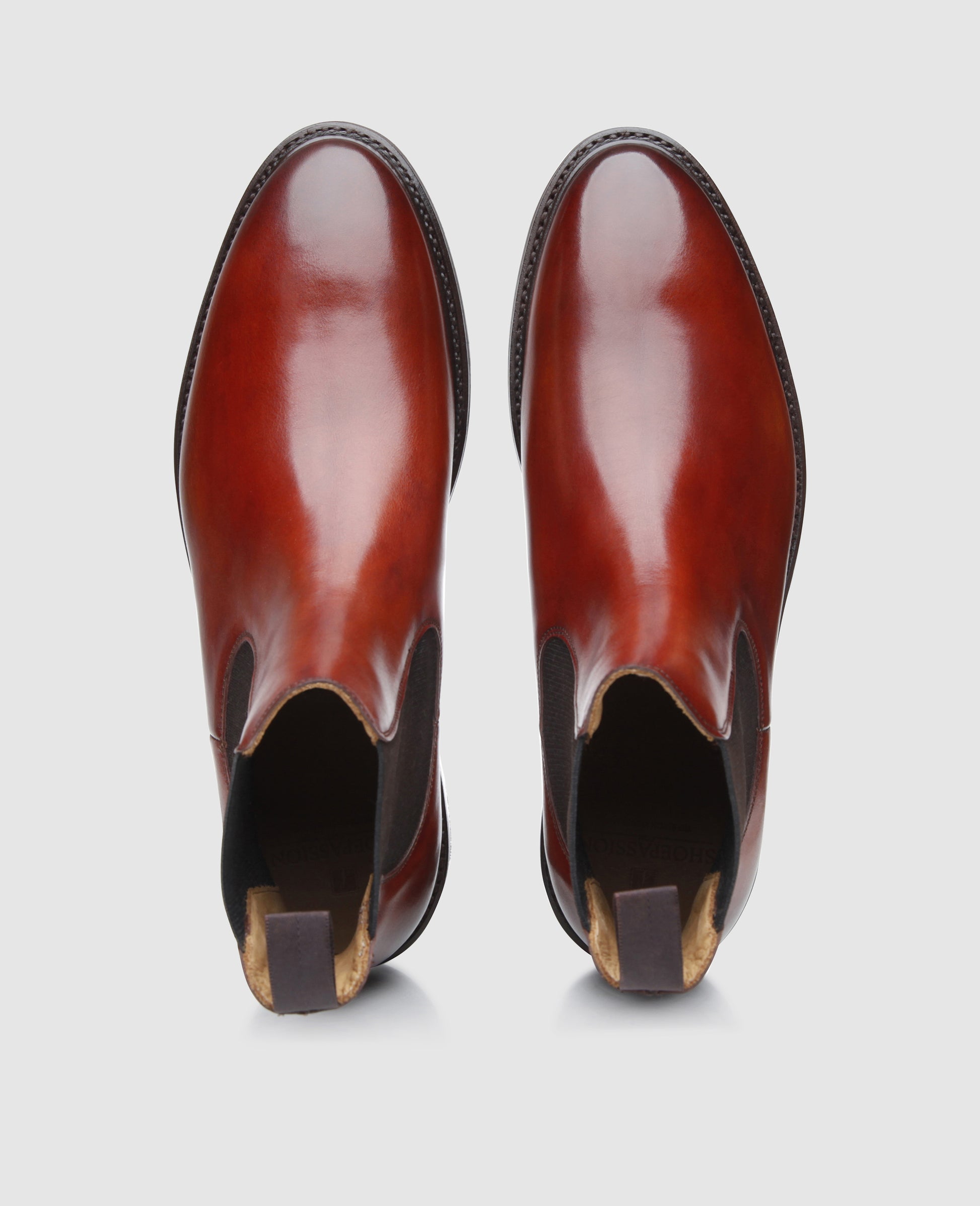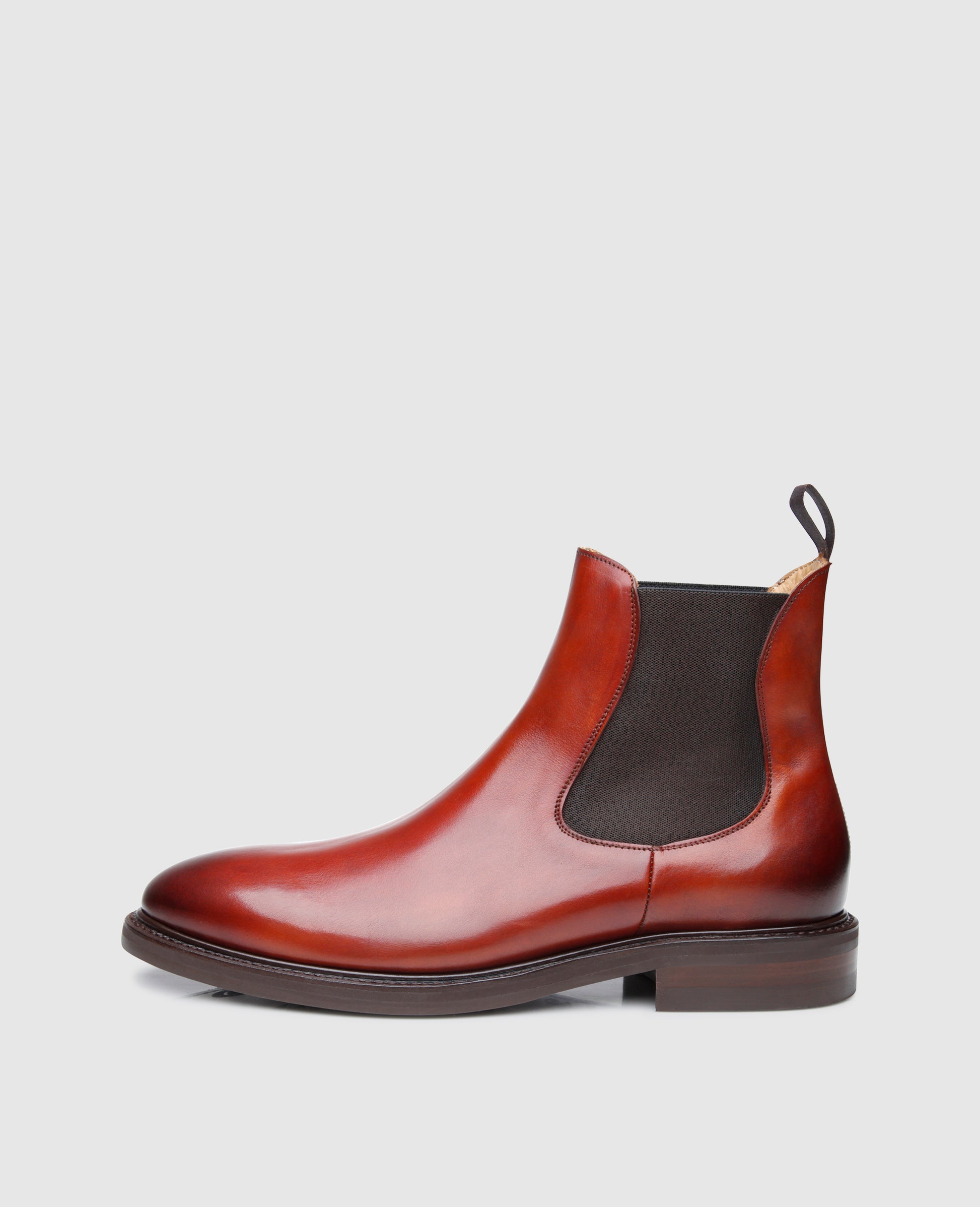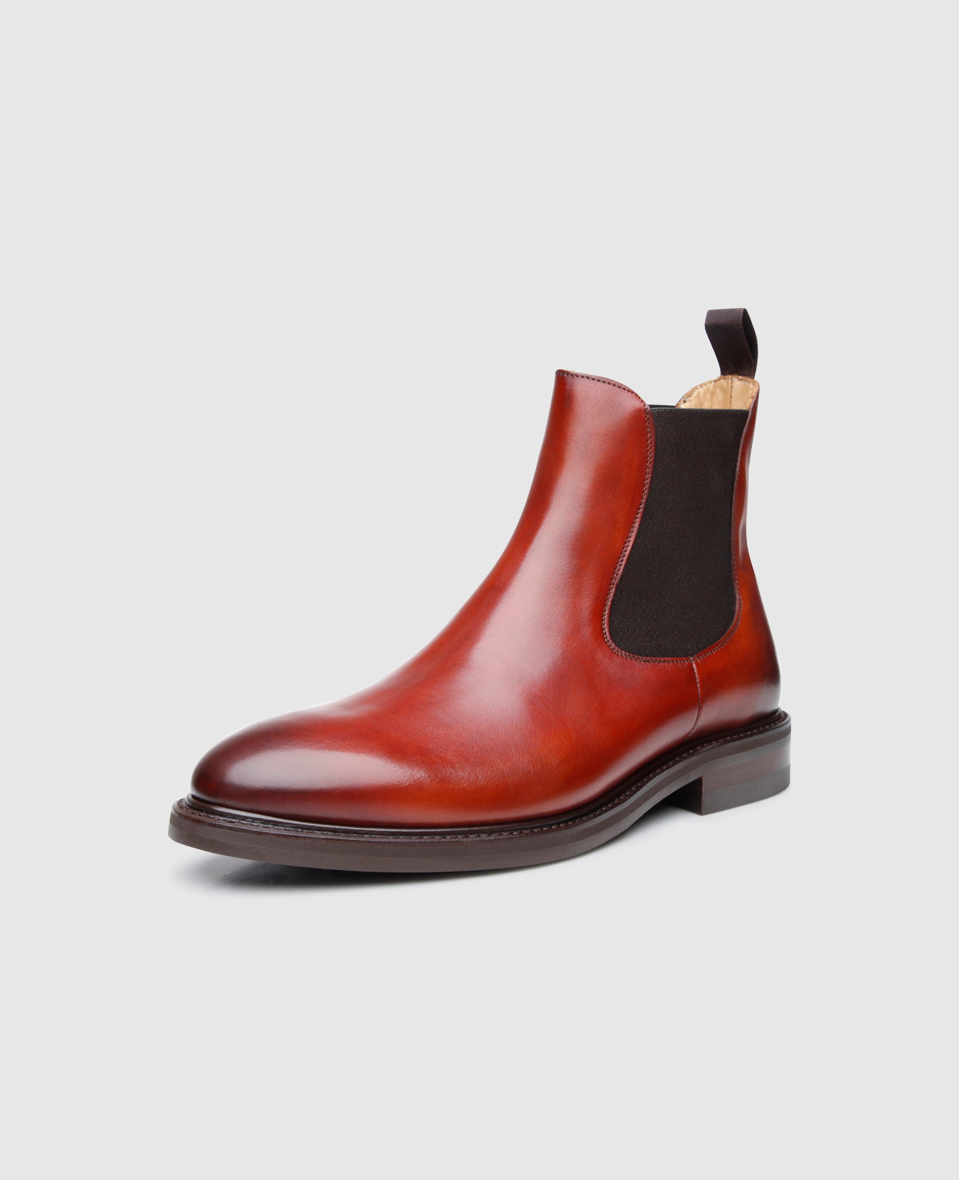 Although it remains faithful to the typical shaft of the classic Chelsea boot, No. 645 ups the ante with a more modern design. The upper section of this shoe is crafted from supple, vegetable-tanned soft calf. This process results in a fascinatingly intense level of coloring, as seen in the saturated brandy tone of the upper, and also allows for both exciting light and dark shadows as well as an impressive gloss. Both are the result of a masterful hand finish, which is added to the leather in the final step of the manufacturing process.