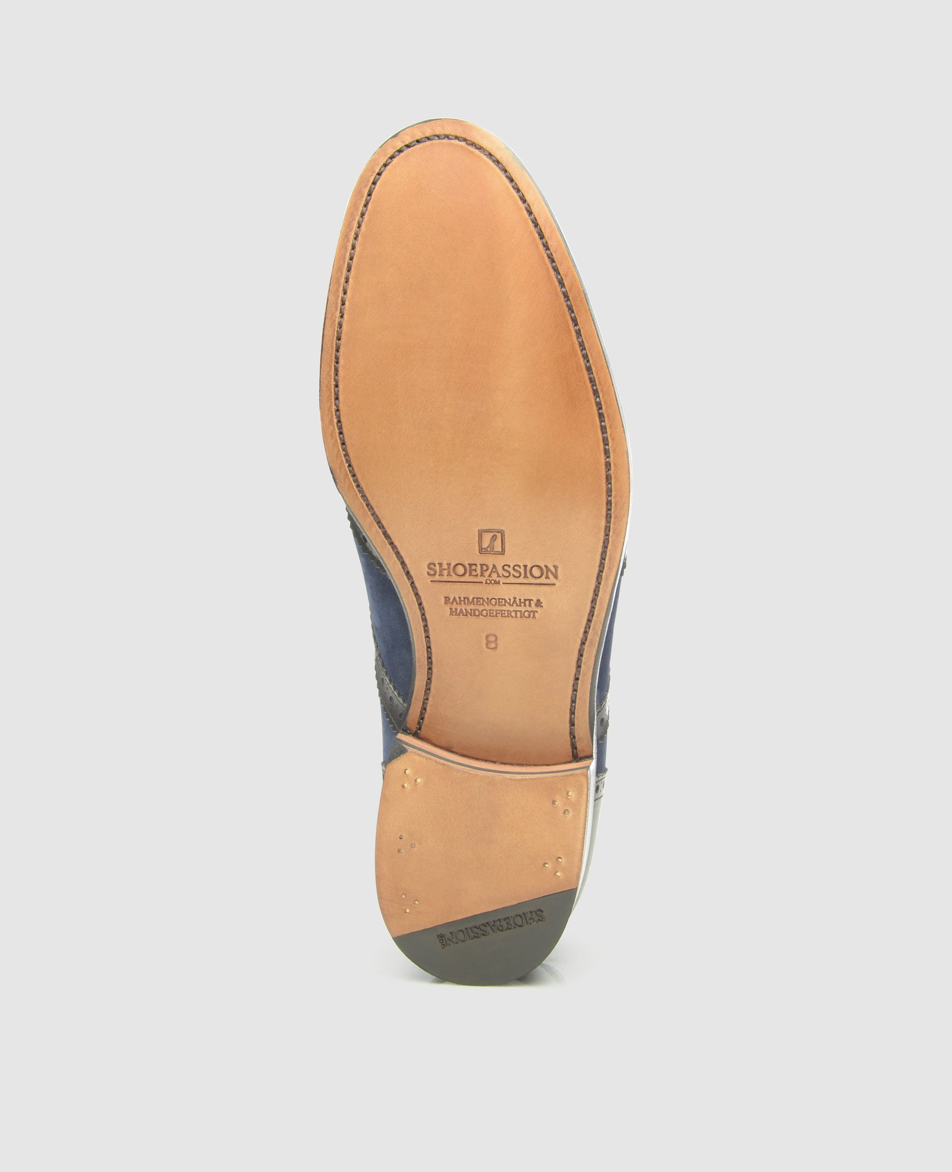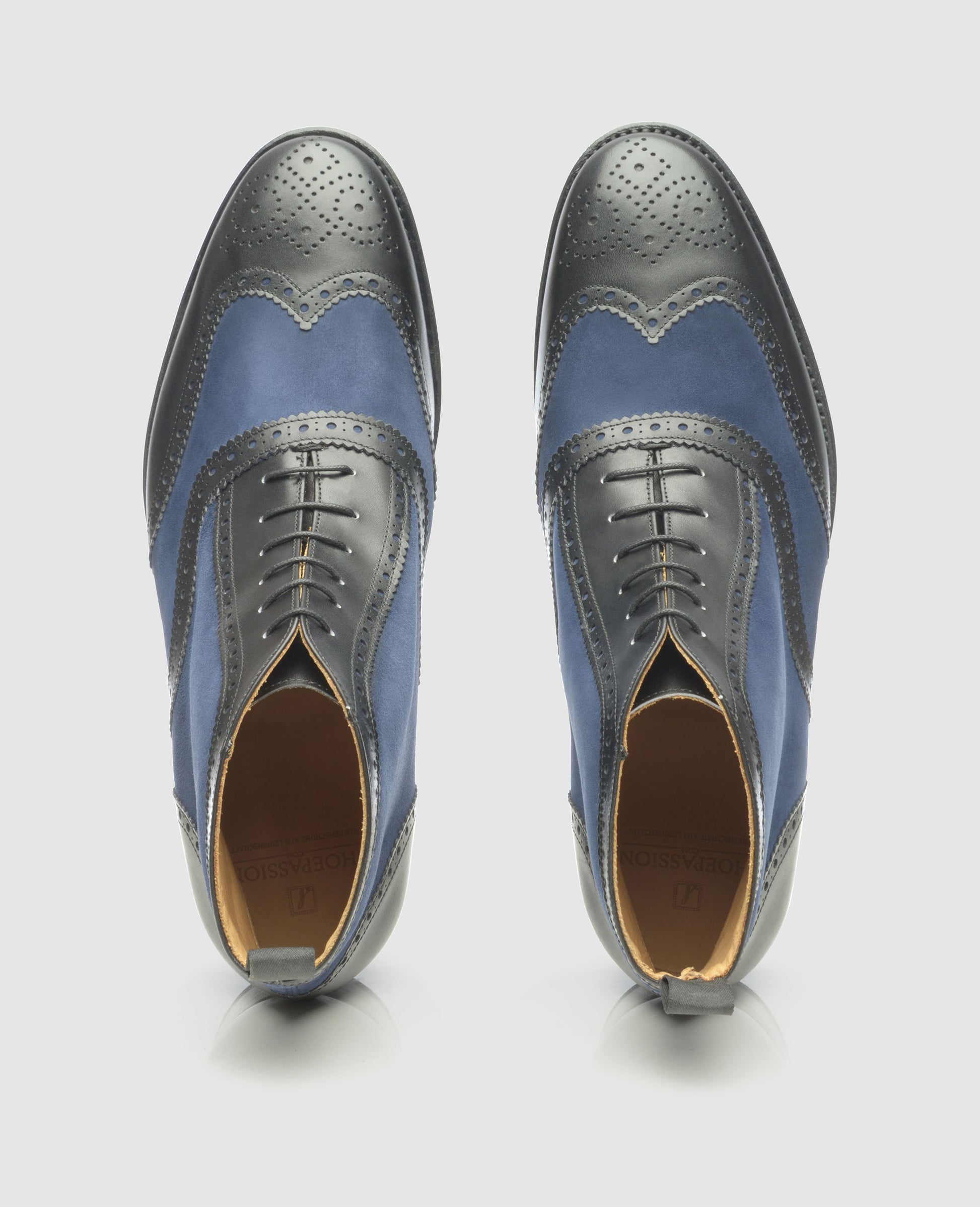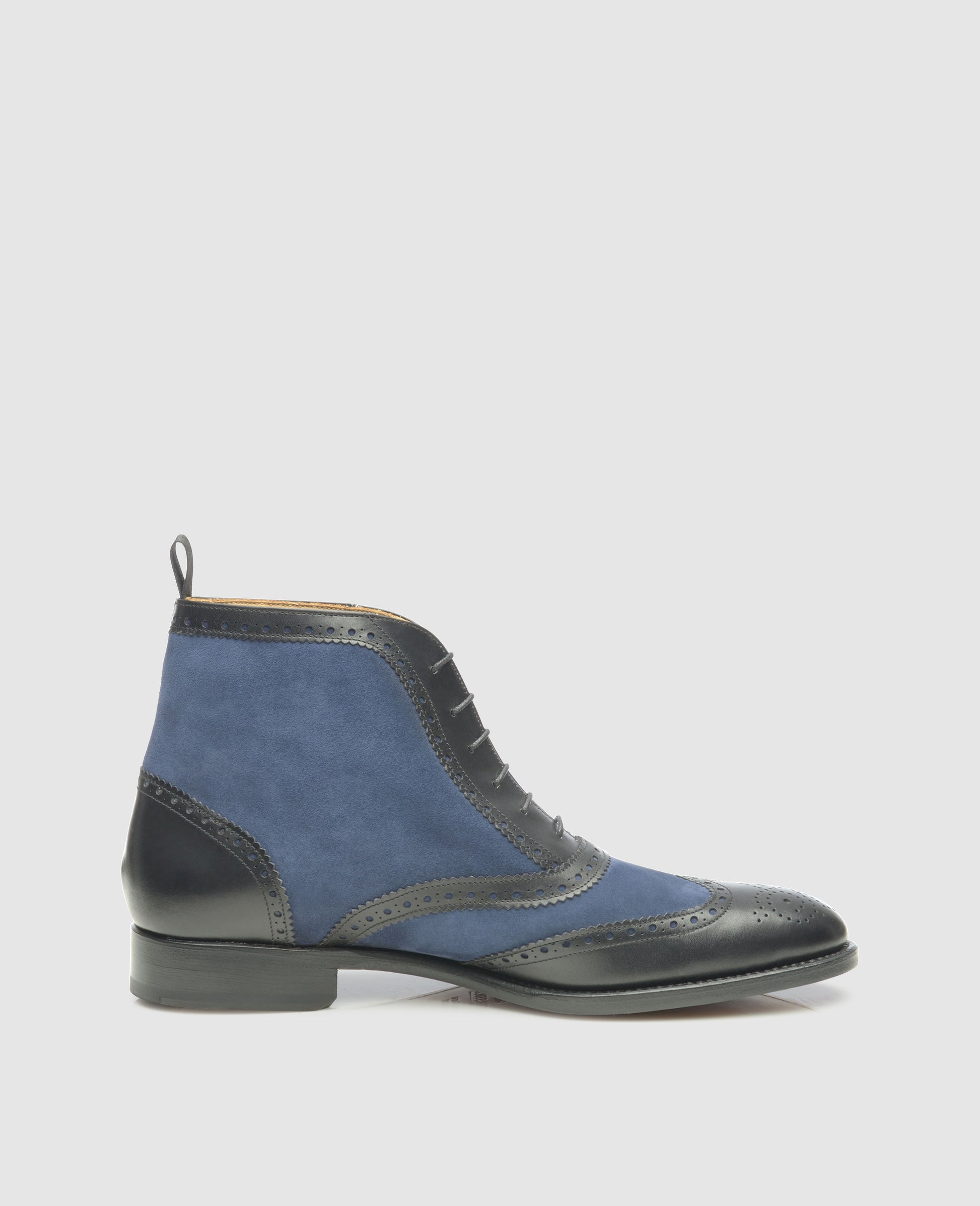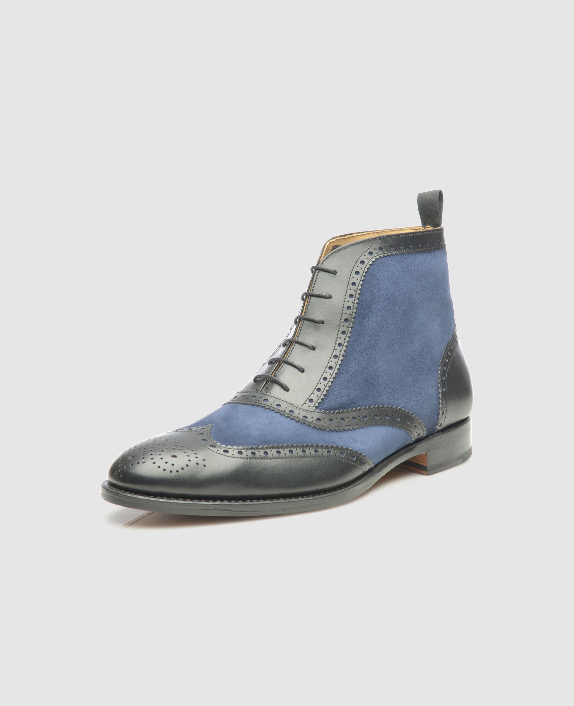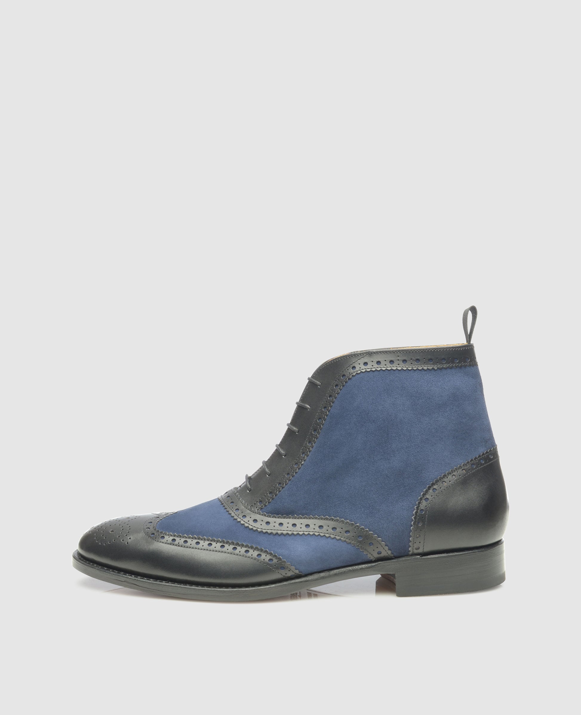In terms of its basic shaft cut, No. 651 is a Goodyear-welted, two-tone Oxford boot in dark blue and black. The shaft of this lace-up boot extends significantly higher than that of its low-rise counterpart. This model also features closed six-eyelet lacing.