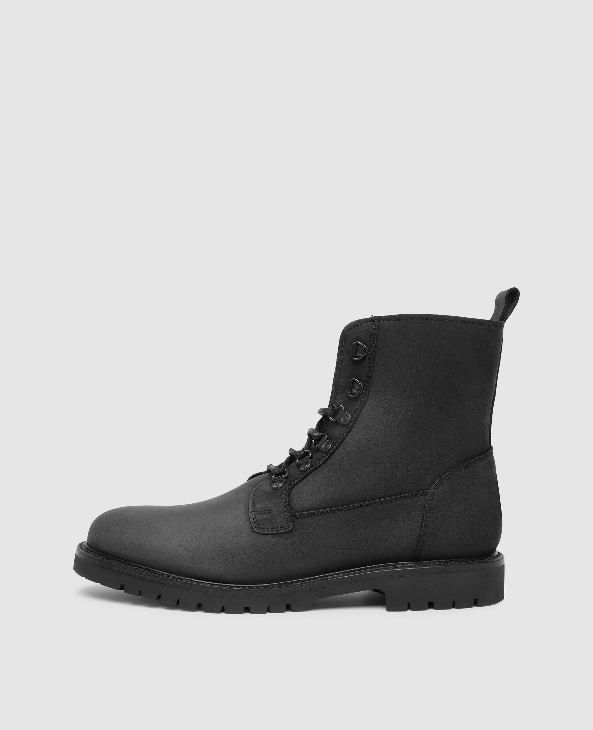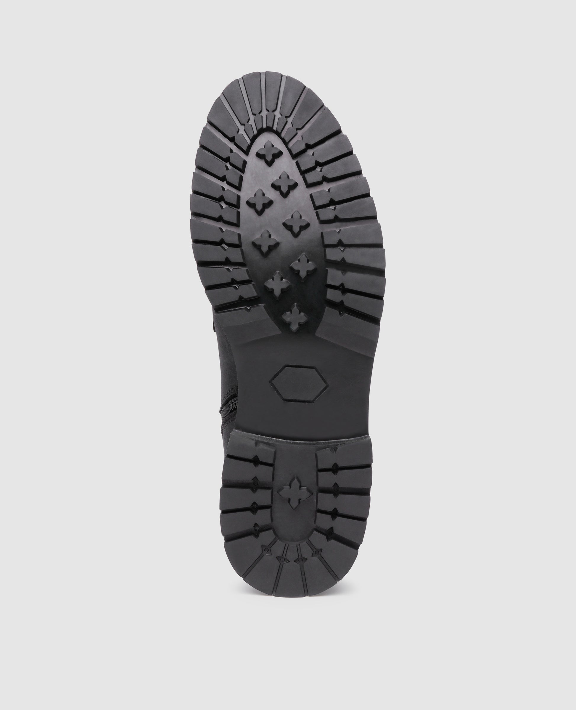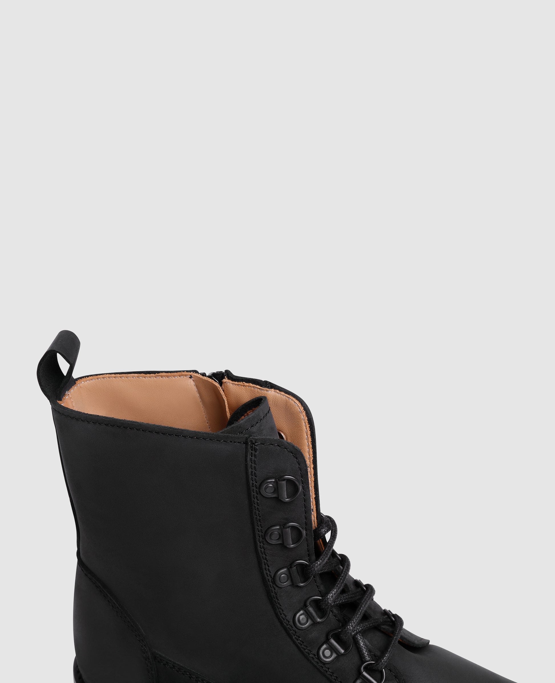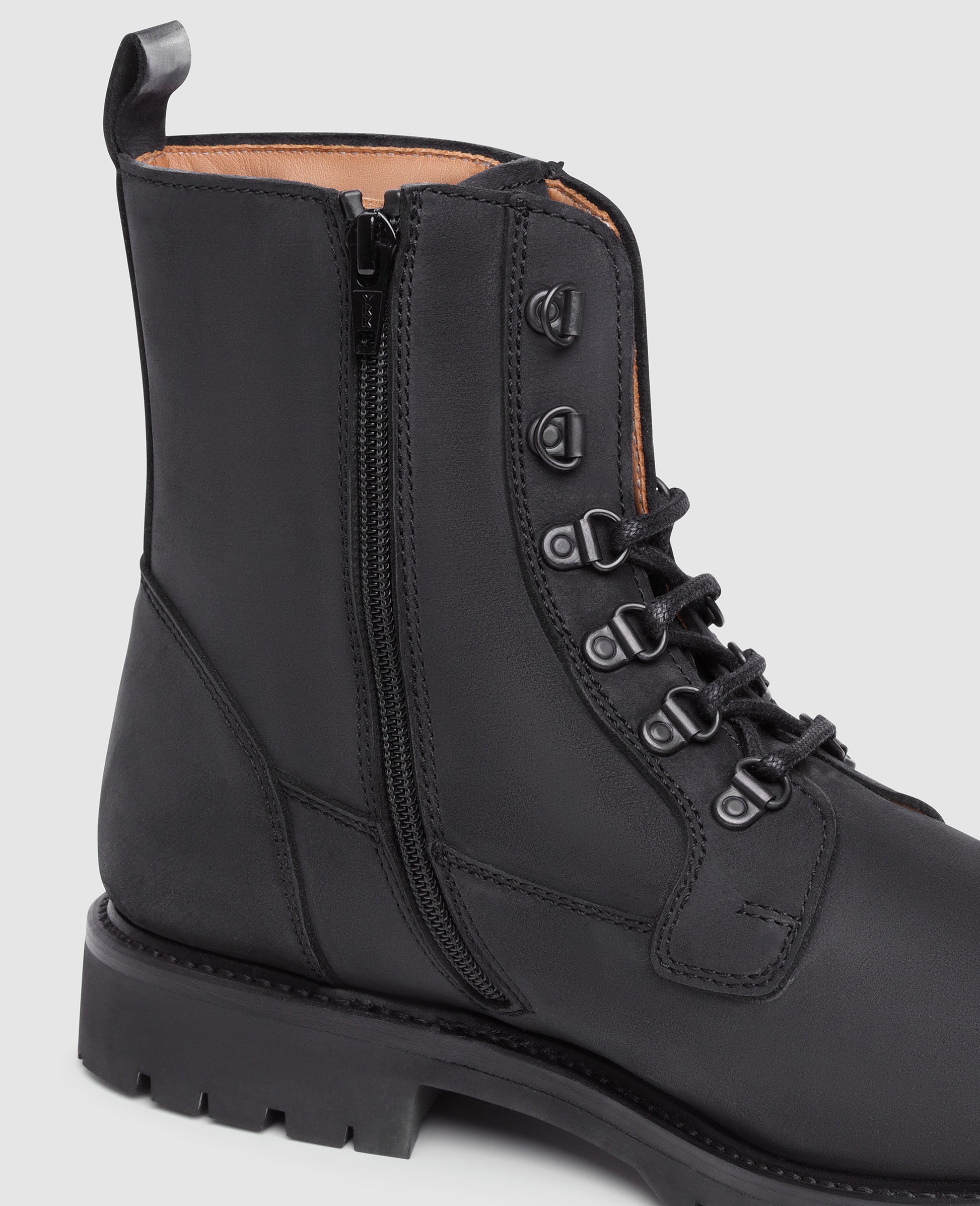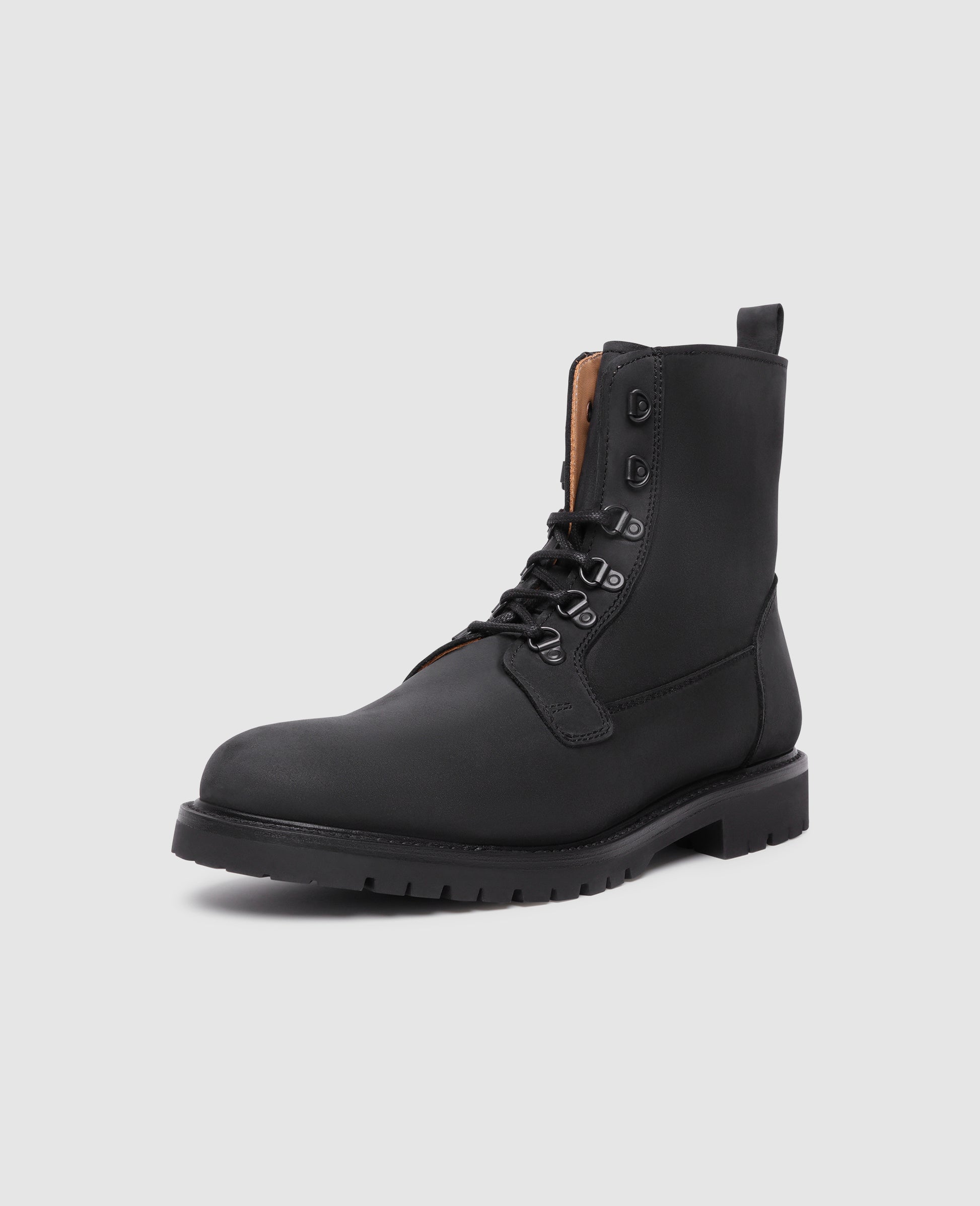 With its combination of modern design, comfort, and exquisite materials, our Goodyear-welted, handcrafted lace-up boot for men proves that weatherproof footwear can also still be visually appealing. This boot is characterized by its water-repellent nubuck leather and is further accentuated by striking D-ring lacing. The non-slip rubber lug tread rounds off a sporty appearance and ensures a firm footing on wet, snowy, and icy surfaces.