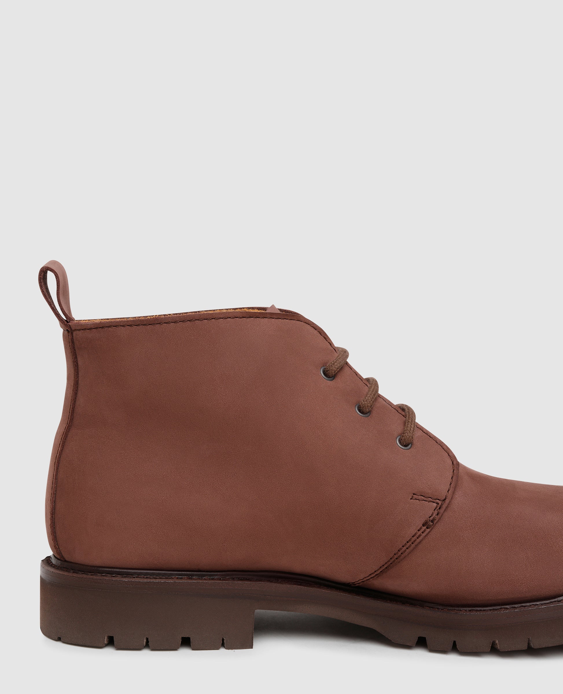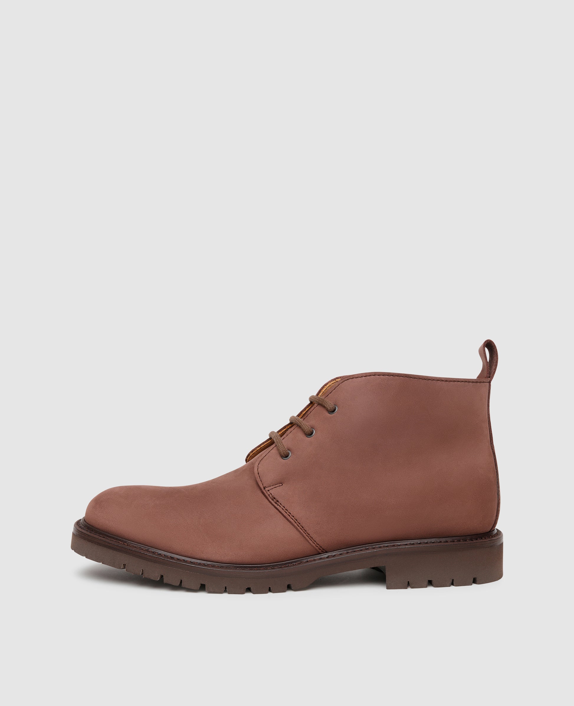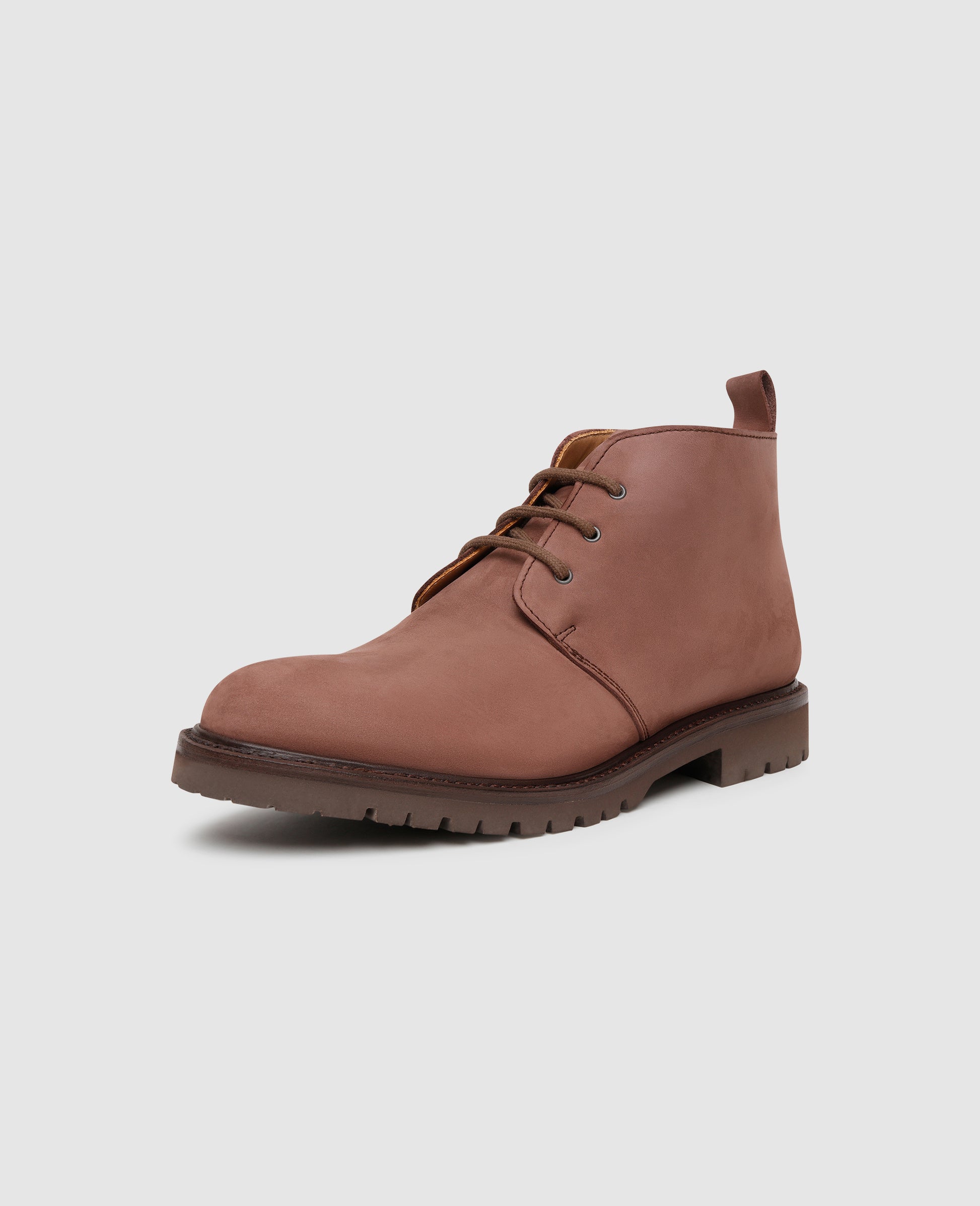 Weatherproof comfort and sophisticated looks are combined in our Goodyear-welted and handcrafted Chukka boot for men. The look of the water-repellent nubuck leather is gently relaxed by the open three-eyelet lacing, while a non-slip rubber lug tread and heat-retaining interior membrane allow Model No. 6625 to withstand even the most adverse weather conditions.