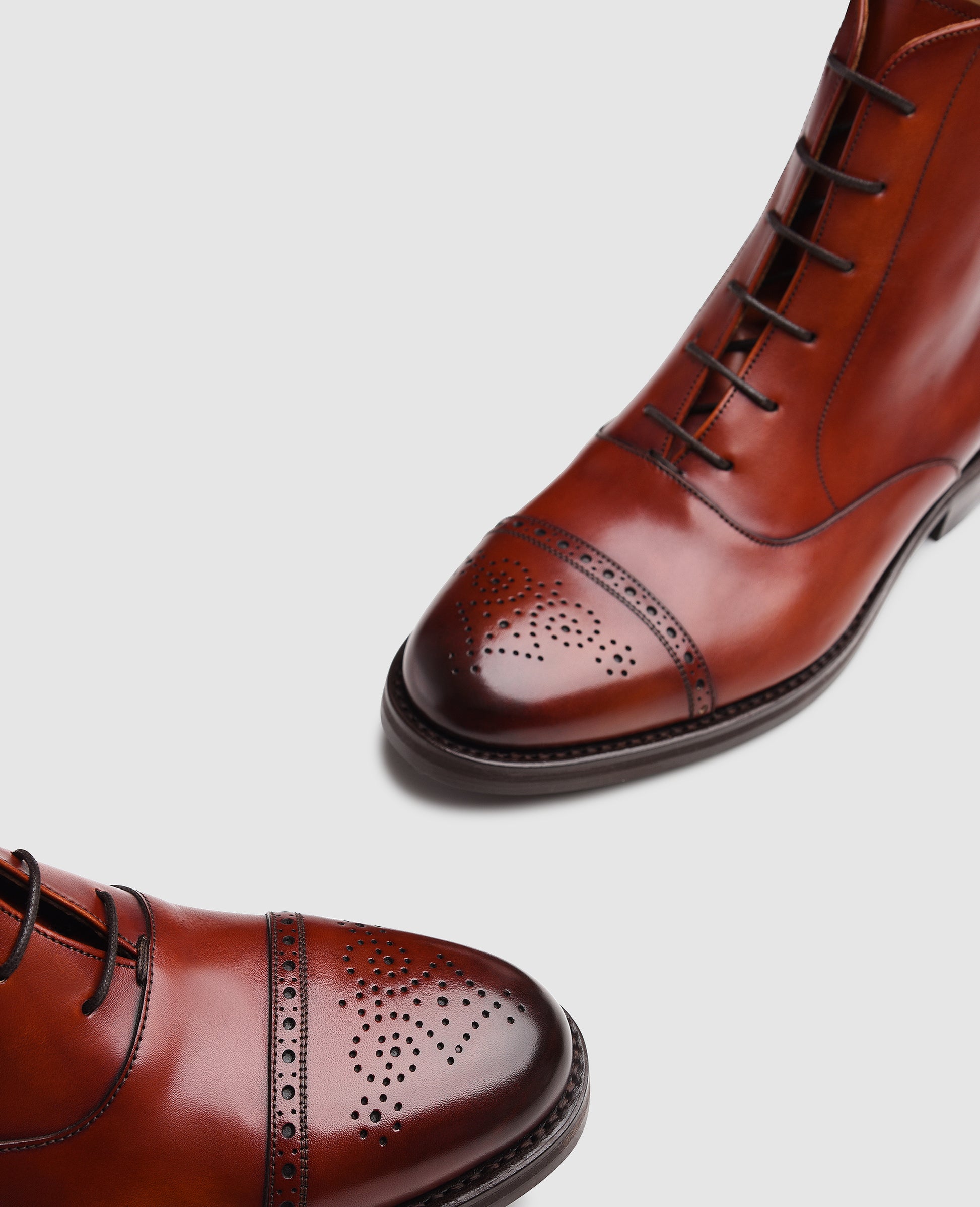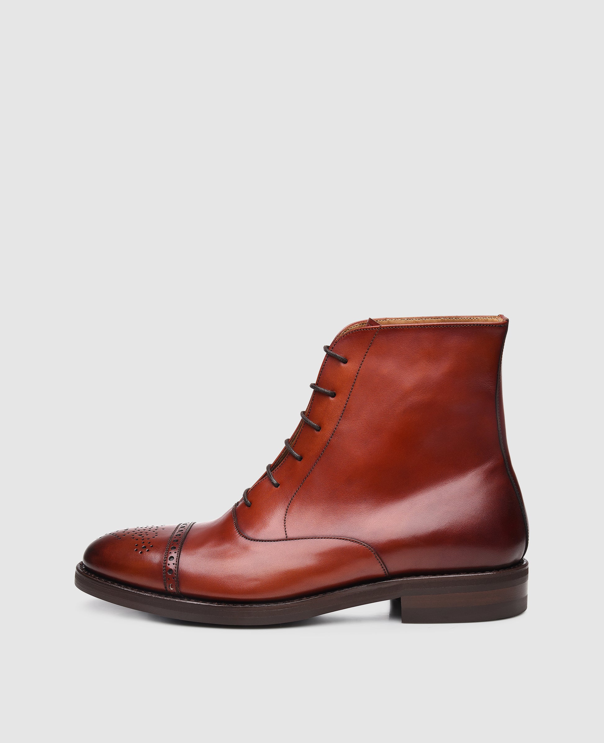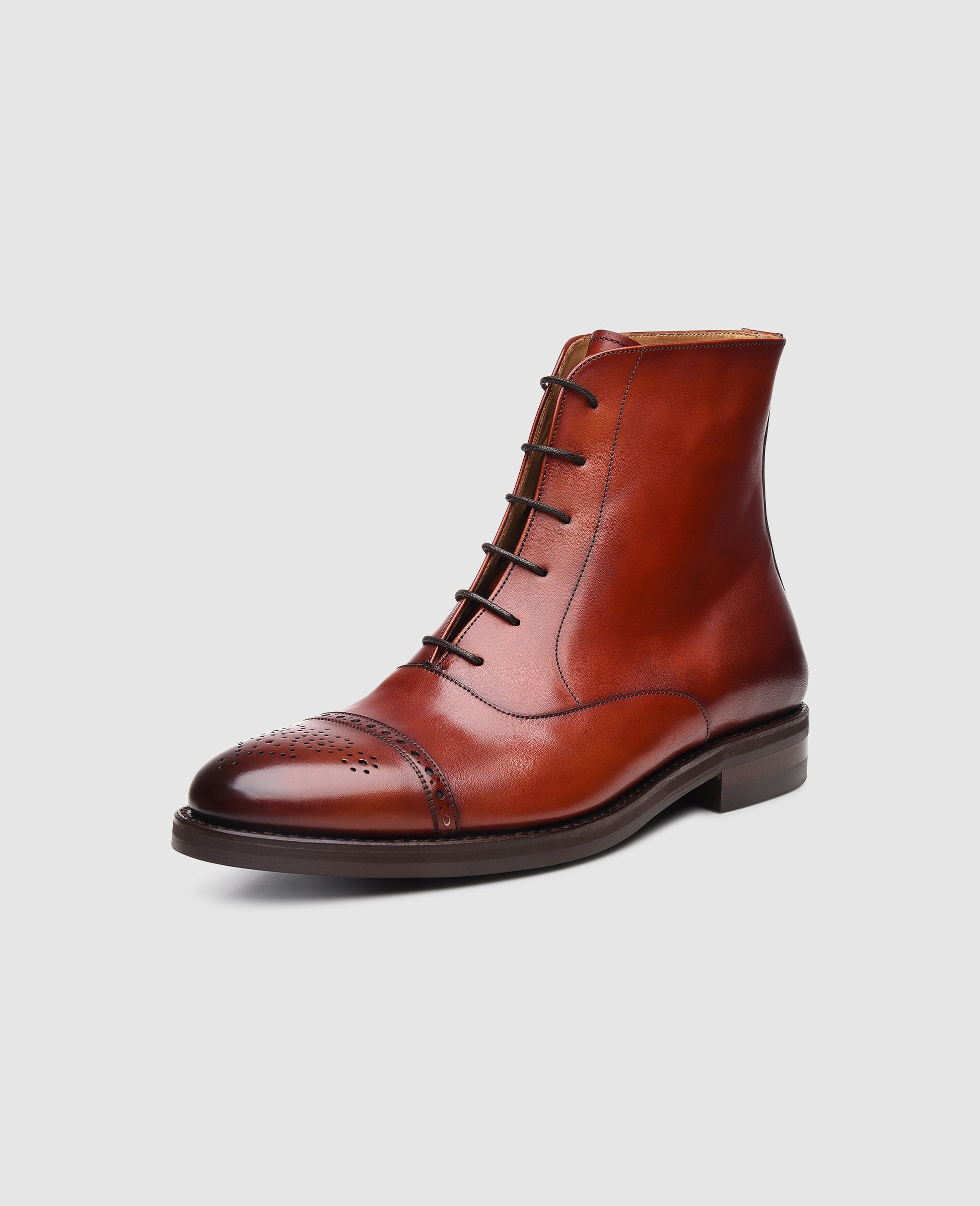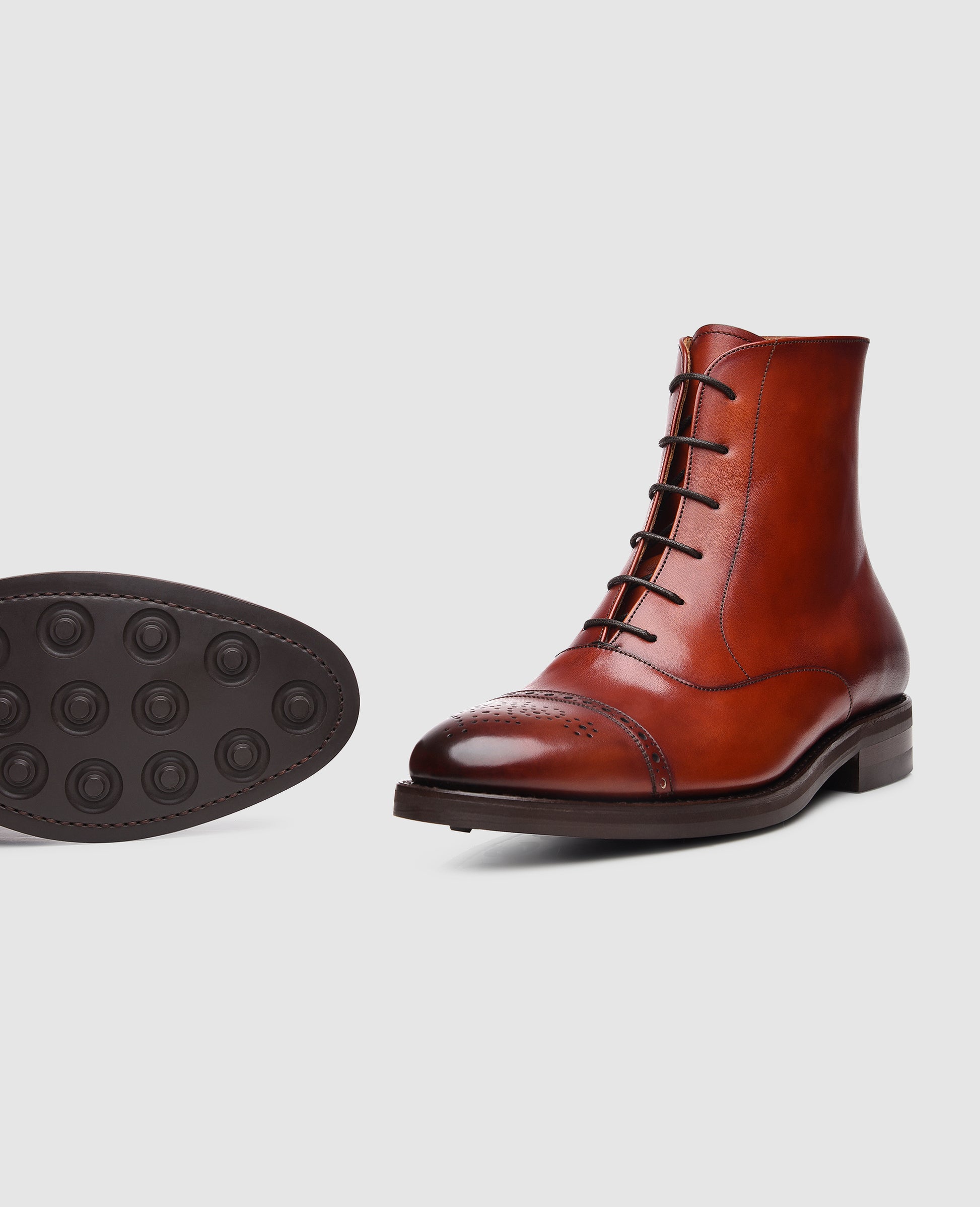 In the wet and cold season, an elegant boot combines weatherproof comfort with a stylish appearance. Characteristics of this model are the high reaching shaft with its closed-eyelet lacing and the decorated toe cap. This elegant men's boot is unique above all thanks to the elaborate hand finish that envelops the entire upper of the shoe in a true interplay of colors. The exquisite calfskin together with the inner lining and insole made of cowhide ensure for a flexible and breathable wearer experience. The famous Dainite rubber outsole also guarantees a secure step on slippery surfaces.