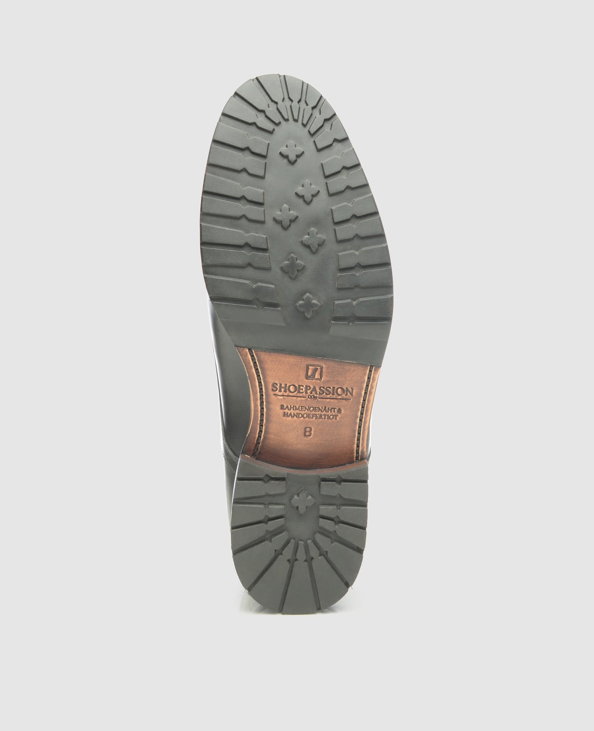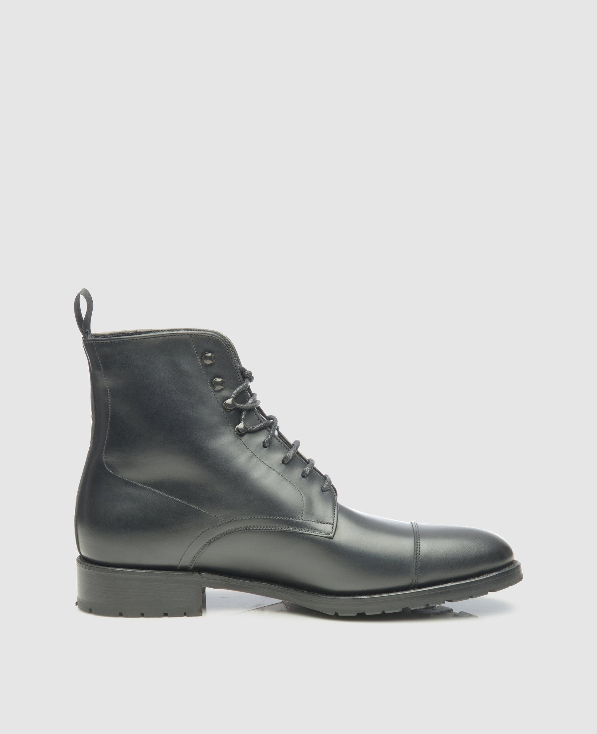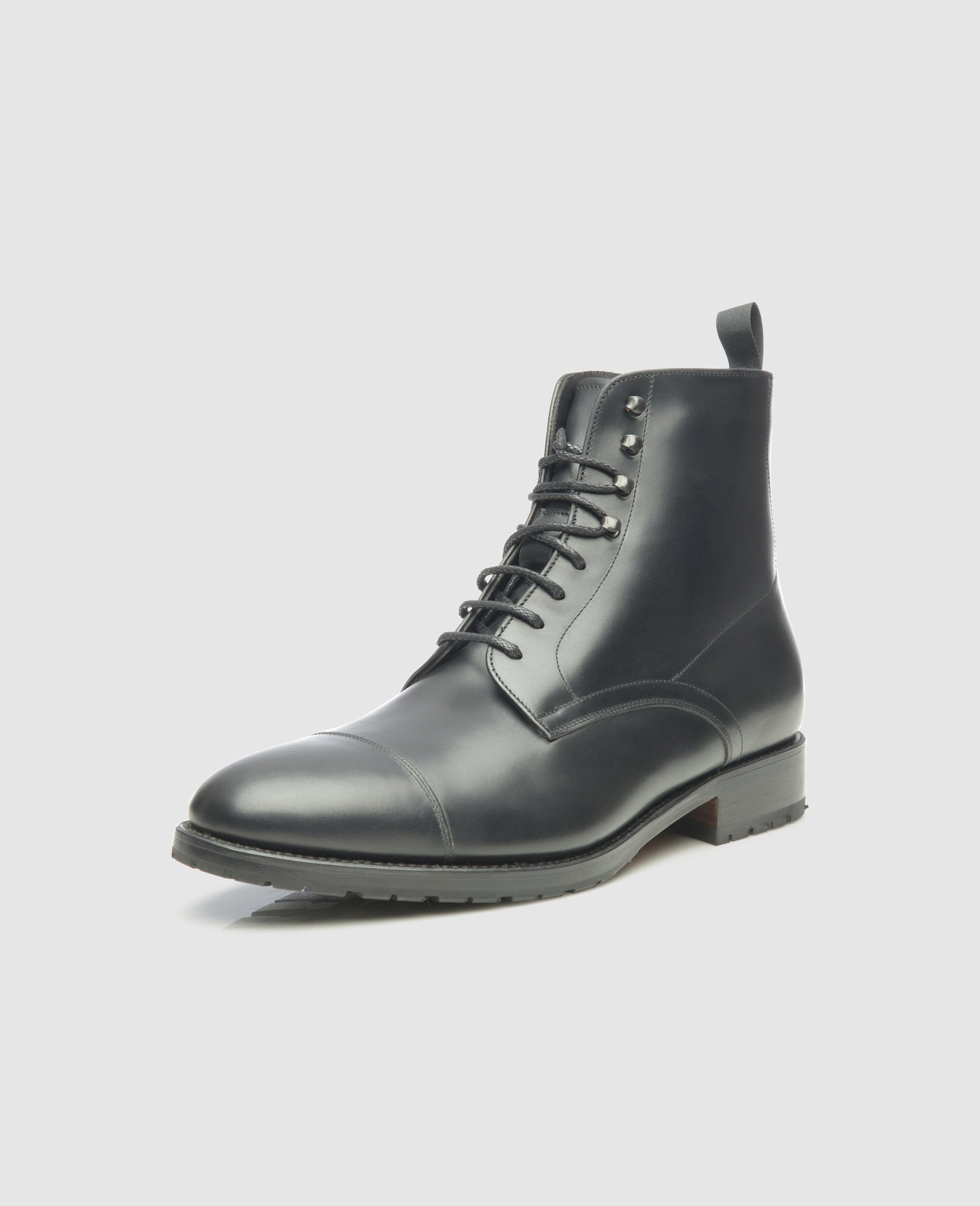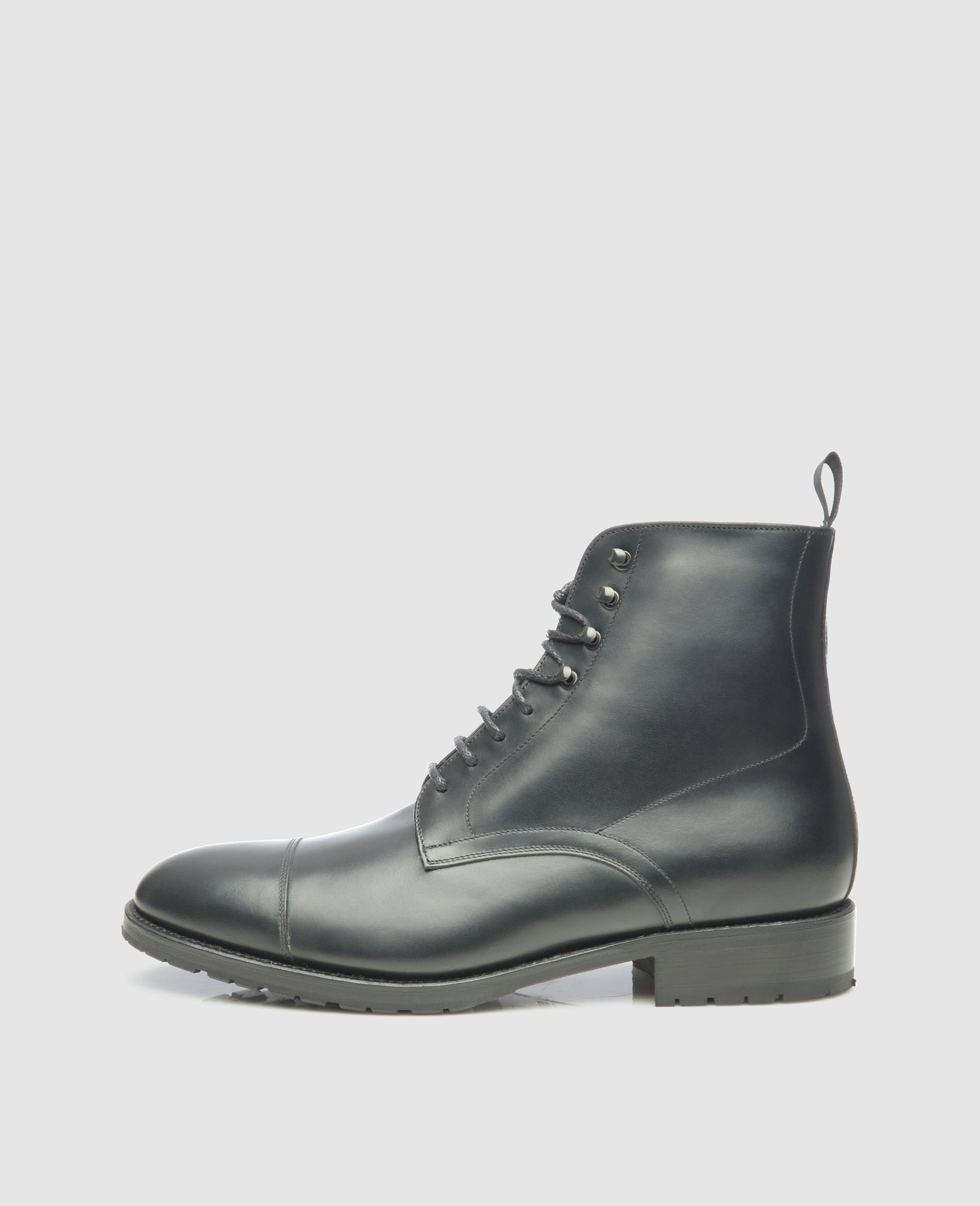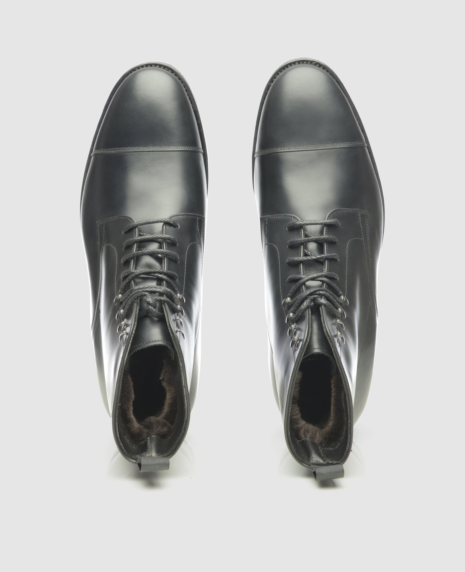 No. 675 boasts an avant-garde look and feel. This black men’s lace-up boot thrills with a stylish combination of hook-and-eye closures and lacing, as well as with winter-ready details. Thanks to the latter, this Goodyear-welted, handcrafted men’s boot is a comfortable yet stylish choice for cold, wet weather.
