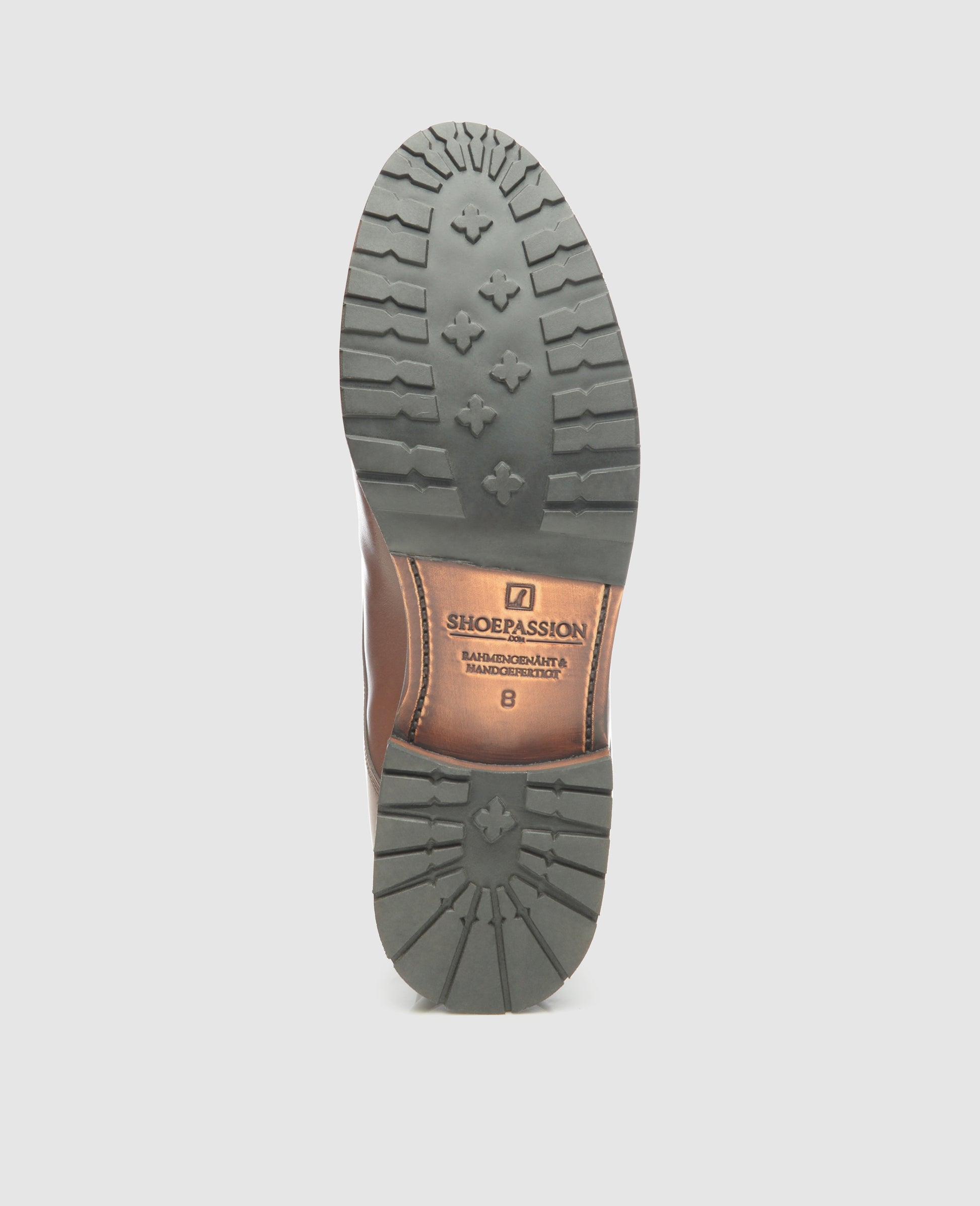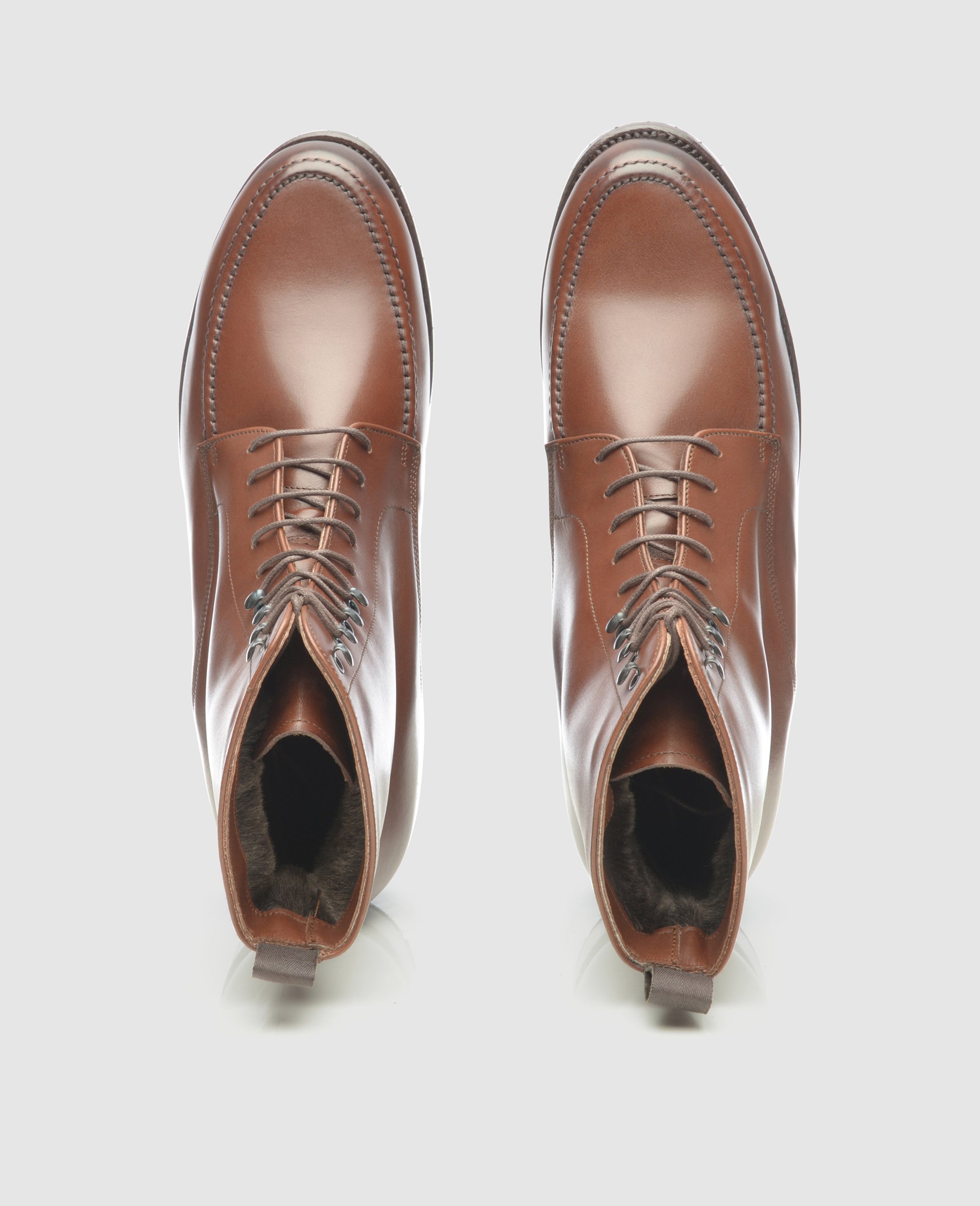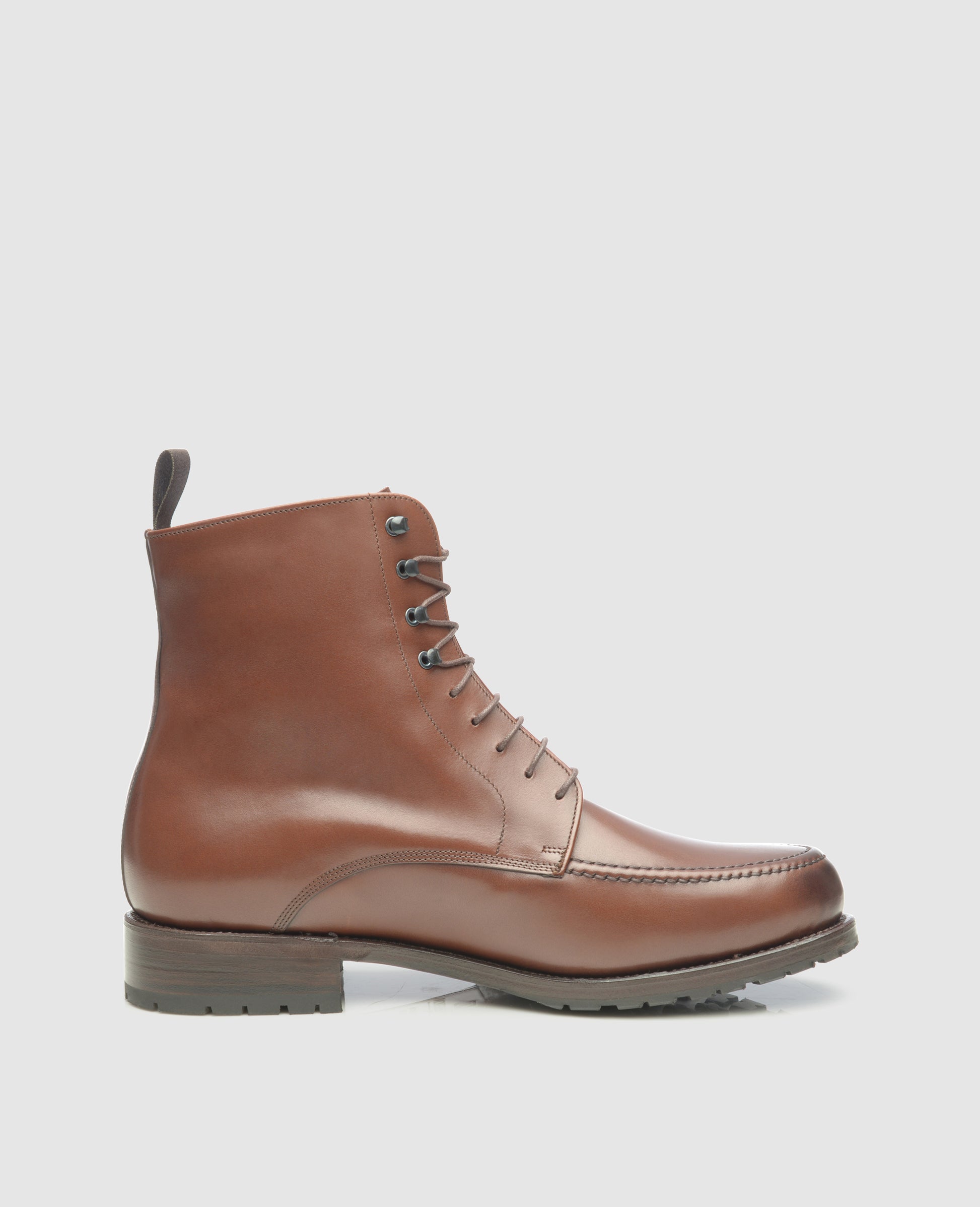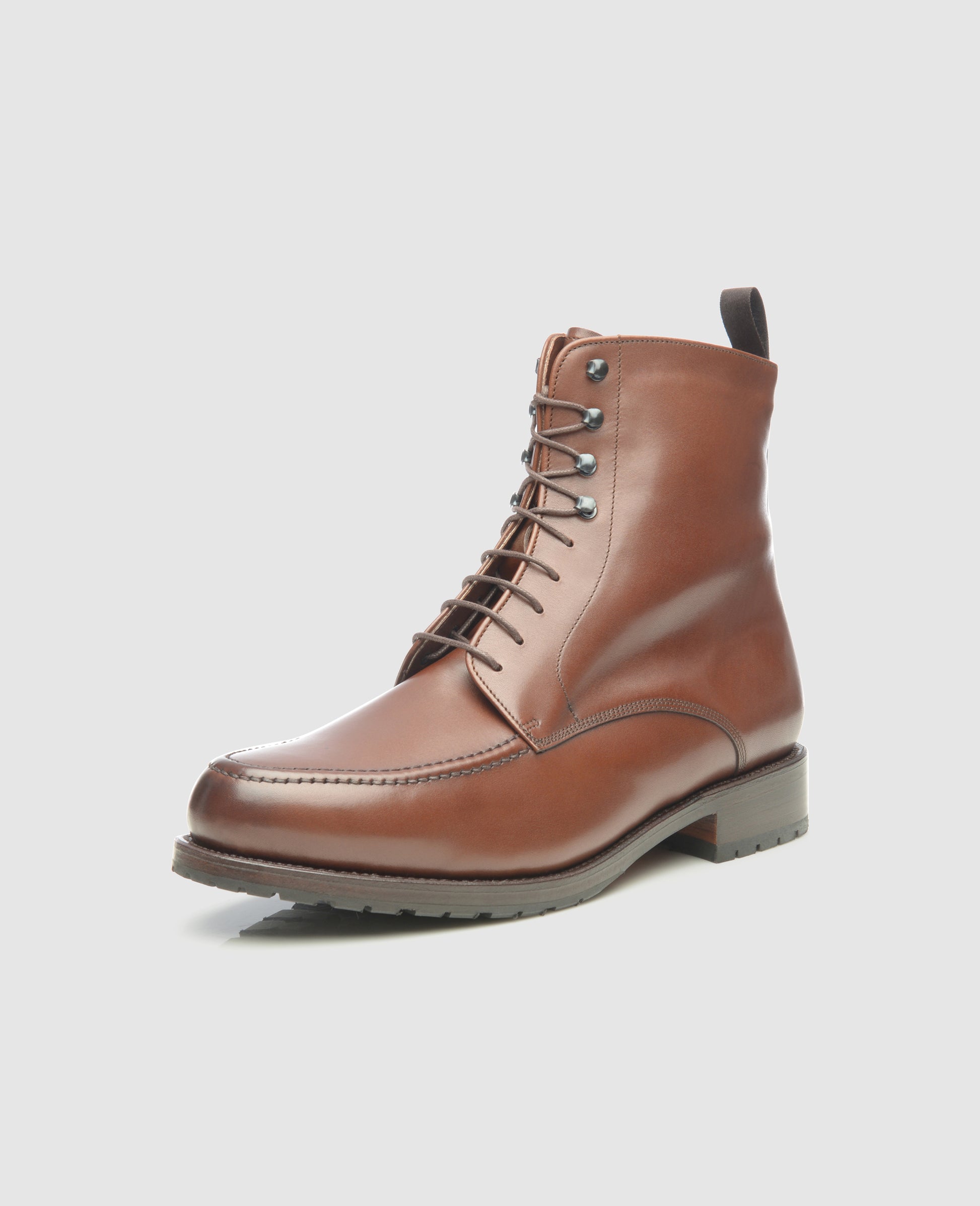 An air of considered nonchalance defines this Goodyear-welted Norwegian boot in dark brown. The boot’s U-shaped front and its modern combination of hook-and-eye closures and lacing create a look and feel of ease. Featuring lambskin lining and a rubber lug sole.