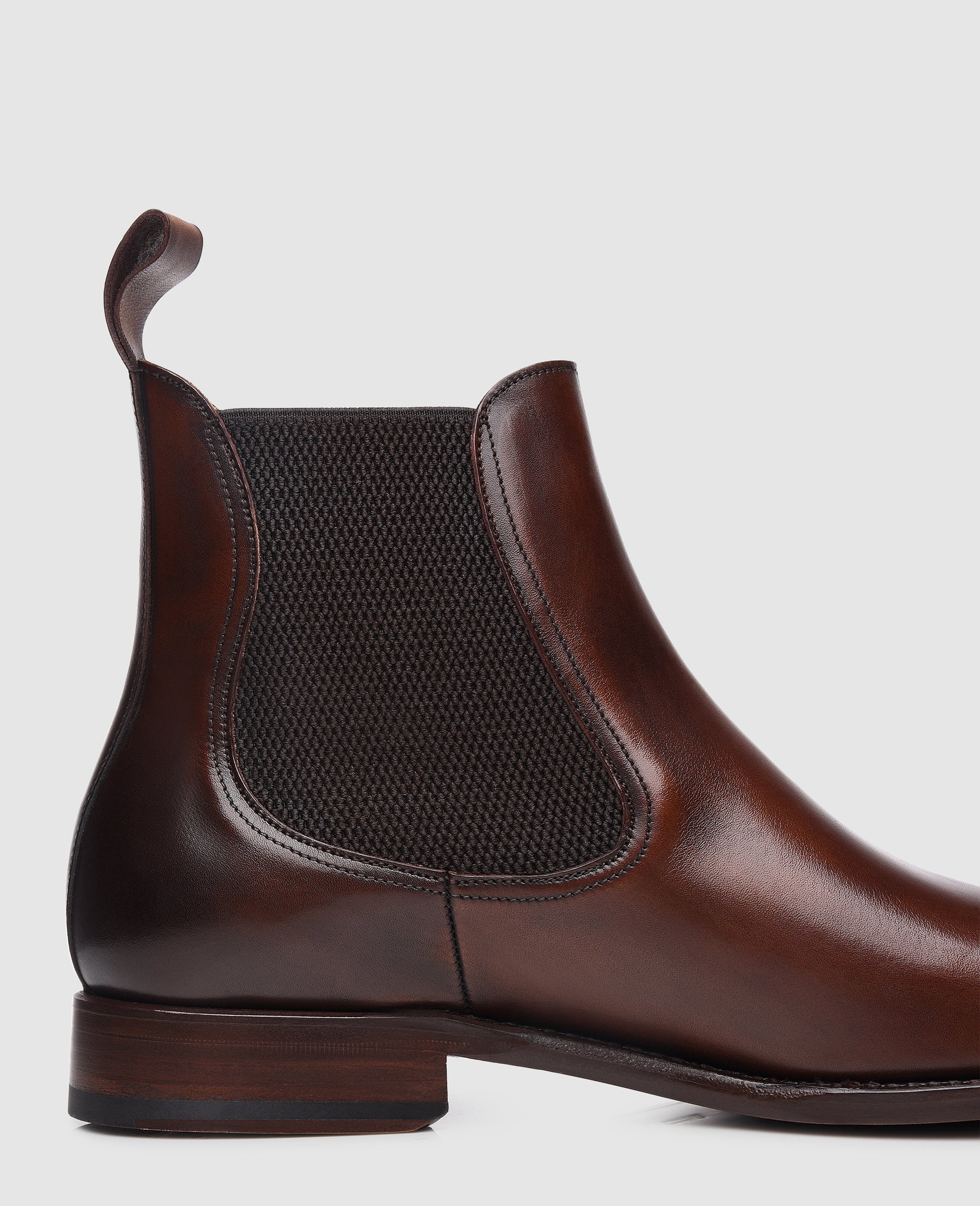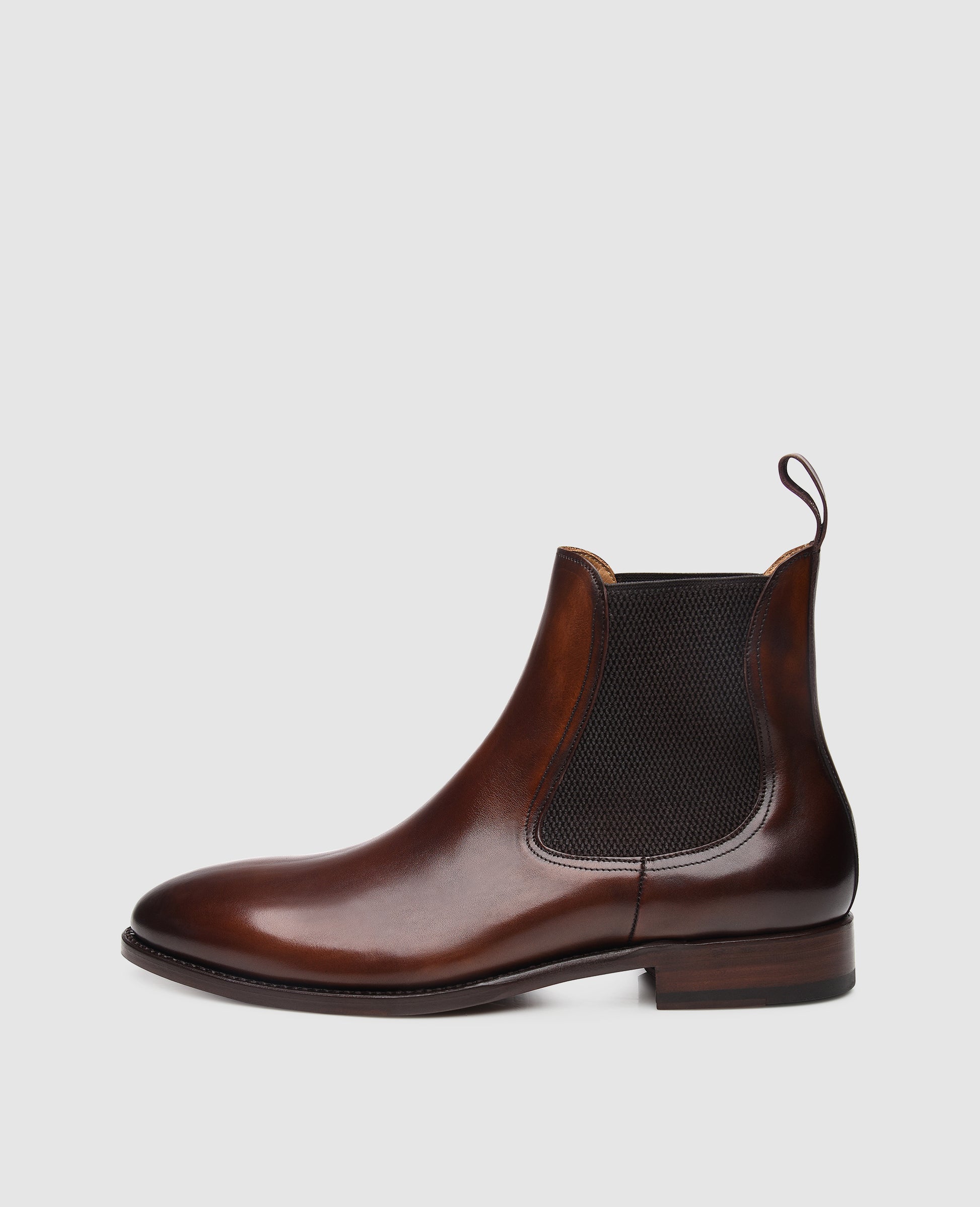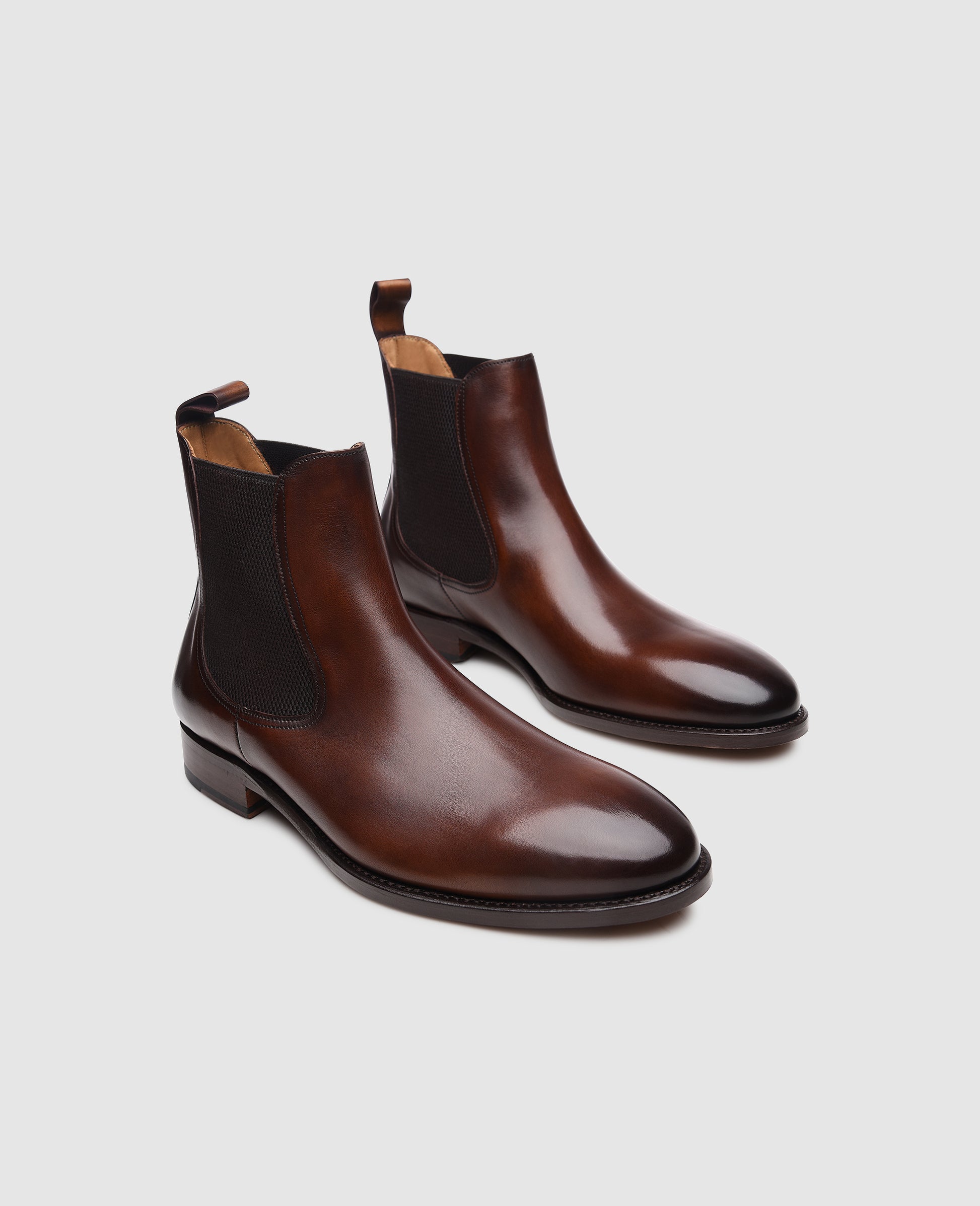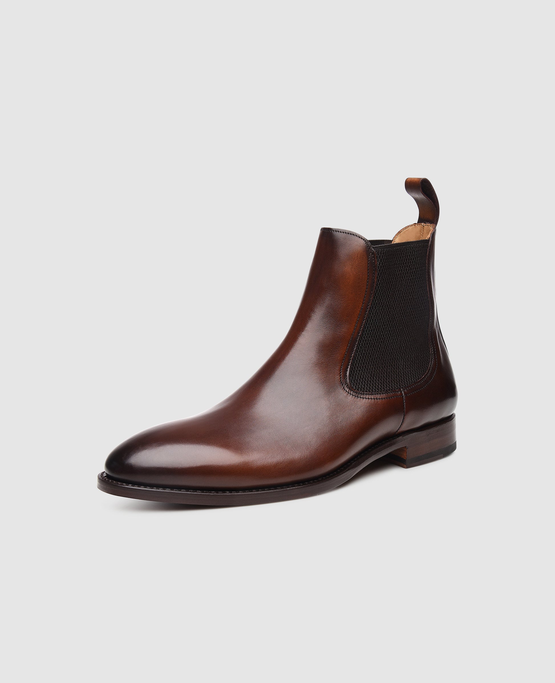 Also known as the "Beatle Boot," this Goodyear-welted Chelsea boot has a very special design highlight. The shaft is made of the finest calfskin with an elaborate hand finish. The result is a breathtaking interplay of light and dark colors. On the other hand, the basic shaft cut with two elastic side inserts and the practical pull loop at the heel are more classical attributes. The Chelsea boot is a breathable full leather shoe thanks to the inner lining, insole, outsole and heel, which are also made of cowhide. Goodyear-welted craftsmanship with a contemporary look!