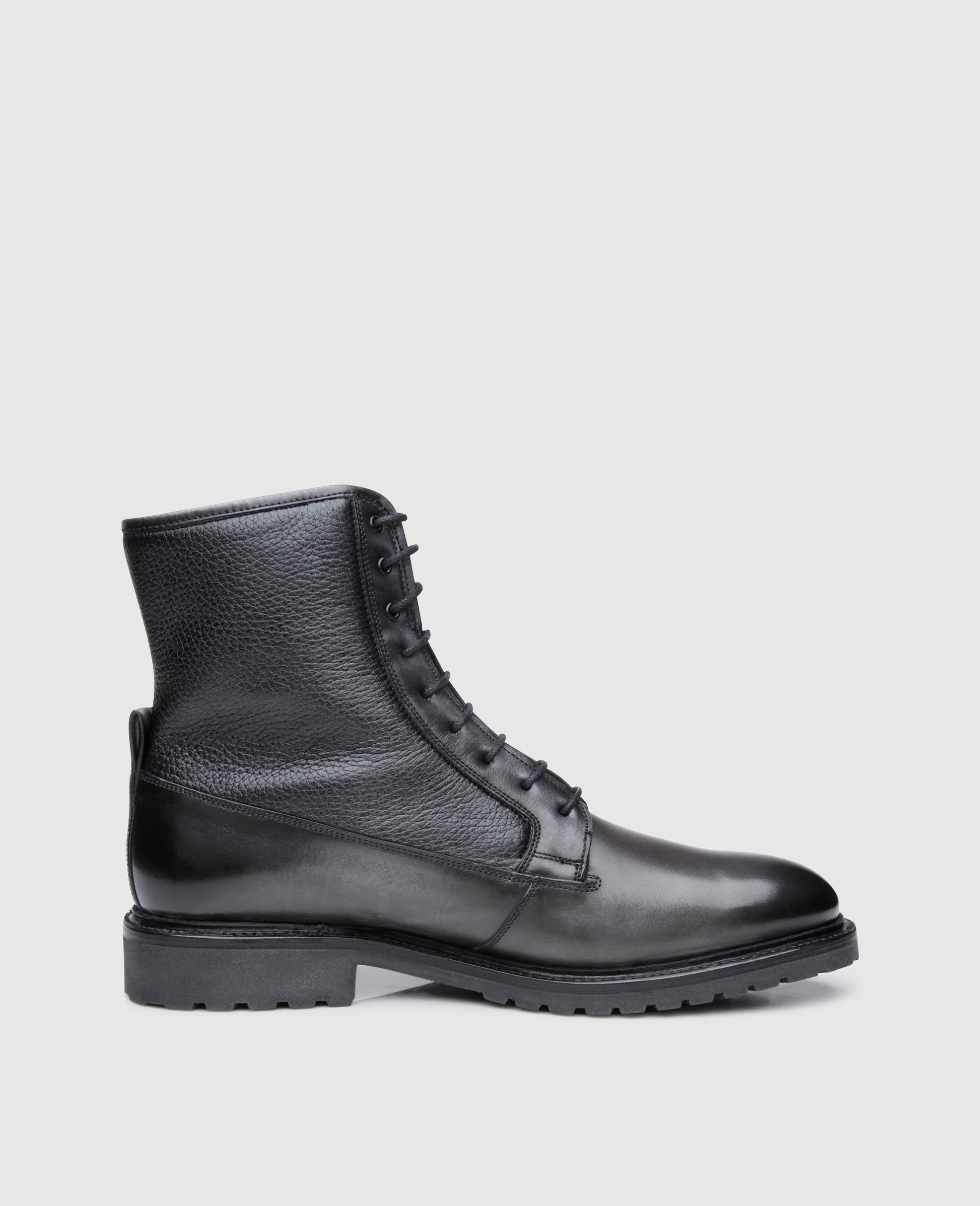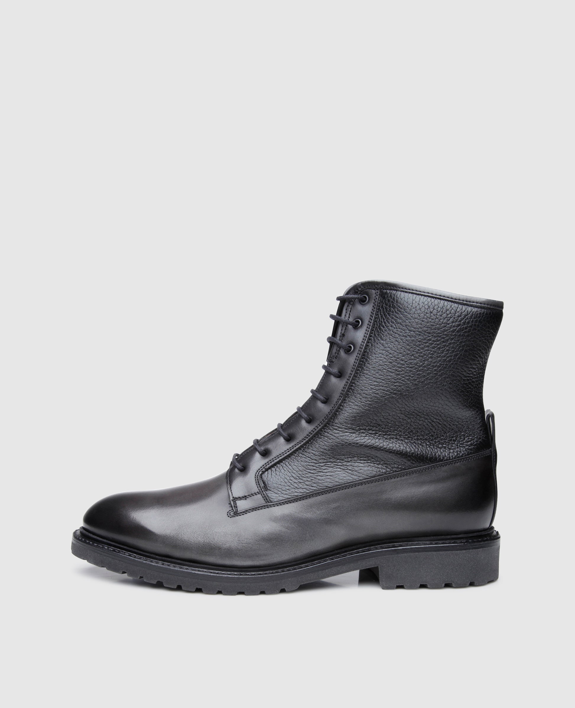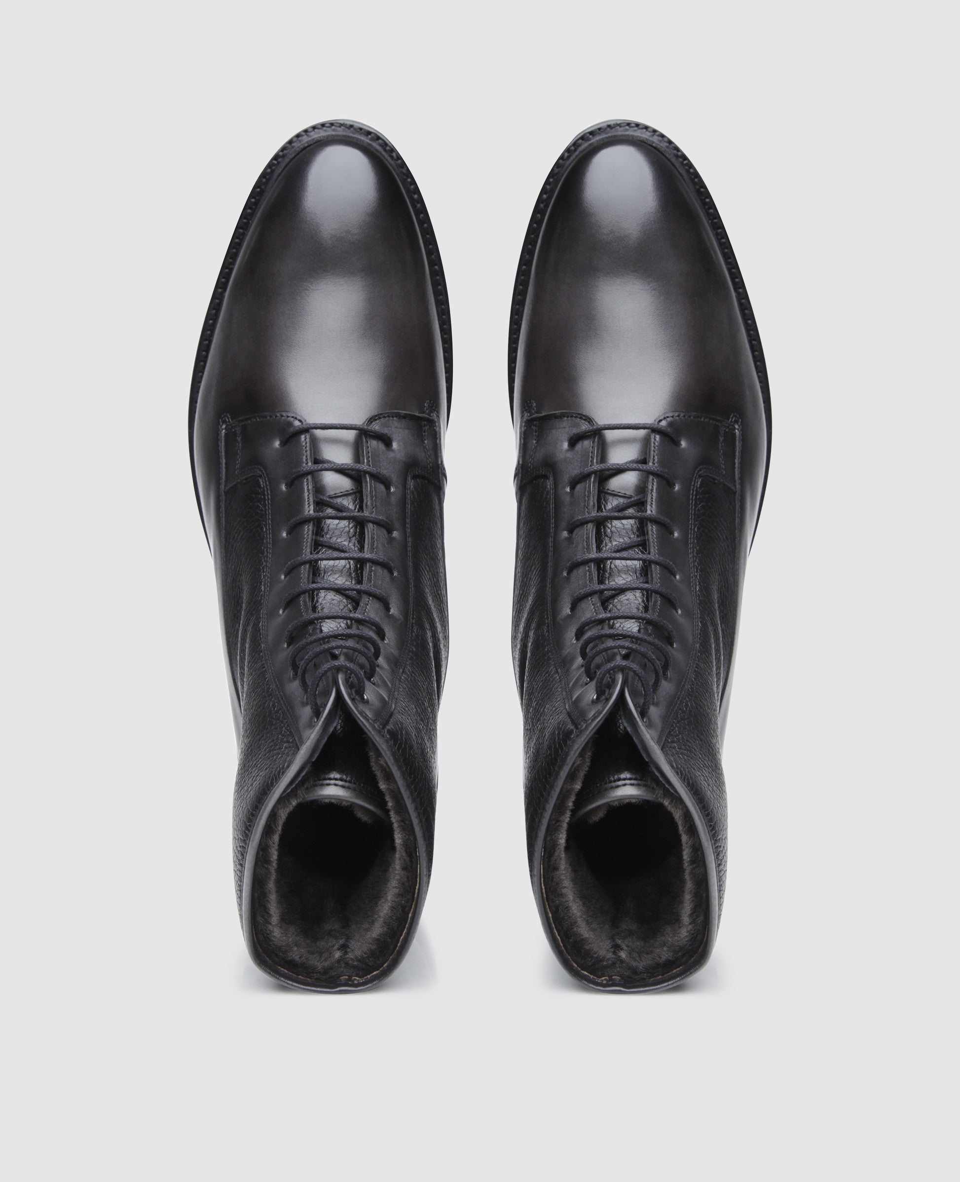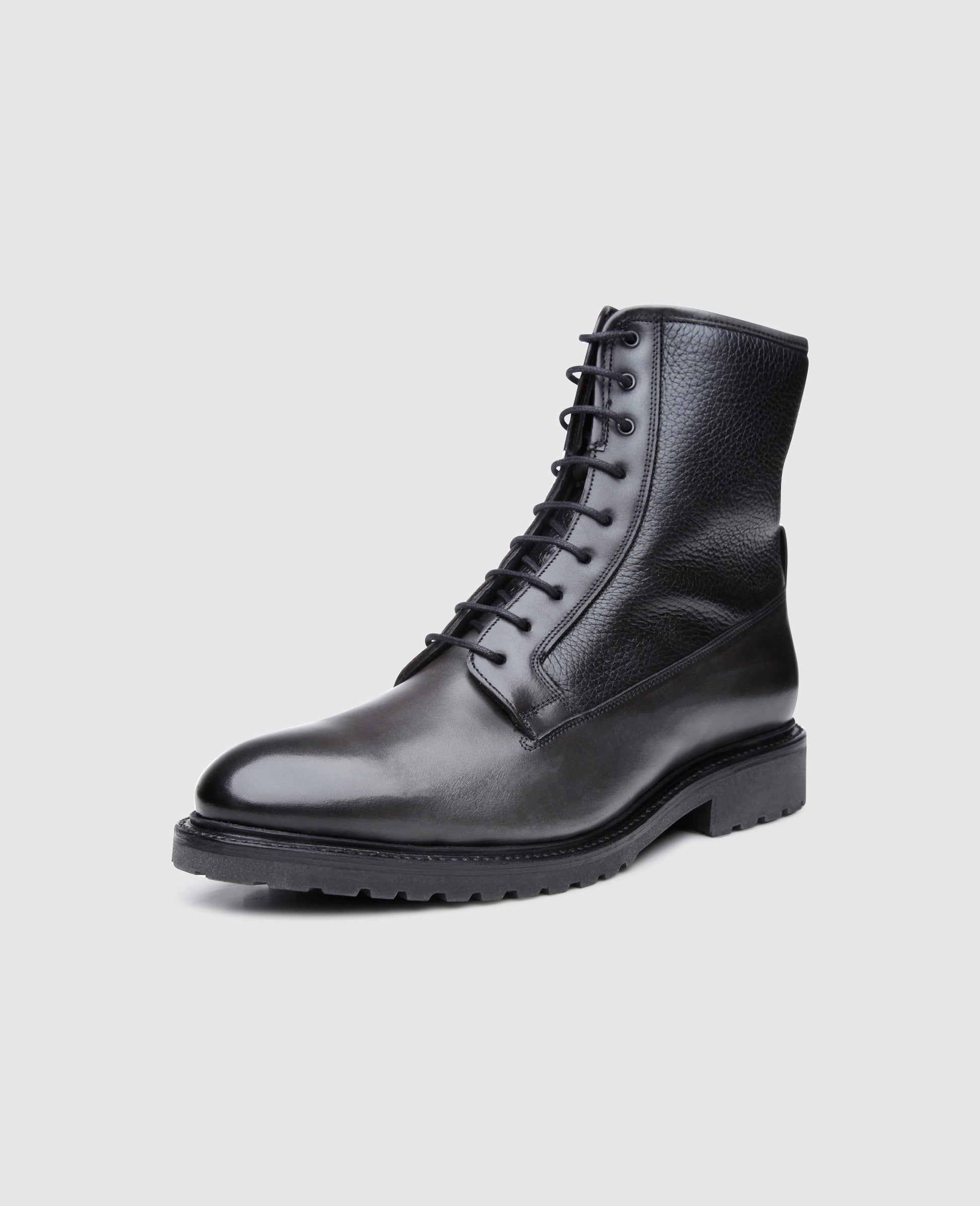 Improve your winter with this stylish lace-up boot for men. Made using the Goodyear welting production method from two premium leathers, No. 687 thrills with a fascinating combination of different materials and colors. The anthracite-colored soft calf of the lower shaft section boasts an exciting hand finish and a breathtaking shine, while the sections on top are made from black deerskin, a material whose characteristic texture makes a striking contrast to the supple and glossy calfskin sections.