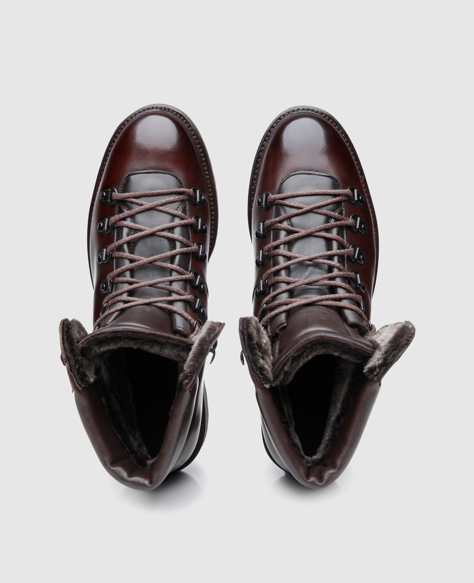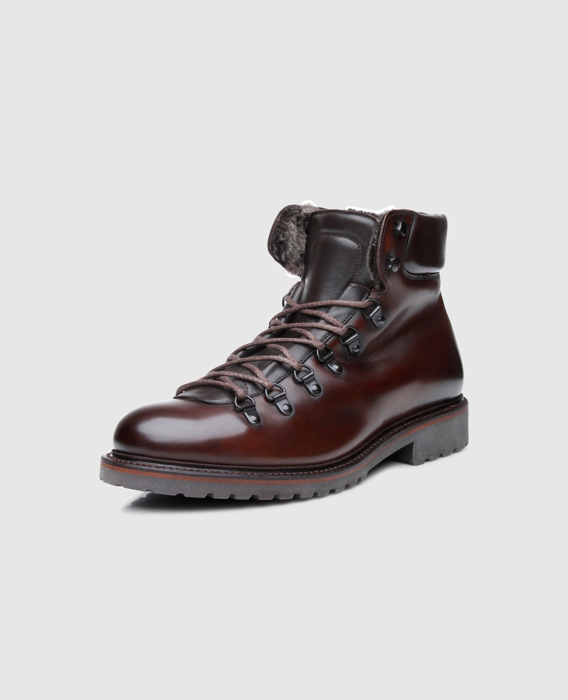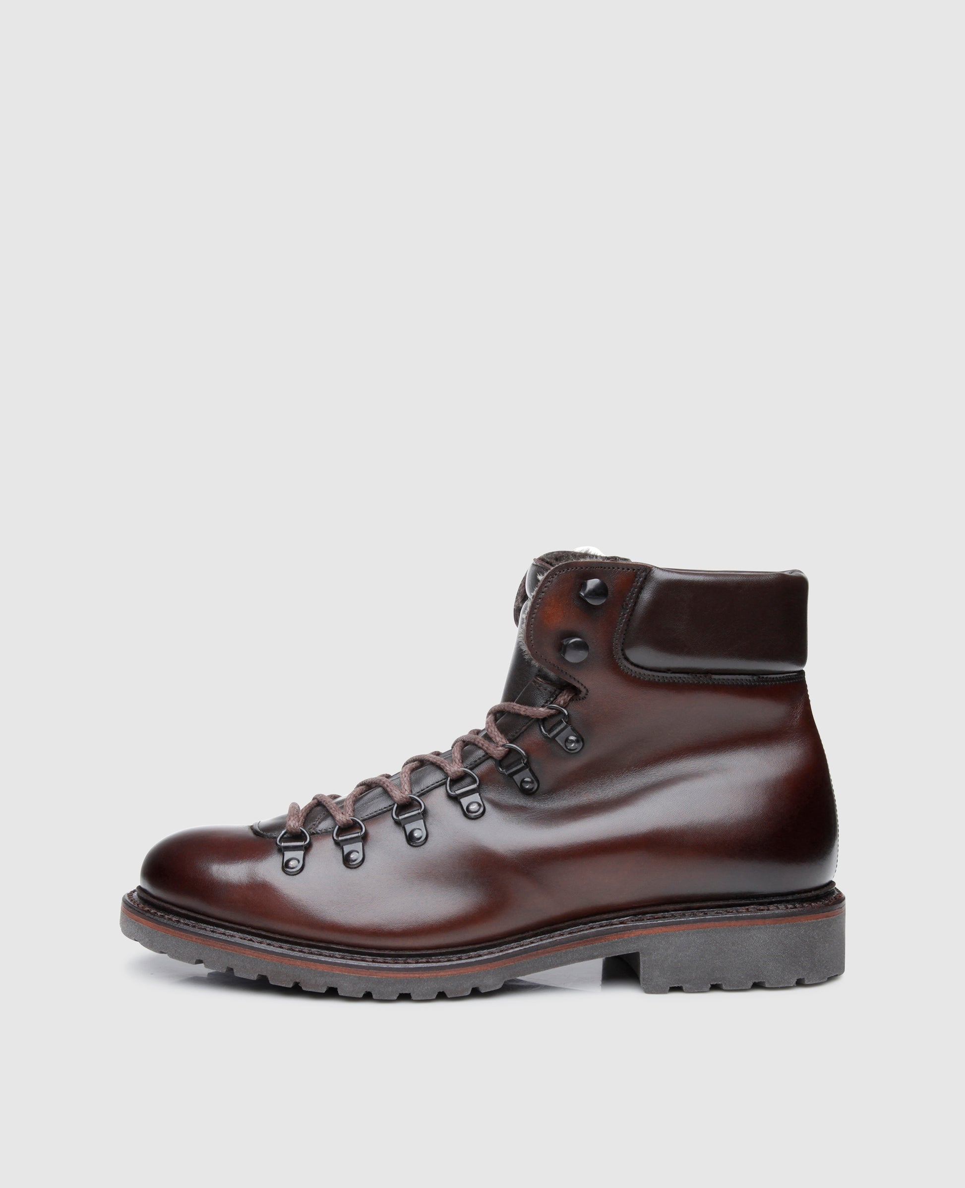 This Goodyear-welted men’s boot evokes a traditional Alpine mountaineering boot. Its robust rubber lug sole ensures stability on slippery surfaces, while its striking lacing, an arrangement of metal rings and hooks, keeps feet secure and comfortable. The reinforced sections along the entrance to the shaft as well as the flap, which is made from durable yet flexible nappa leather, also ensure wearing comfort.
