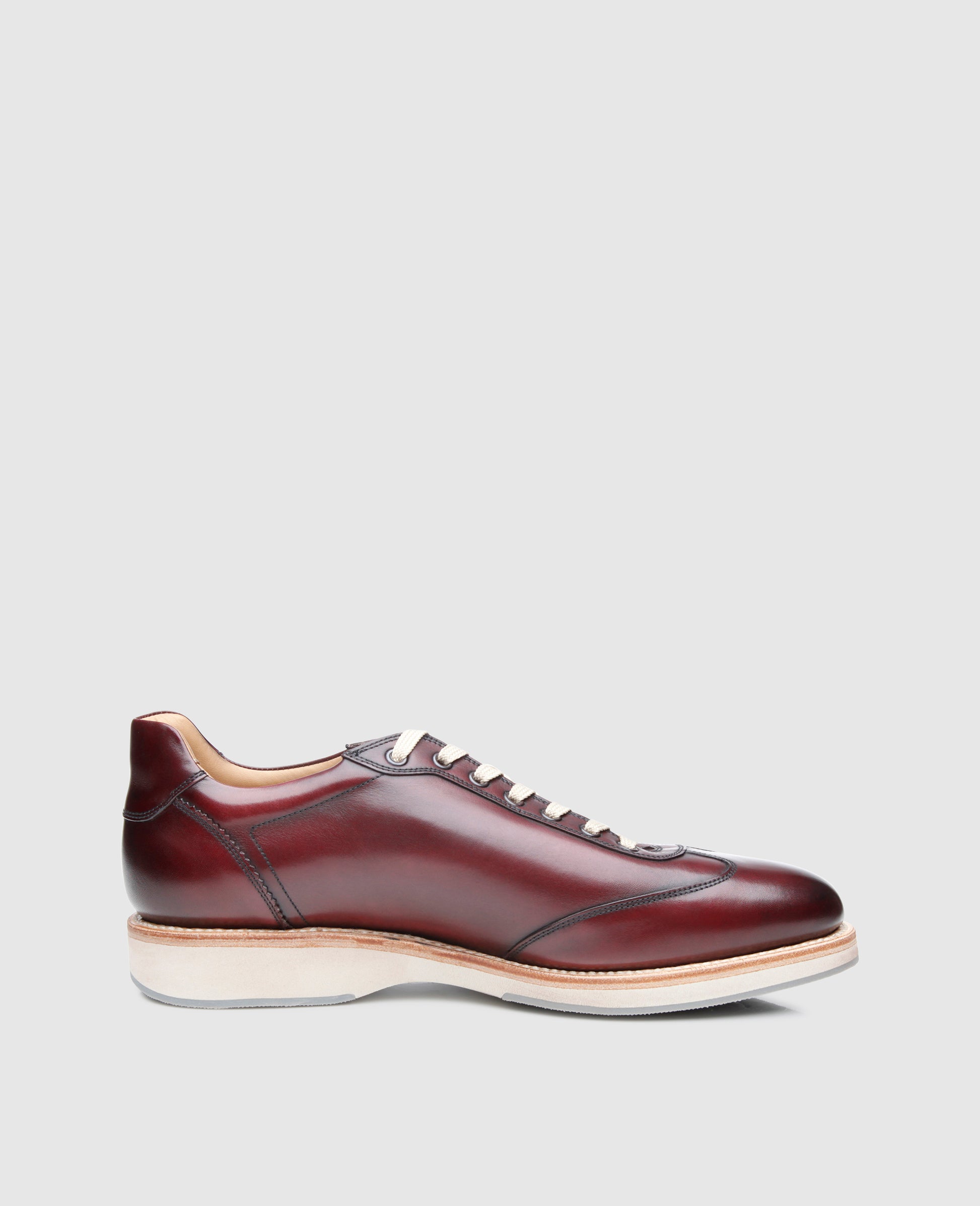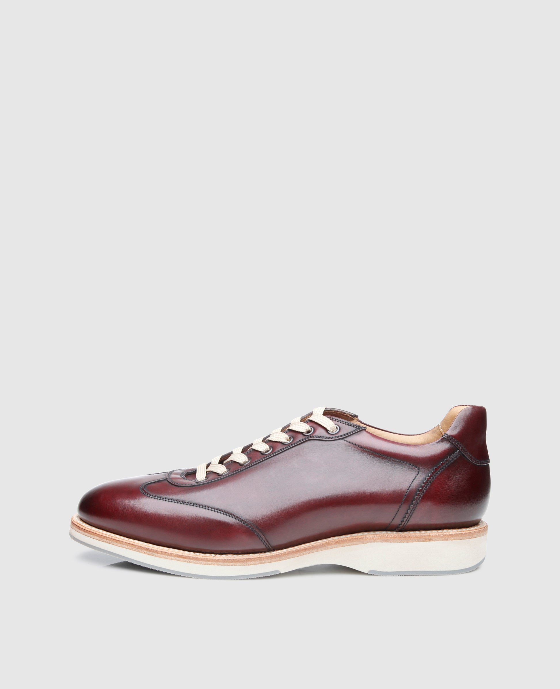 No. 924 is perfect for modern smart casual looks. Its refined design is the result of the supreme shoe production method, used to combine sophisticated materials with a masterly attention to detail to create this versatile, sporty, and elegant shoe. This men’s trainer in burgundy is a rare find in that it is Goodyear-welted and handcrafted.
