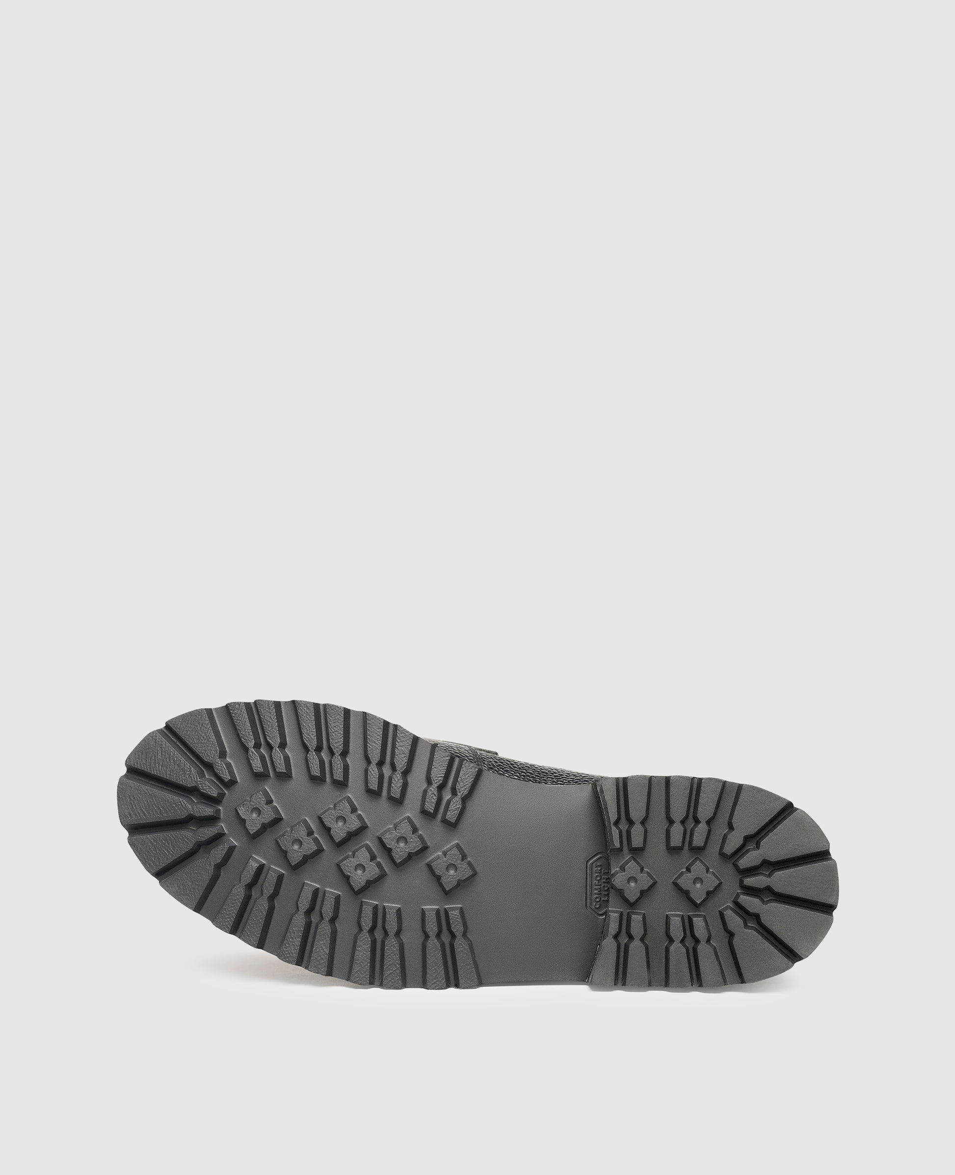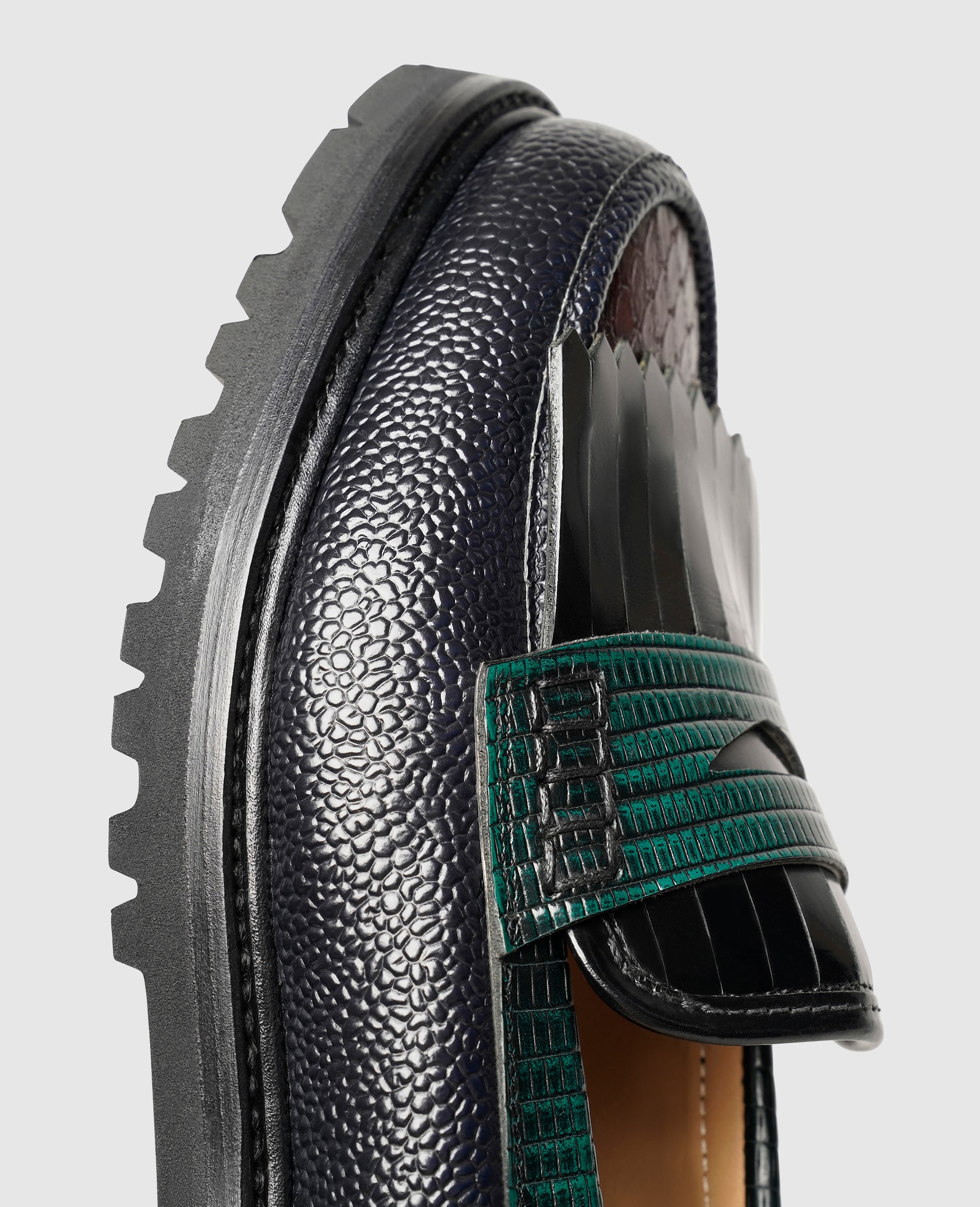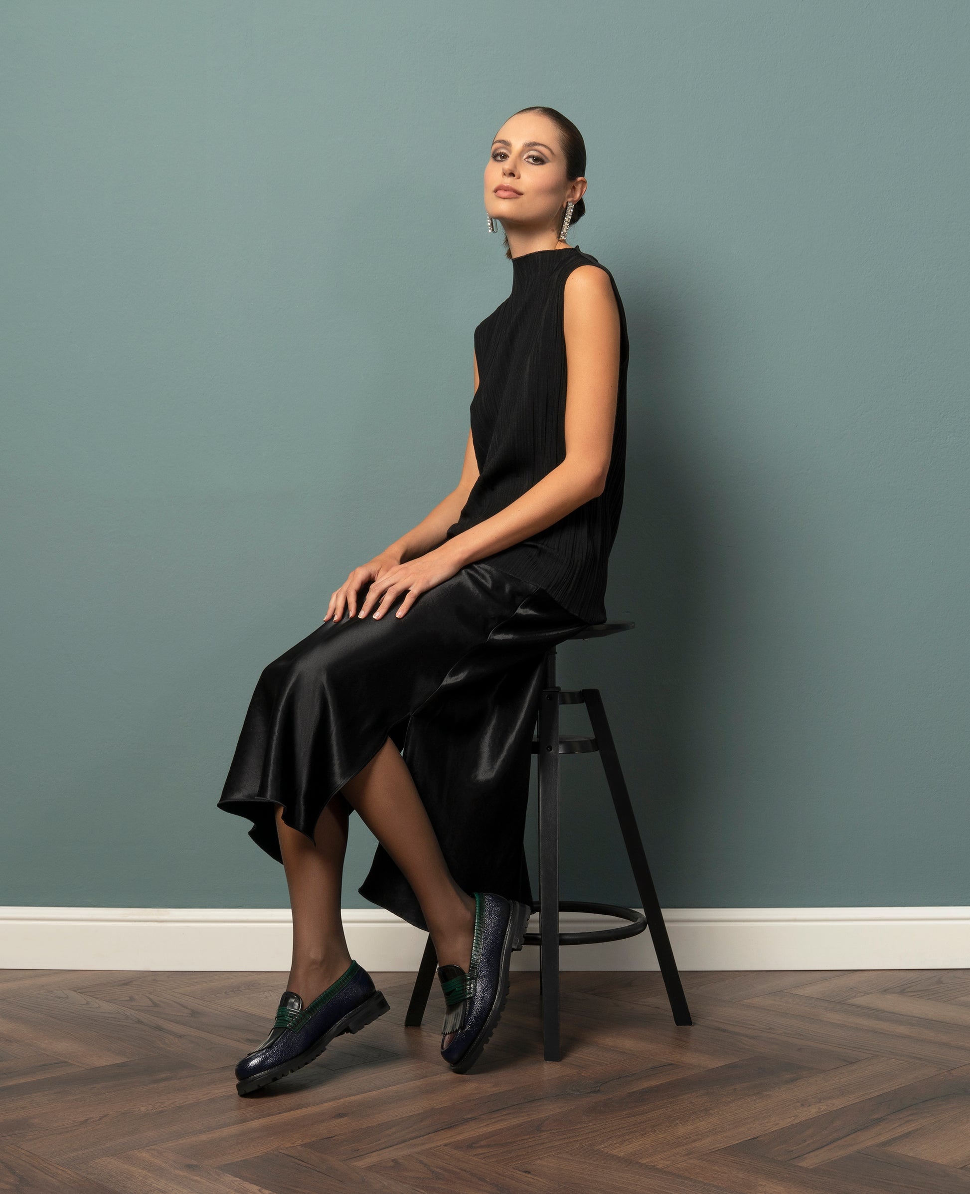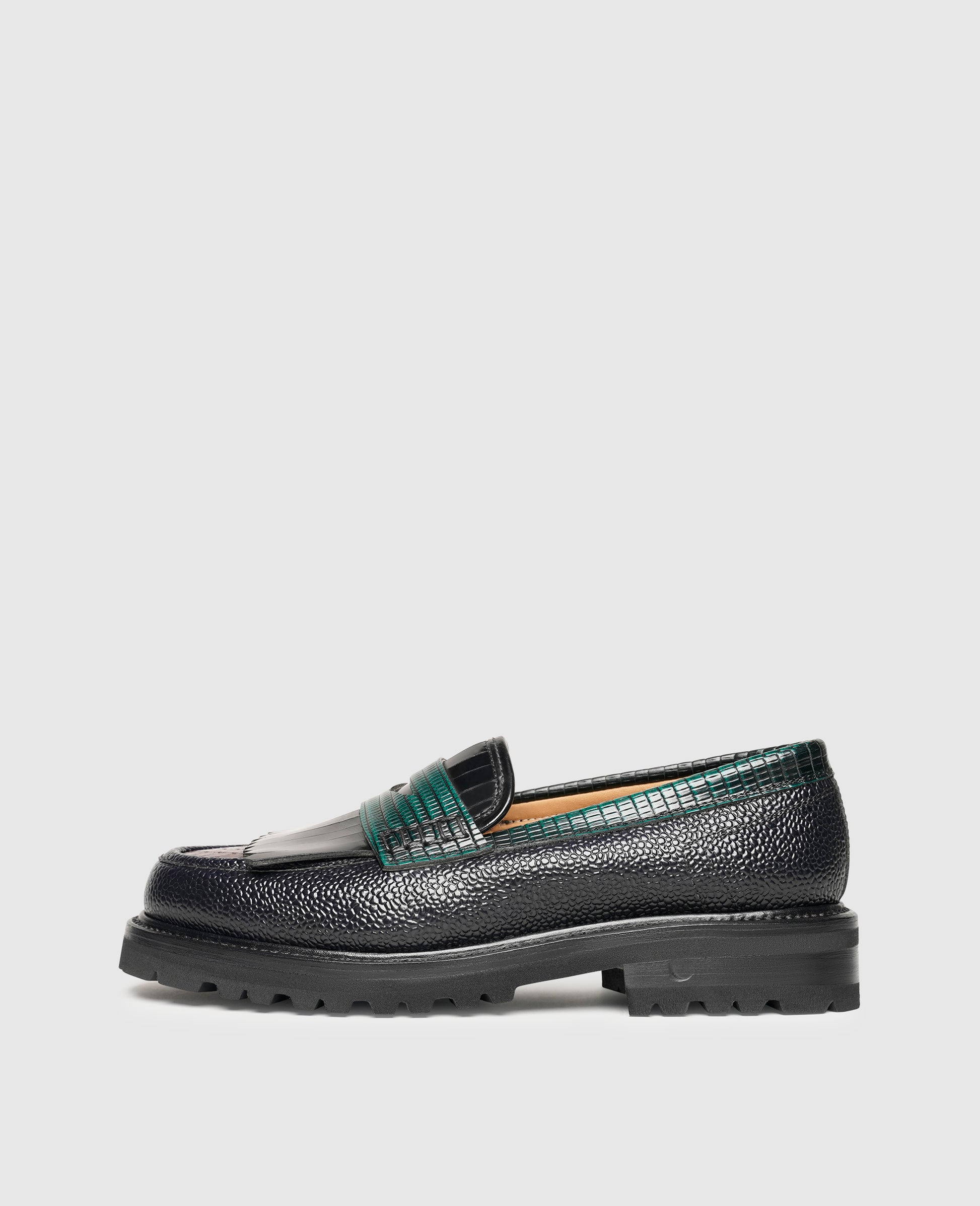 The popular fringe loafer for women impresses with its contemporary combination of designs in this "Industrial Image" line model from Henry Stevens. Thanks to the contrasting embossed leather sections in varying colors, this Goodyear-welted, handcrafted women's loafer with its sophisticated fringe detailing is an exclusive statement piece. The wide outsole with its non-slip rubber profile is both sturdy and striking. This model is guaranteed to be the right choice for all women with a penchant for out-of-the-ordinary designs.
