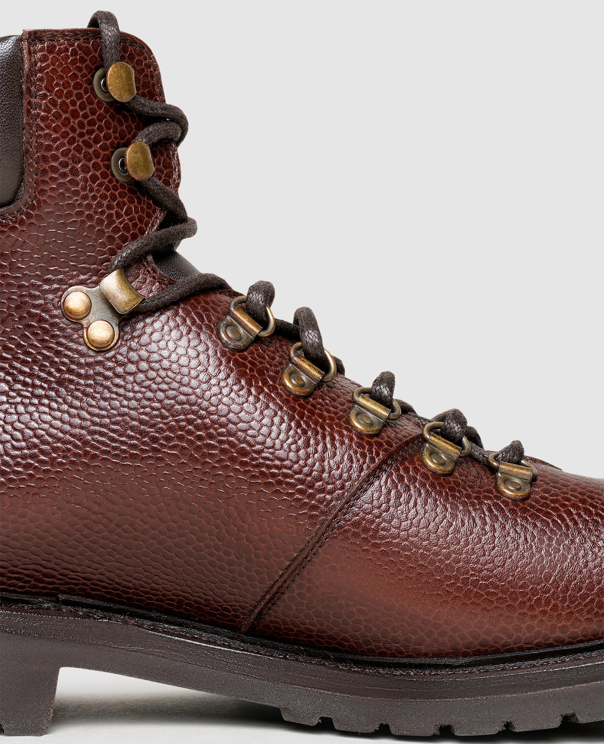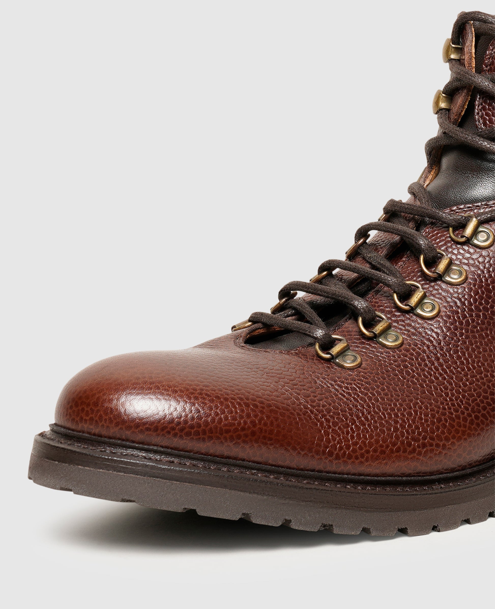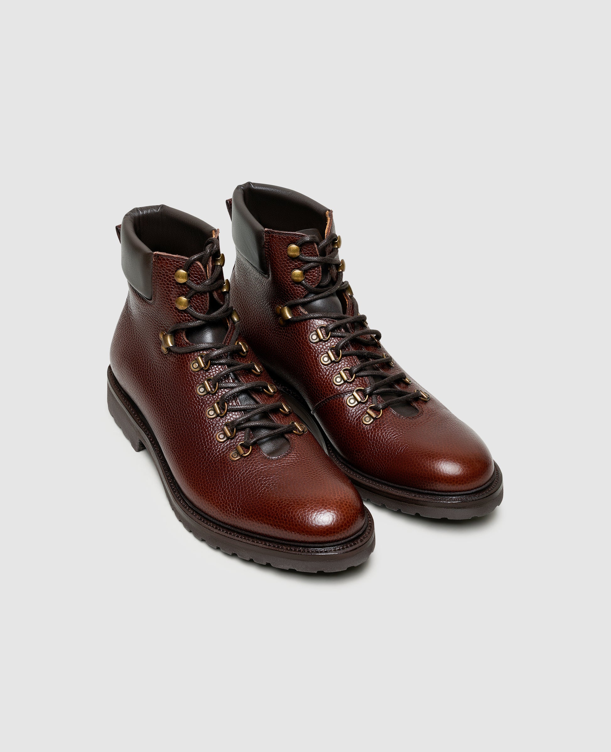 These sturdy lace-up boots for men from Henry Stevens take the sporty design of a hiking boot and combine it with carefully selected high-quality materials and expert attention to detail. Handcrafted and Goodyear-welted, these men's boot feature embossed cowhide leather, better known as Scotchgrain leather, ensuring a comfortable fit. A solid rubber lug tread allows for a confident appearance, even in wet and slippery conditions.