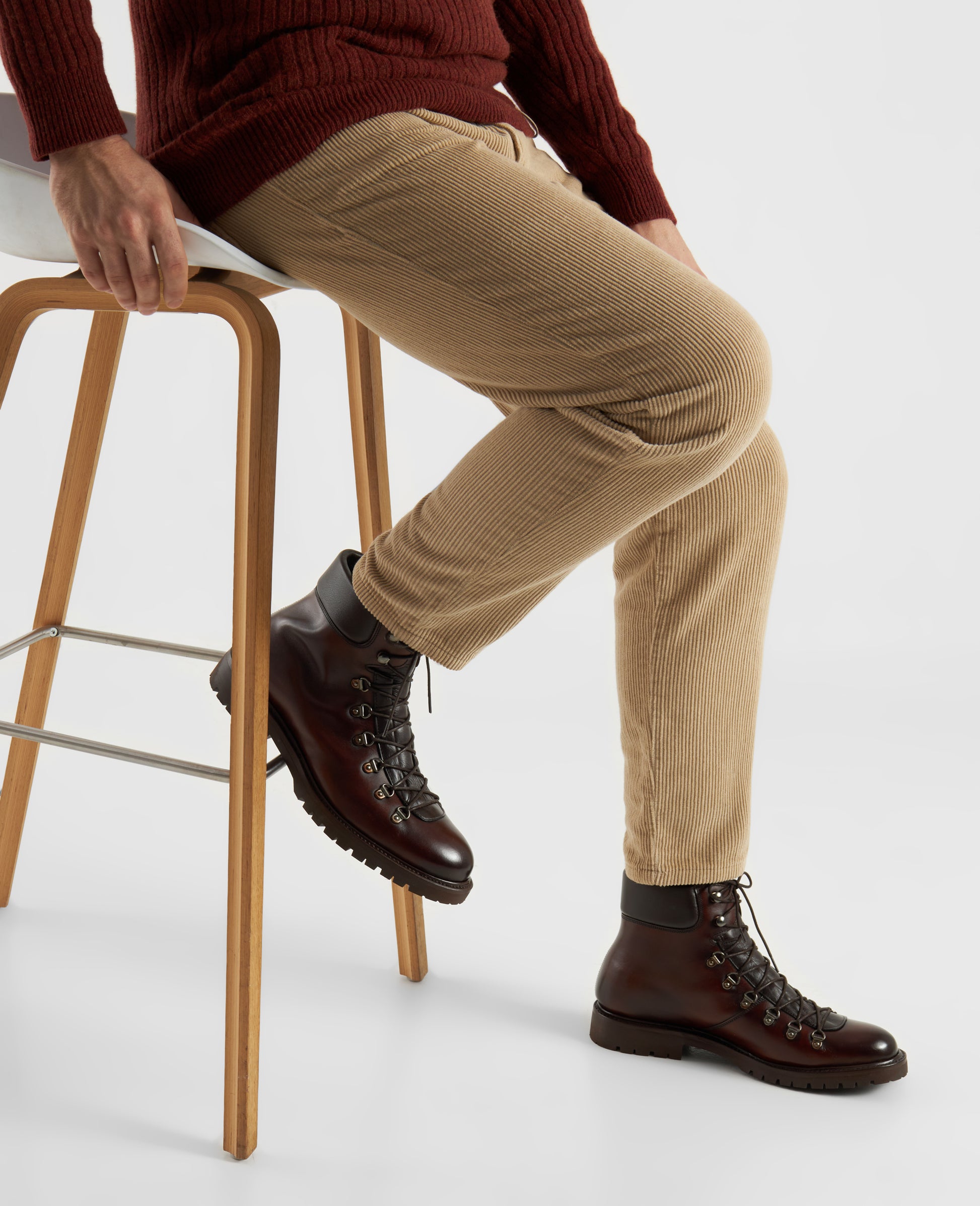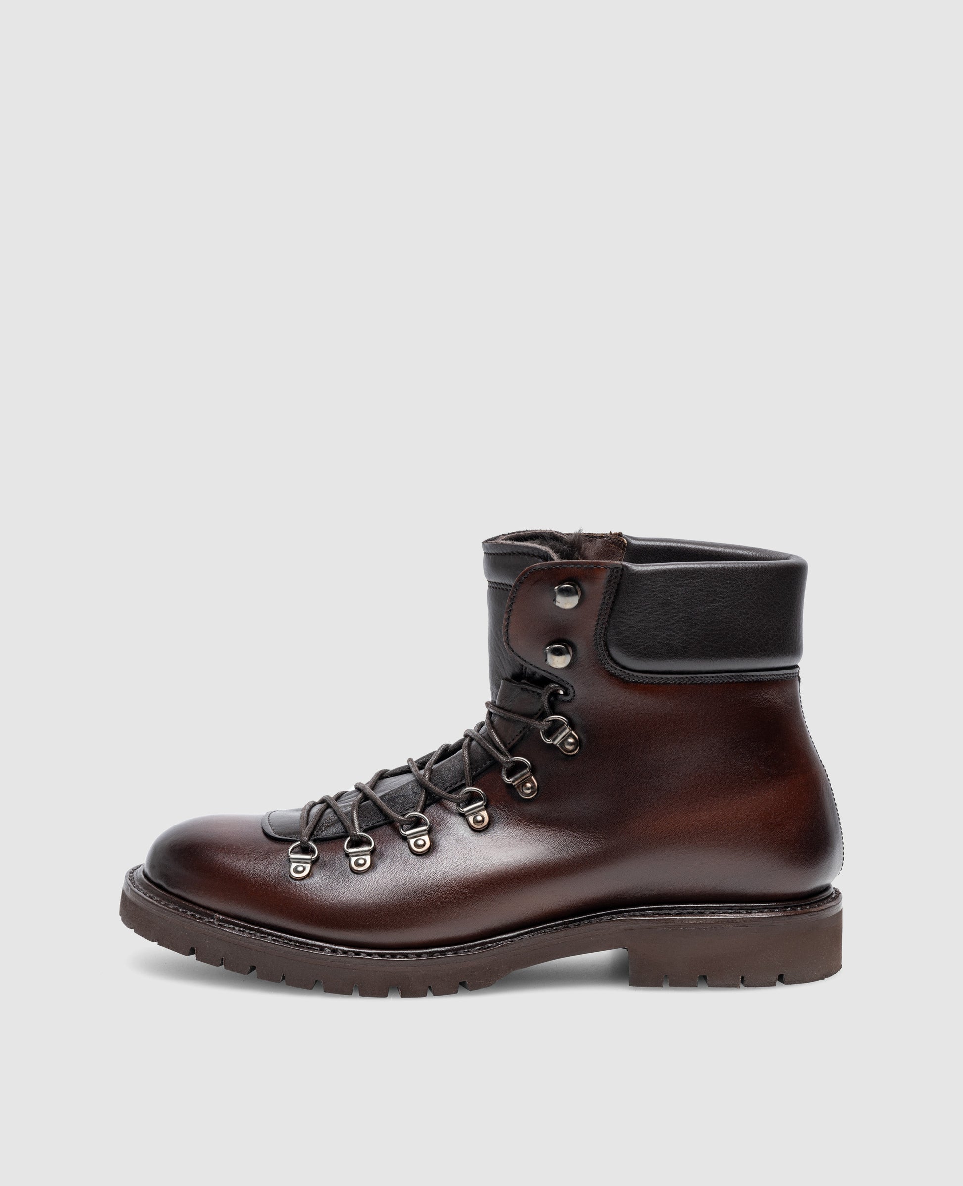 The Barkley hiking boot in black-brown calfskin with patina features a lambskin lining and a rubber sole with tread. The handcrafted and goodyear-welted design combines robust materials with precise workmanship for high comfort and weather resistance. Made in Spain.