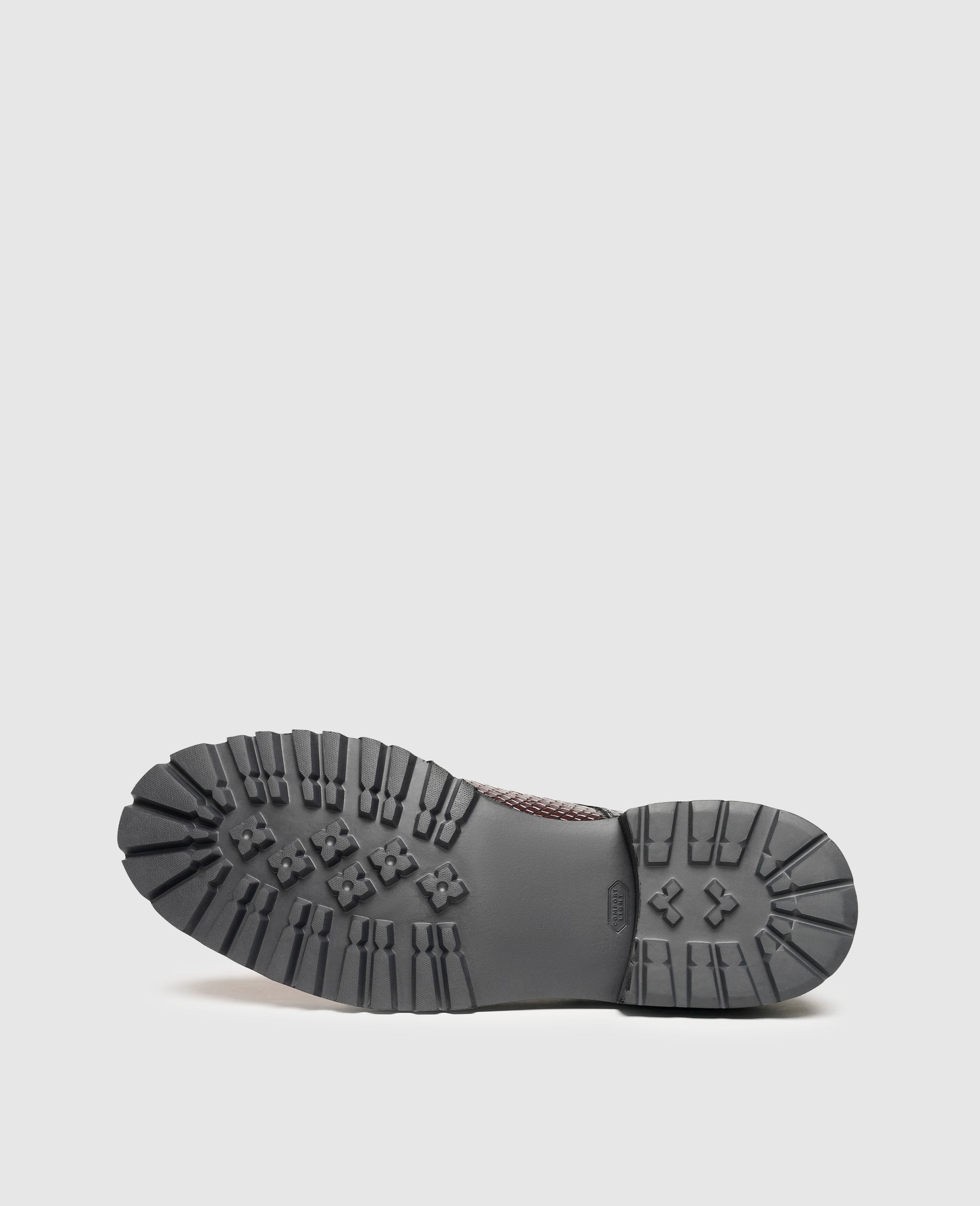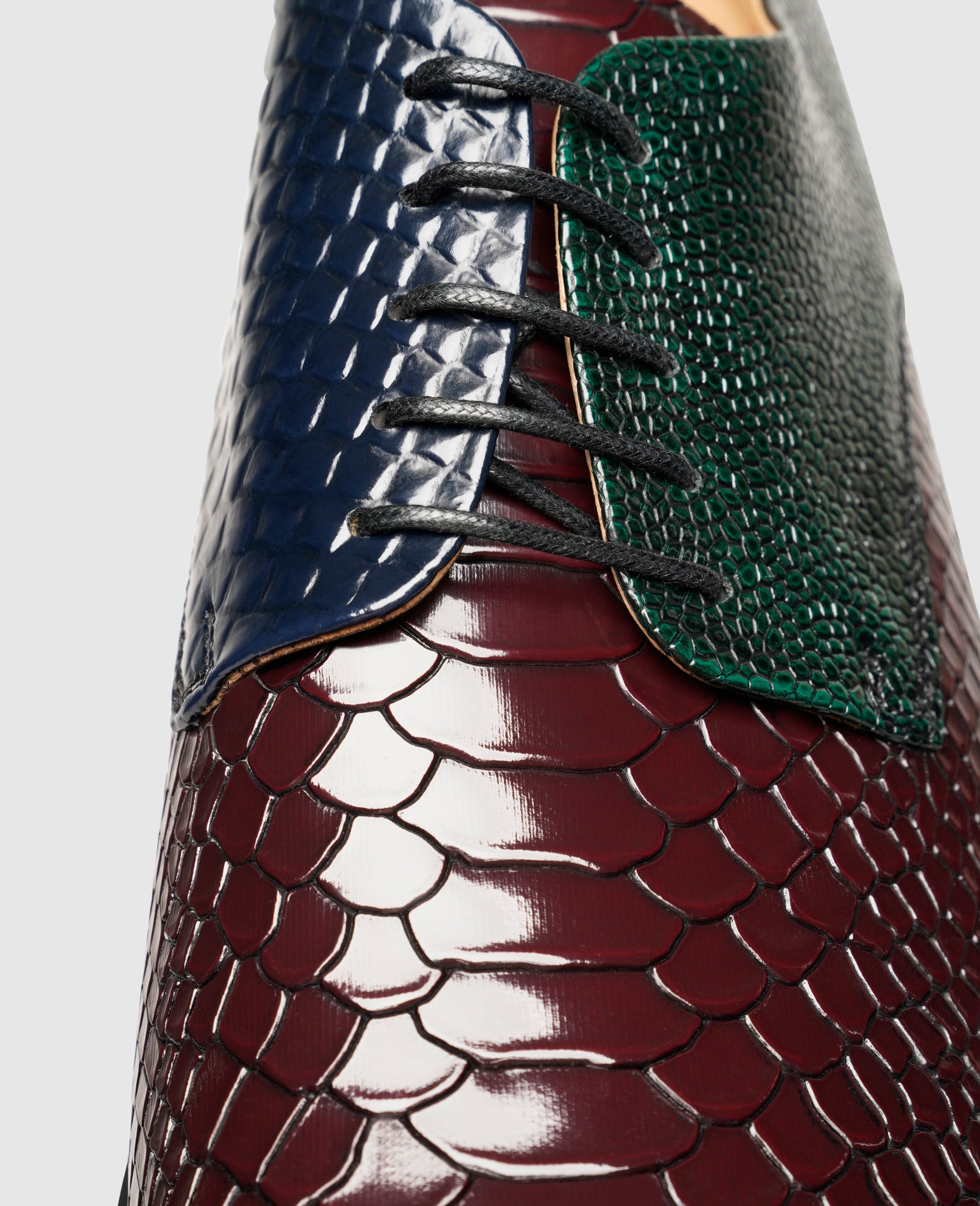 This Goodyear-welted, handcrafted plain Derby from the Henry Stevens "Industrial Image" line is anything but conventional. In this modern interpretation, the globally popular men's lace-up shoe surprises with its contrasting embossed leather sections and multicolor design. The contemporary look is further supported by a wide outsole with a distinctive rubber profile, offering stability even in adverse weather conditions. Overall, this exceptional men's shoe is the perfect choice for less formal occasions and its welcome accents can be combined with a variety of smart casual styles.