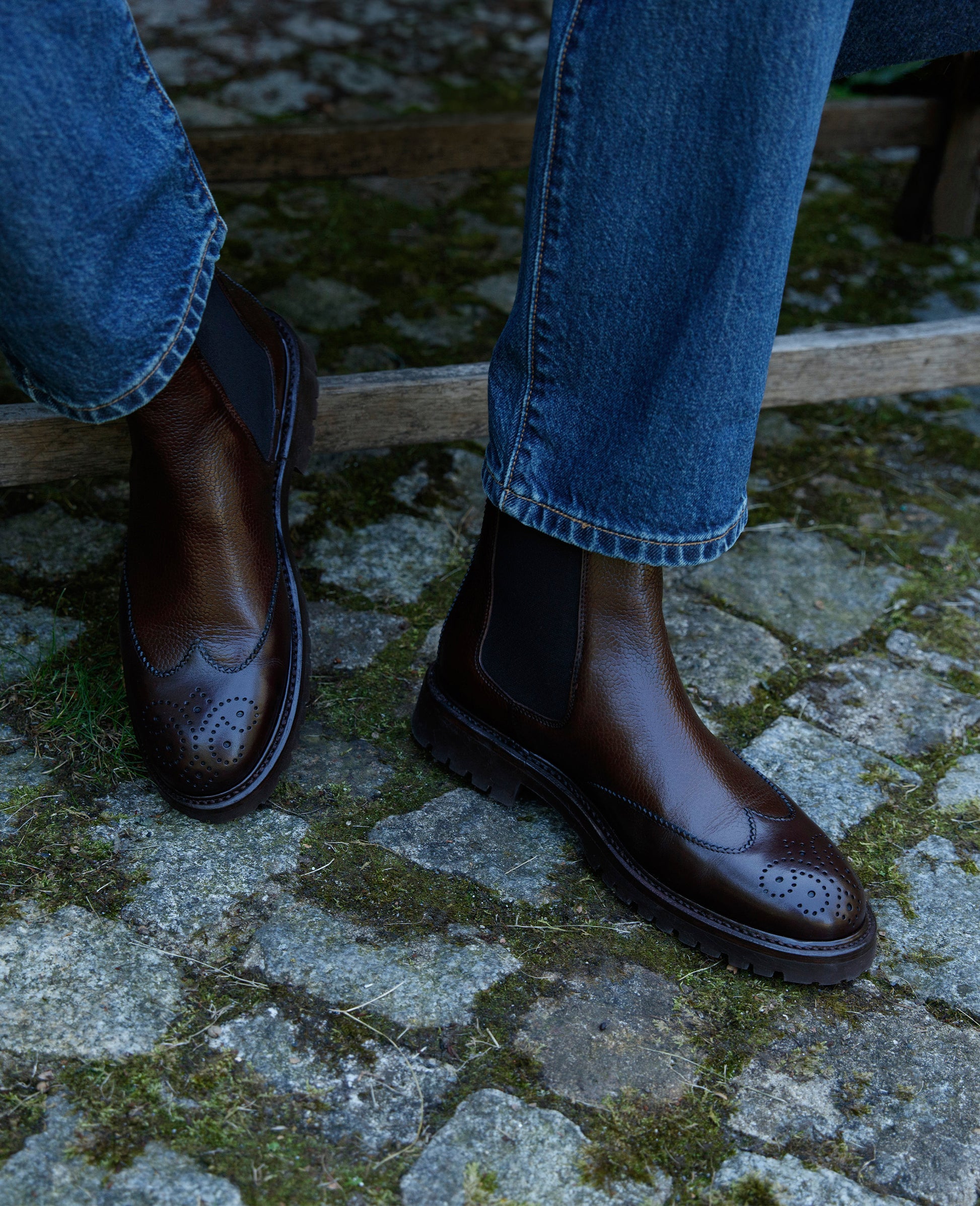 The Bonnie full-brogue Chelsea boot in dark brown made from embossed calfskin features an interior made from vegetable-tanned leather. With a rubber sole and handmade, goodyear-welted construction, it combines comfort and durability. Made in Spain.