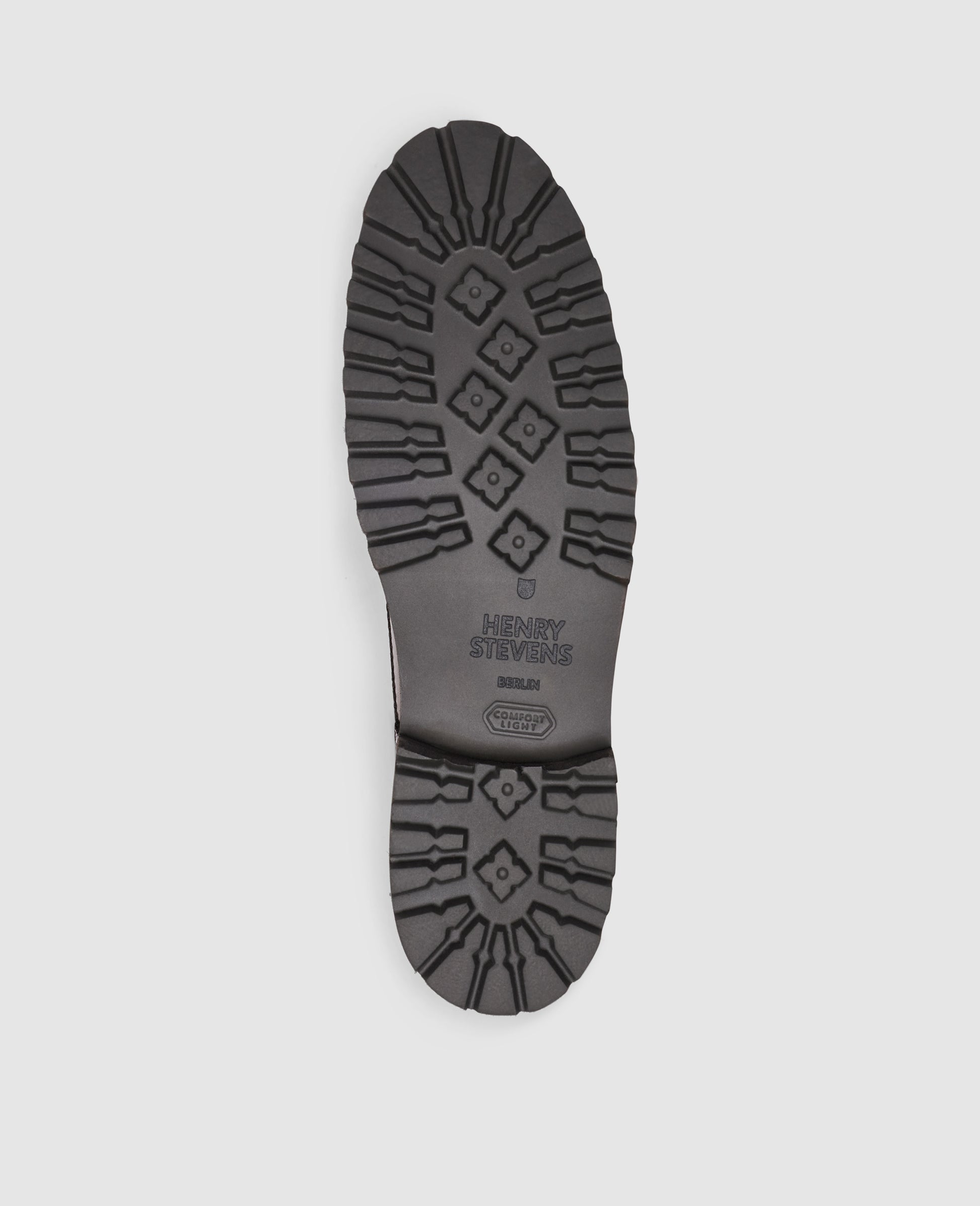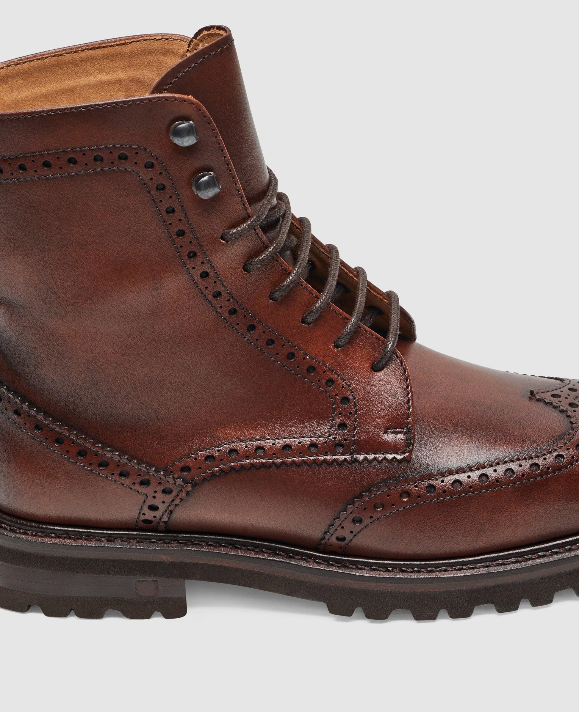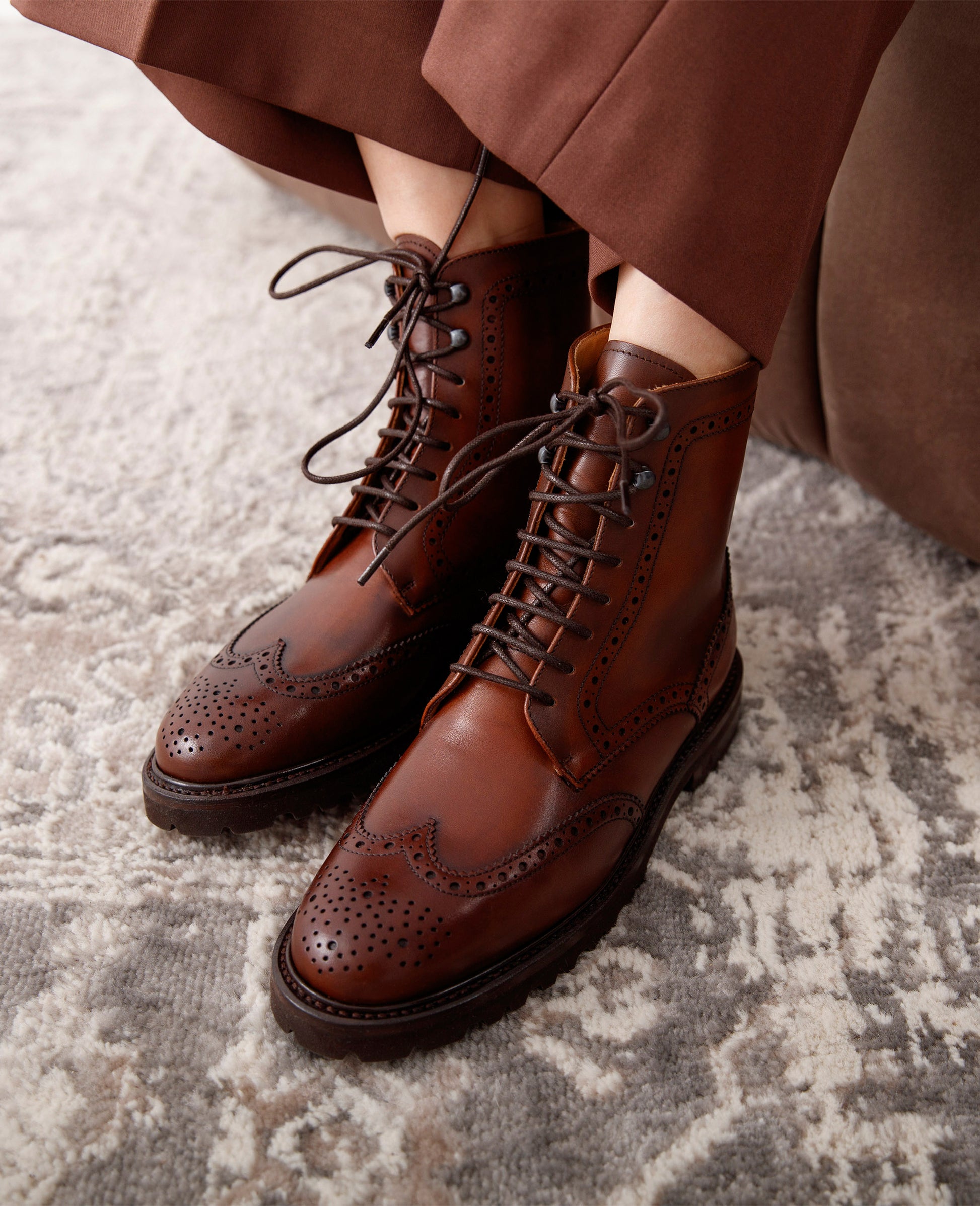The Bonnie full-brogue derby boot in mid-brown box calf features a vegetable-tanned leather interior and a treaded rubber sole. The handmade, goodyear-welted construction offers craftsmanship and comfort. Made in Spain.