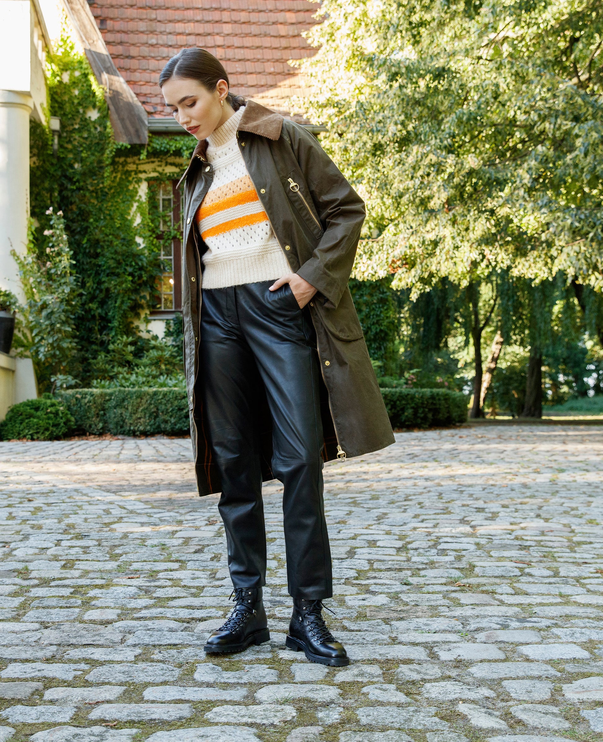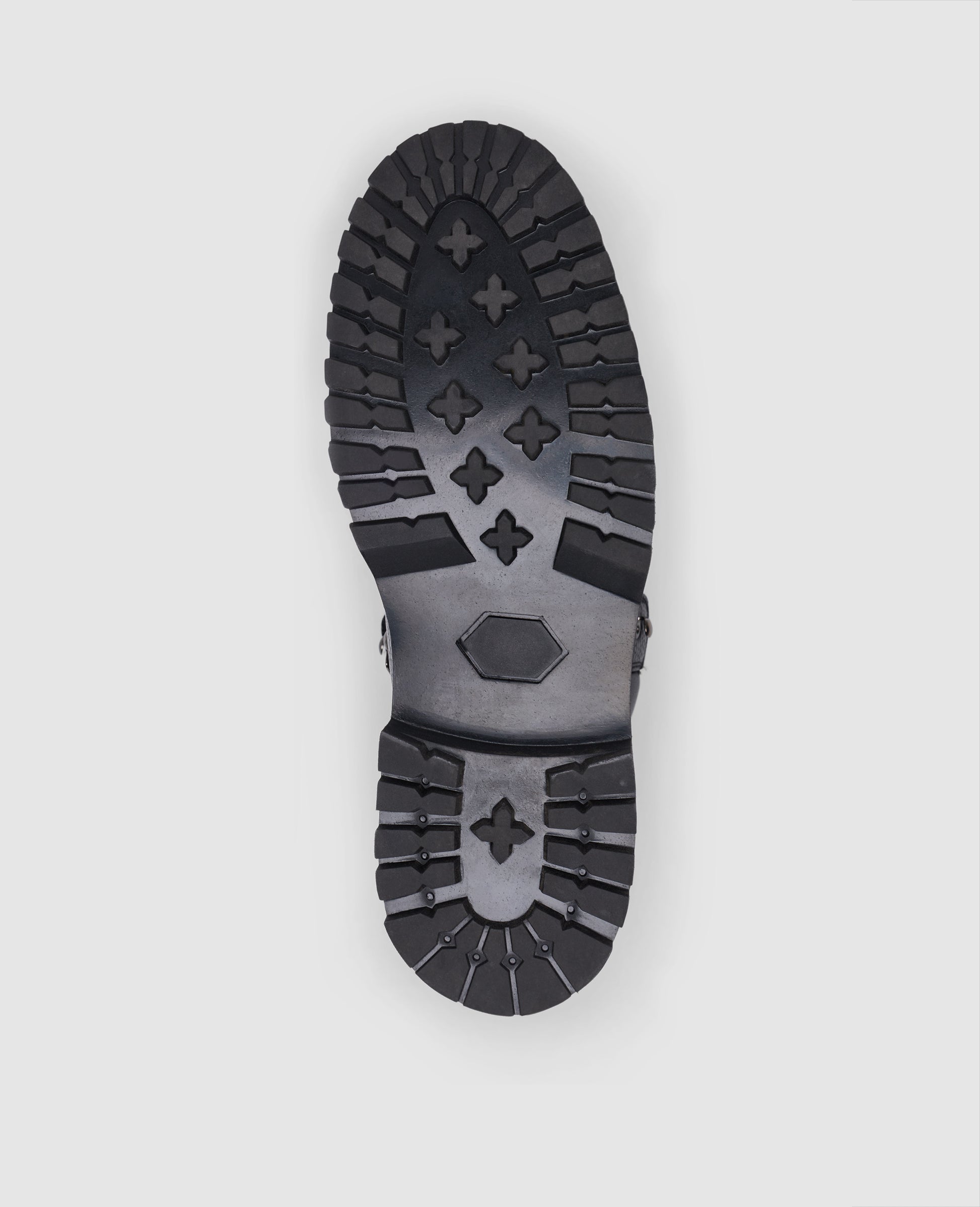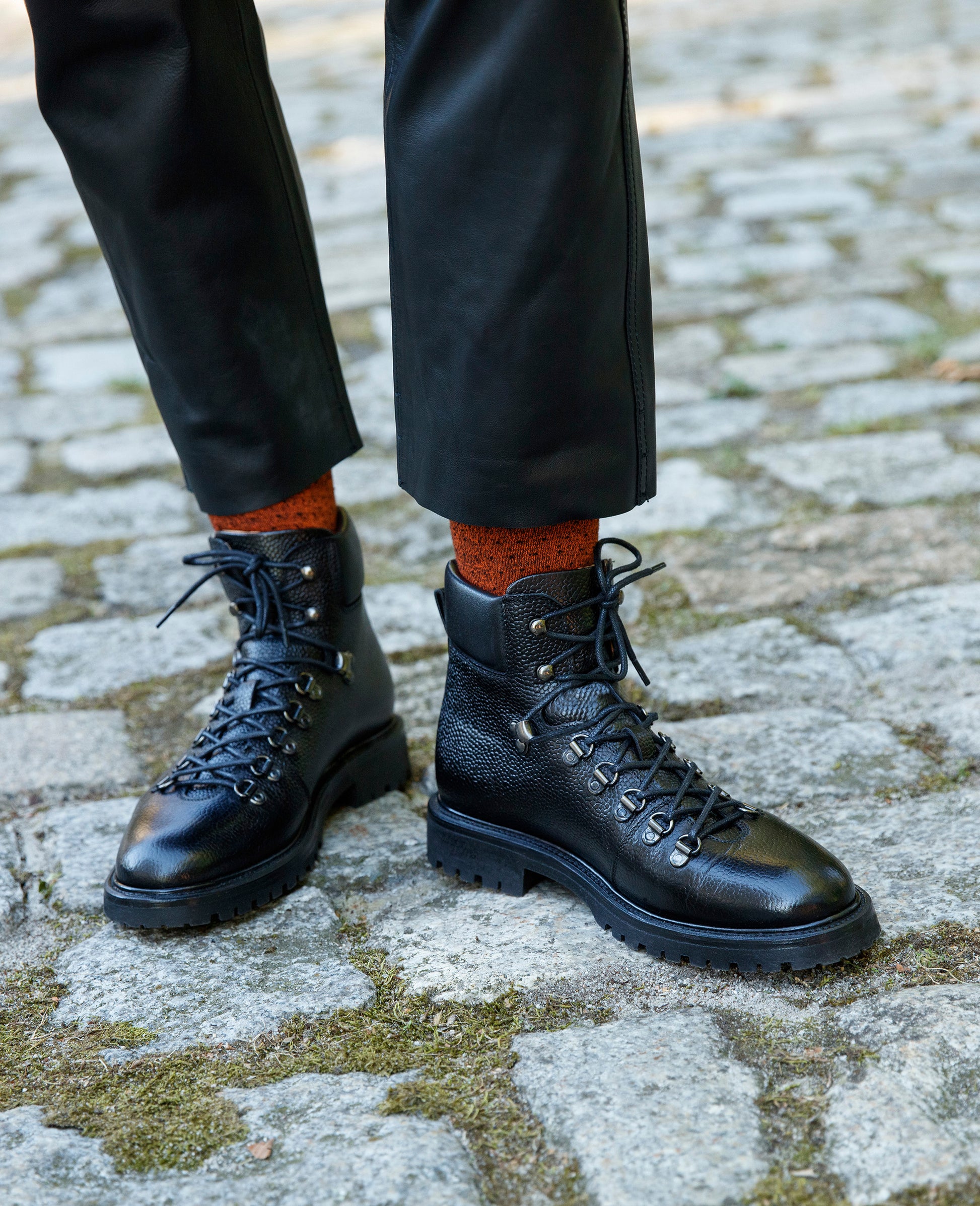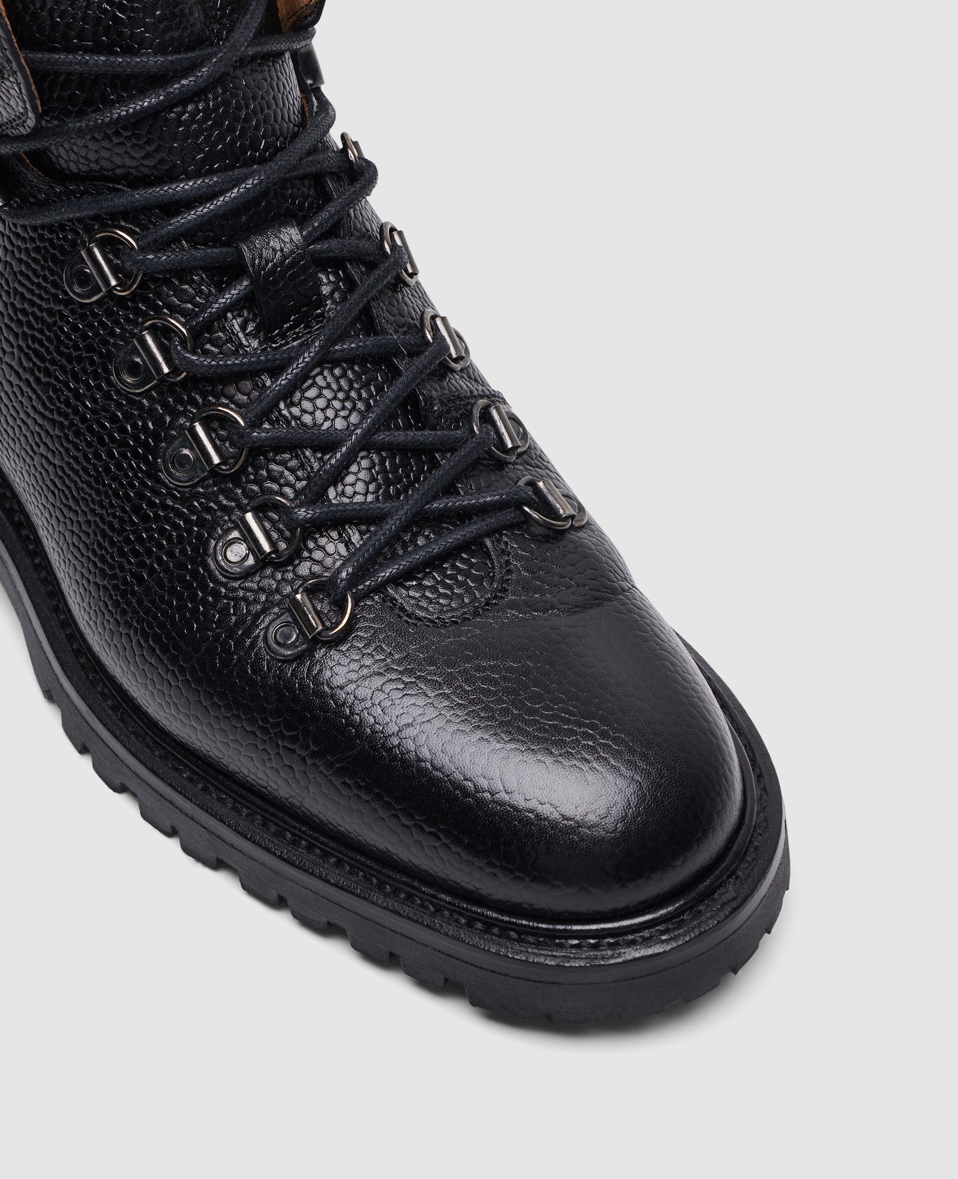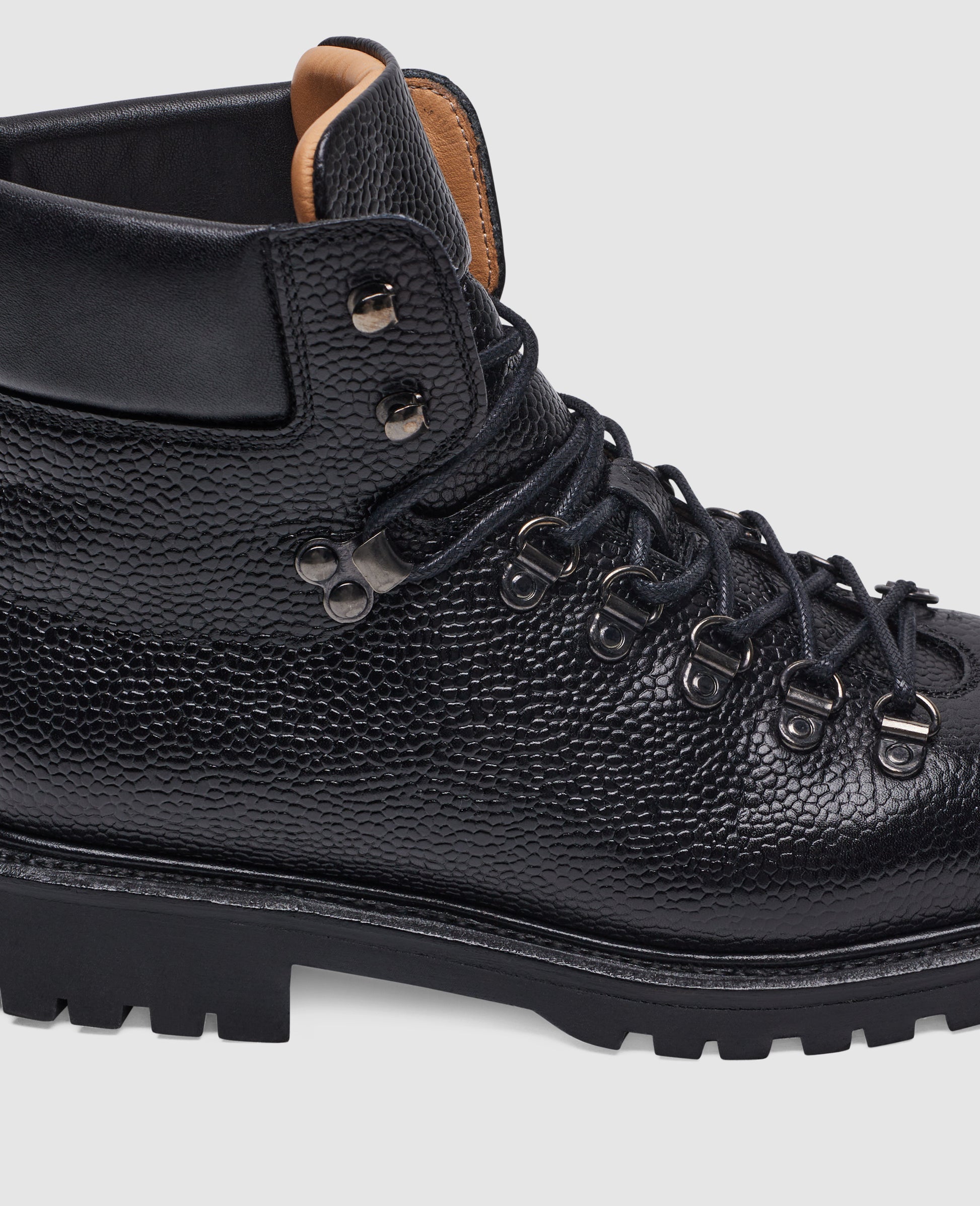 The Bonnie hiking boot in black made from embossed calfskin has a vegetable-tanned leather interior and a rubber sole. Handmade and goodyear-welted, it combines robust functionality with meticulous workmanship. Made in Spain.