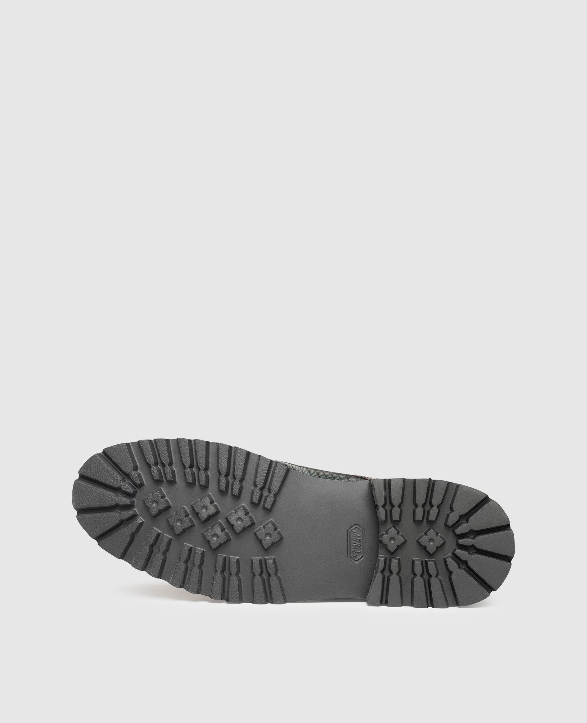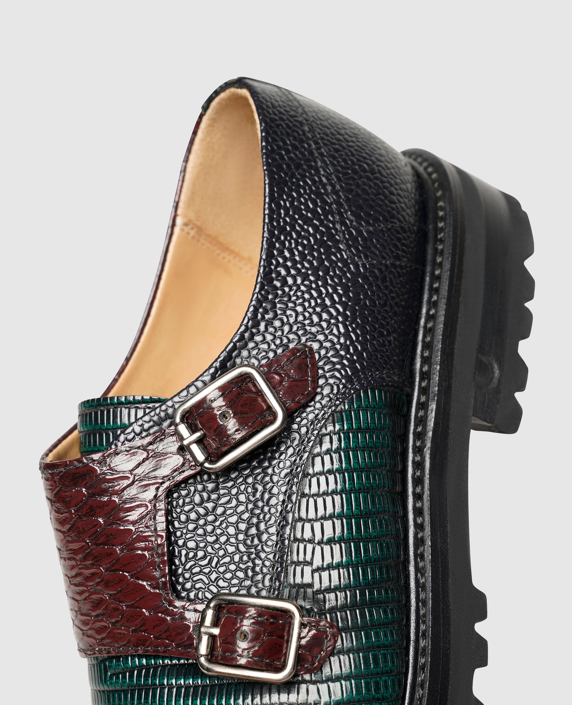 These handcrafted, Goodyear-welted double monk strap shoes for women from Henry Stevens surprise with their unique mix of designs. Part of the "Industrial Image" line, embossed leather sections in varying colors completely reinvent the famous women's shoe with its double buckle fastening. The striking look is supported by a sturdy rubber profile sole that guarantees reliable comfort even in the cold and wet season.