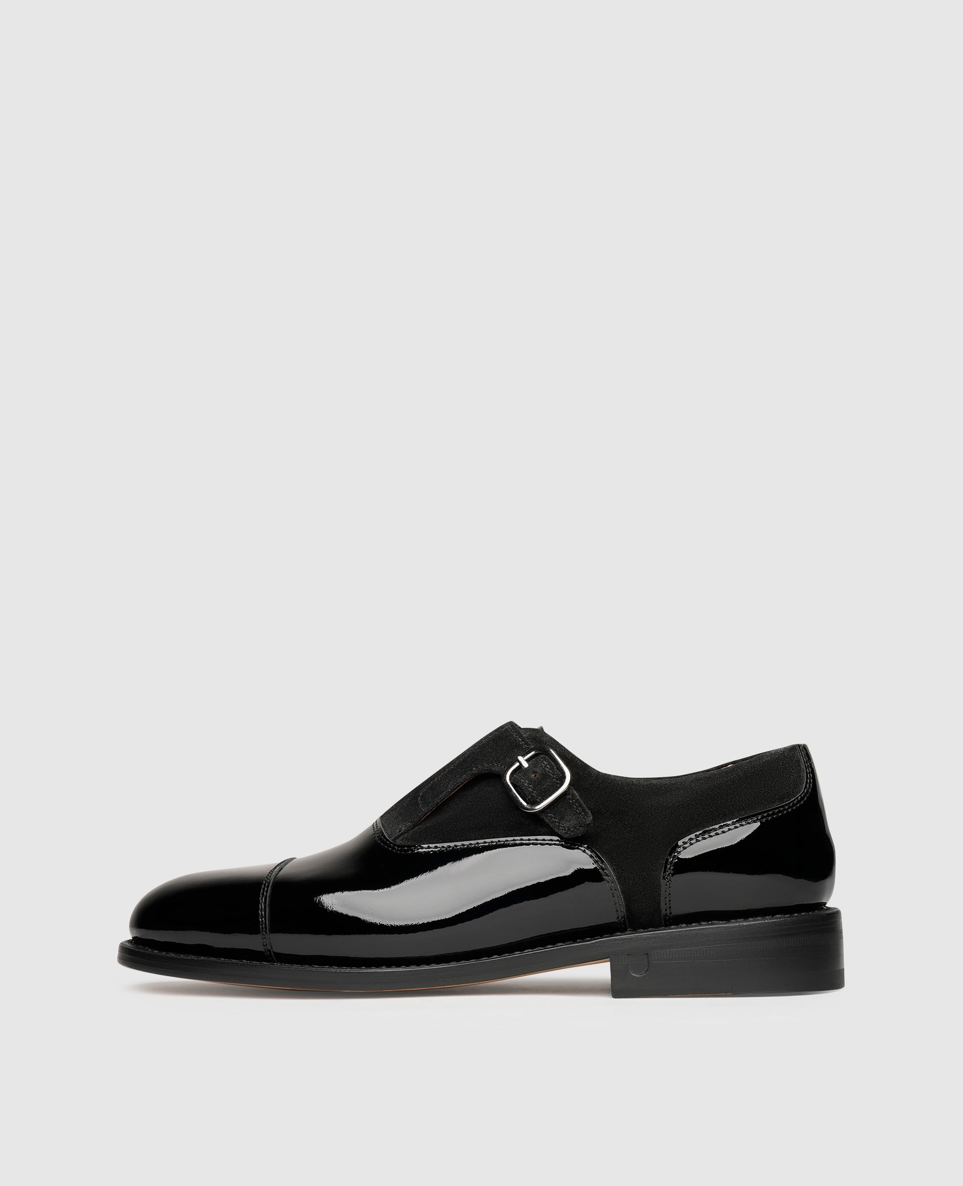 This exceptional buckled shoe for women features an exciting combination of two leathers: the feminine silhouette is adorned with an elegant, glossy patent leather as well as soft velour sections. Additionally, the toe cap adds a particularly special accent with its stitched seam. A silver buckle completes the captivating charm of this cap-toe monk strap, while a classic leather outsole lends additional grace.
