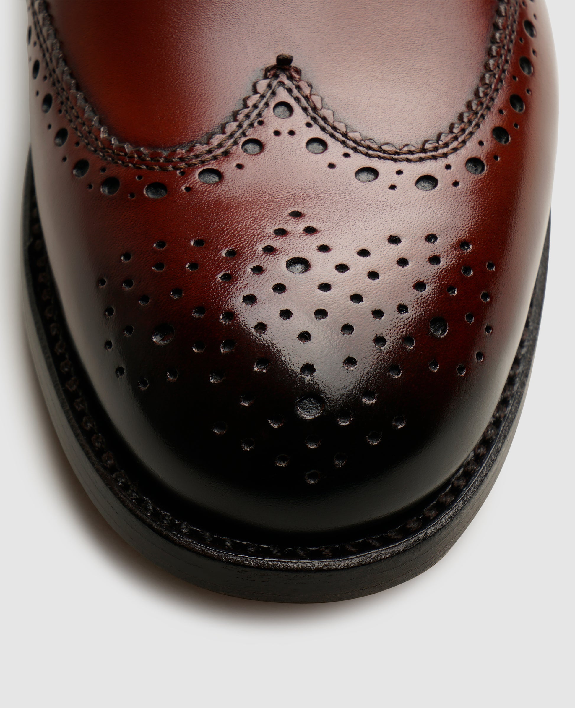 With the beautiful rich coloring of the leather uppers, the Ella full-brogue Blucher is sure to enhance any look. A hand-applied finish on the upper leather lends this model, with its open lacing, a fabulous color variation that is guaranteed to catch the eye. The intricate Lyra perforations along the edges of the upper as well as the curved wing and heel cap lend this women's shoe an air of additional sophistication. The elegant calfskin and traditional leather outsole transform this model into a durable and easy-to-repair staple to be enjoyed for many years to come.