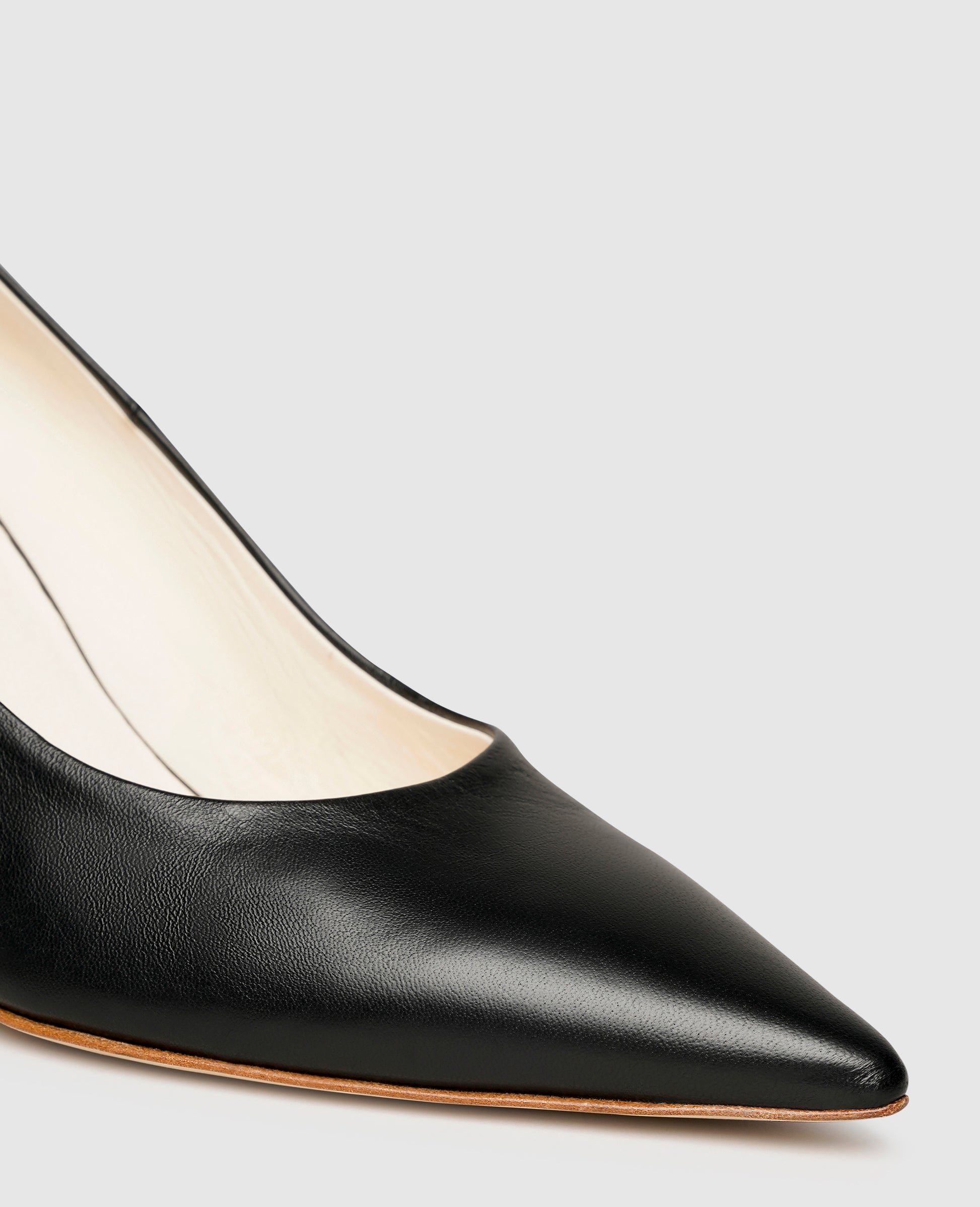 These pumps by Henry Stevens are the perfect choice for light and airy summer outfits. This black shoe for ladies made of smooth and soft goat nappa is complemented by a stiletto heel with a height of 7 centimeters. The fully compostable and skin-friendly inner lining made of organic leather ensures a pleasant shoe climate. The soft leather footbed with memory foam effect and the leather outsole will elevate your comfort to an incredibly high level. Made in Italy, this slip-on shoe is a true all-rounder for elegant business wardrobes, formal occasions and tasteful casual combinations.