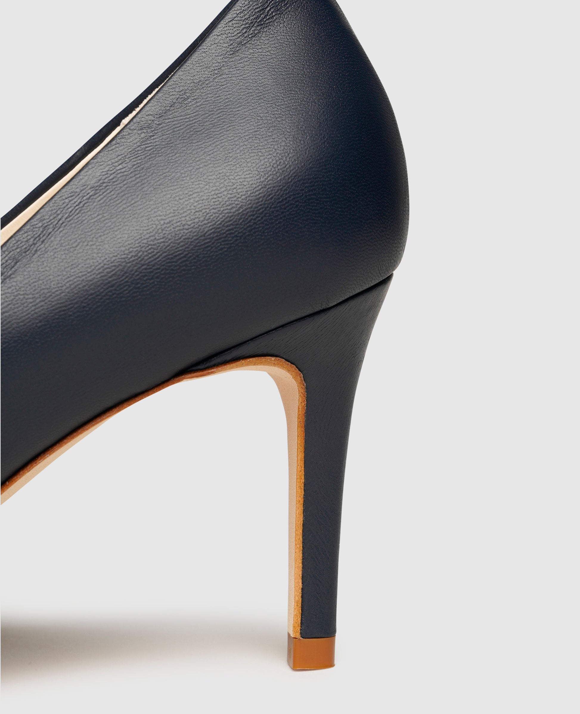 Add a feminine and graceful touch to any look with these pumps by Henry Stevens. Together with the fully compostable and skin-friendly organic leather lining and a comfortable footbed with memory foam, the shoe made in Italy guarantees modern lightness. The dark blue shoe for ladies will delight you, especially with its smooth and elegant goat nappa. The natural leather outsole and the 7-centimeter high stiletto heel support the pleasant walking feeling and underline the classy look of the shoe. This slip-on shoe is the first choice for classic business looks and formal occasions.