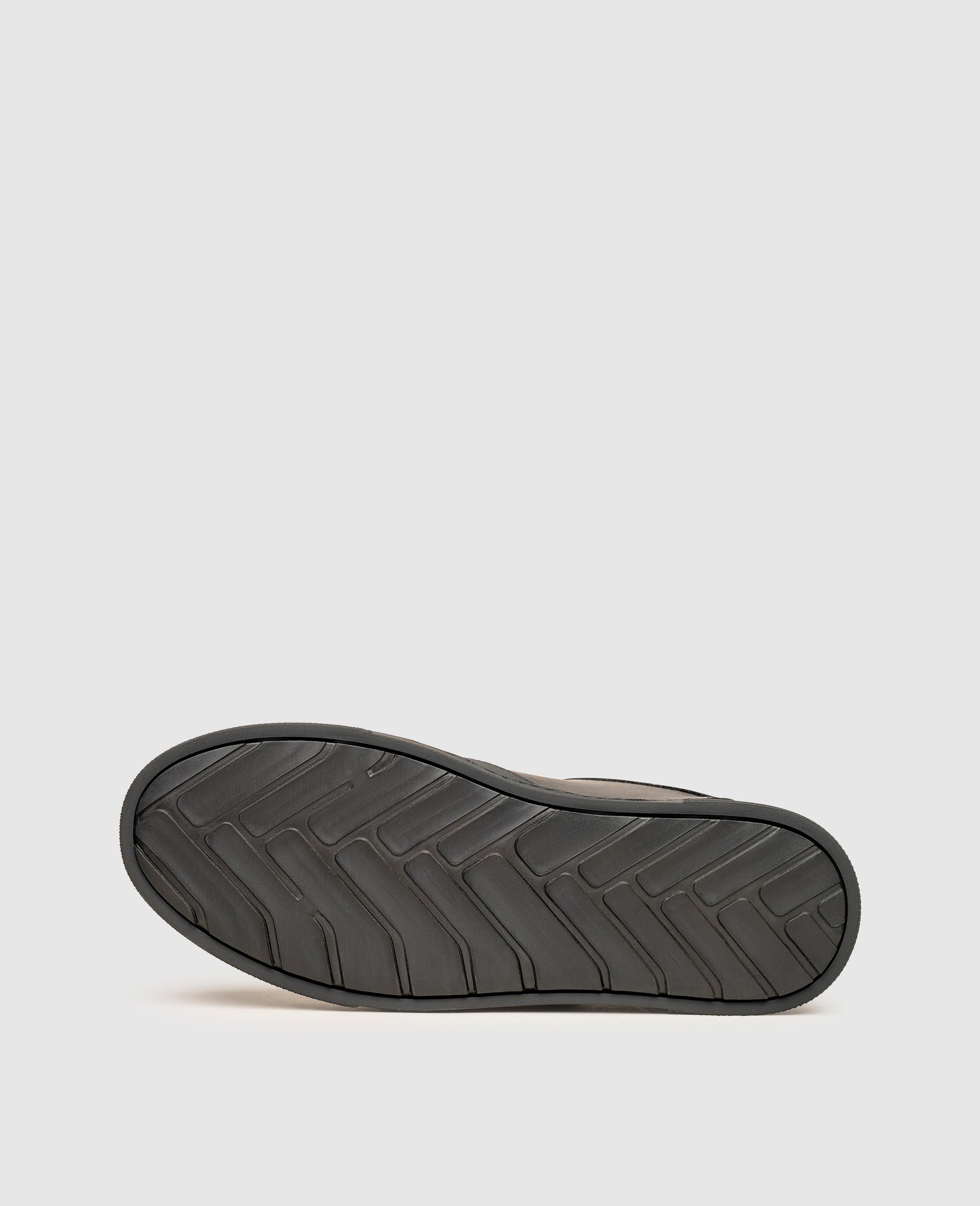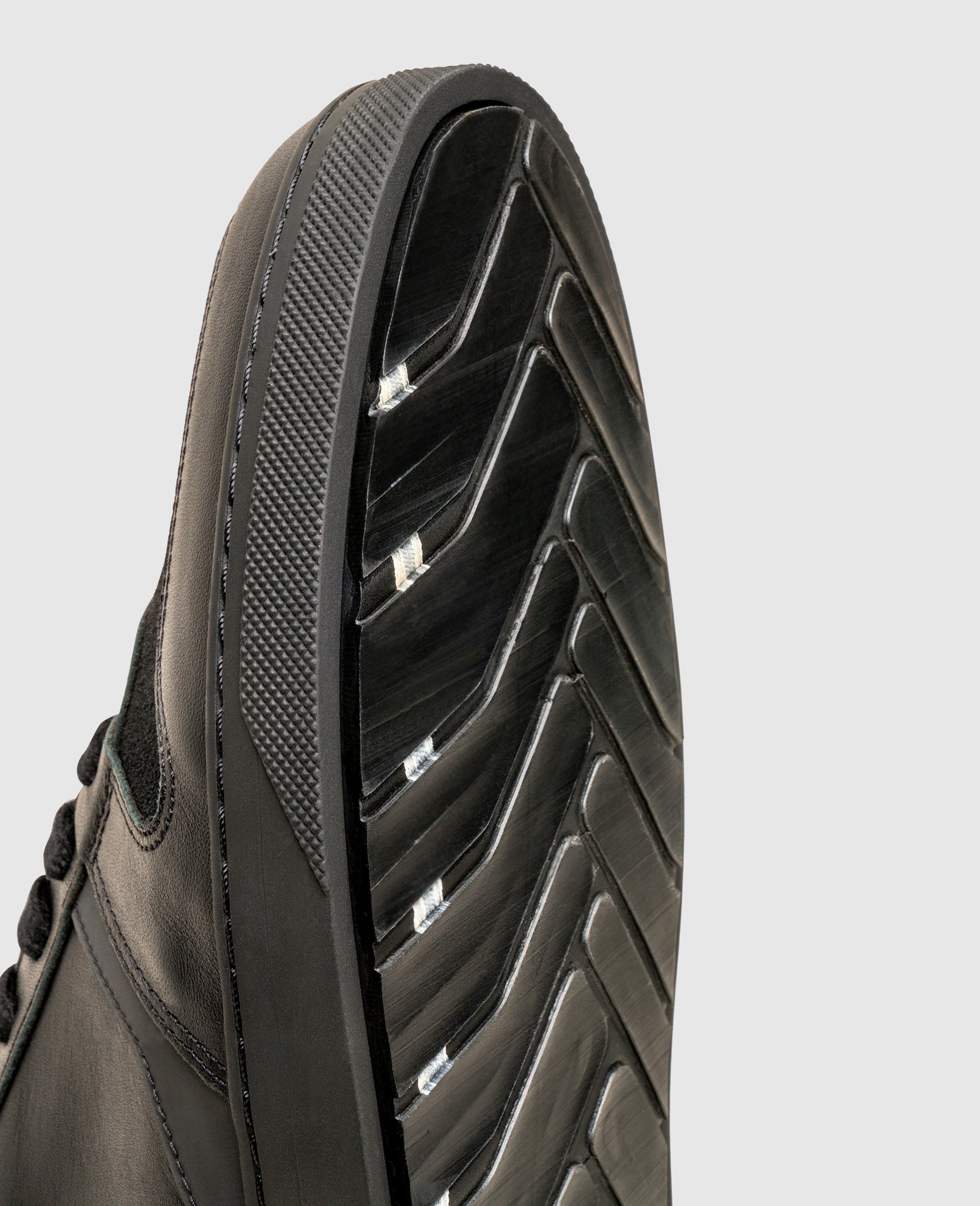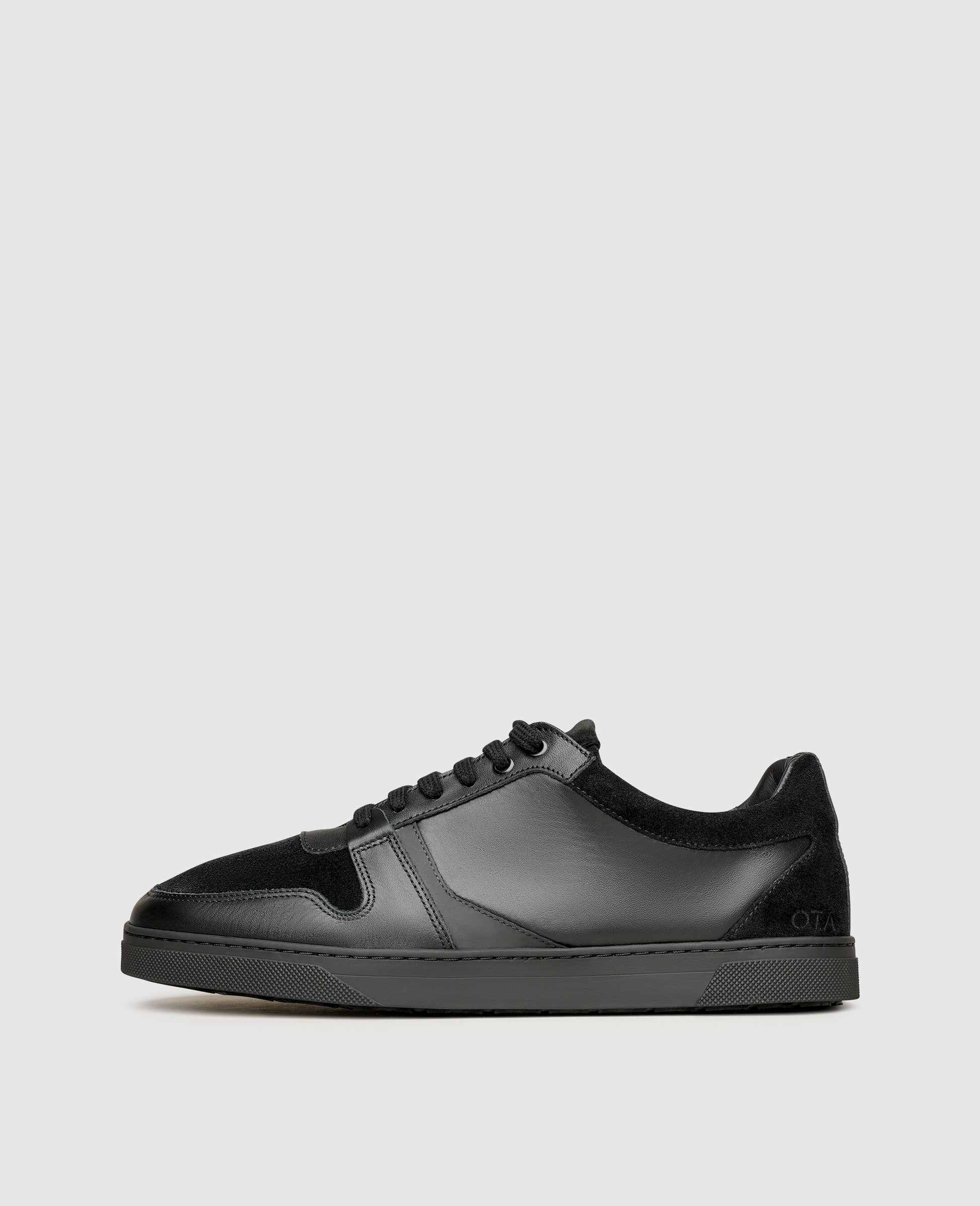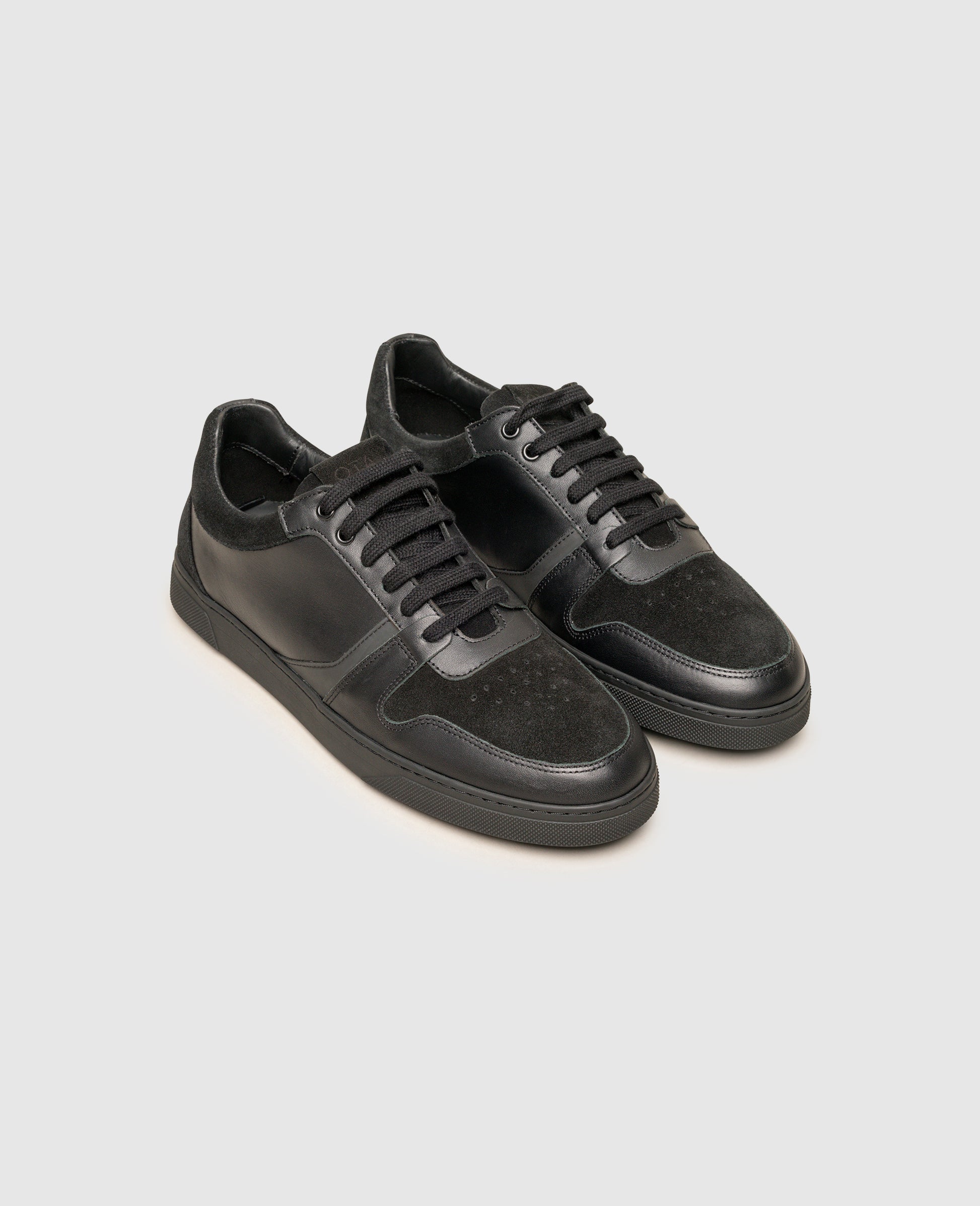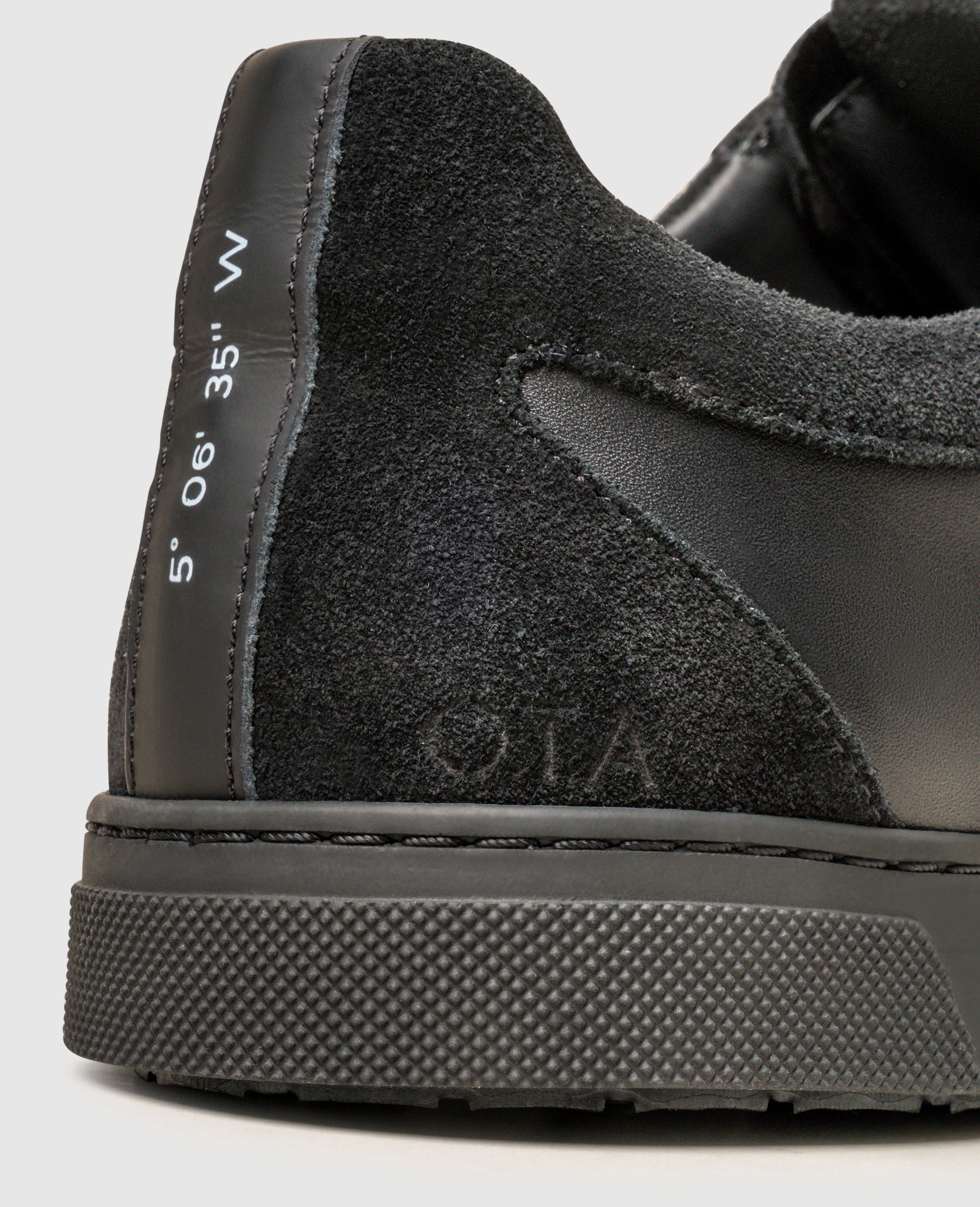 An on-trend combination of materials adorns the upper of these understated unisex trainers from the Parisian label O.T.A., complemented only by two color-contrasting accents. The coordinates of the Scottish town of Glencoe are immortalized on the heel. Supple calfskin accents the perforated toe section. Sustainable manufacturing is exemplified by the comfortable rubber sole created using recycled car tires.