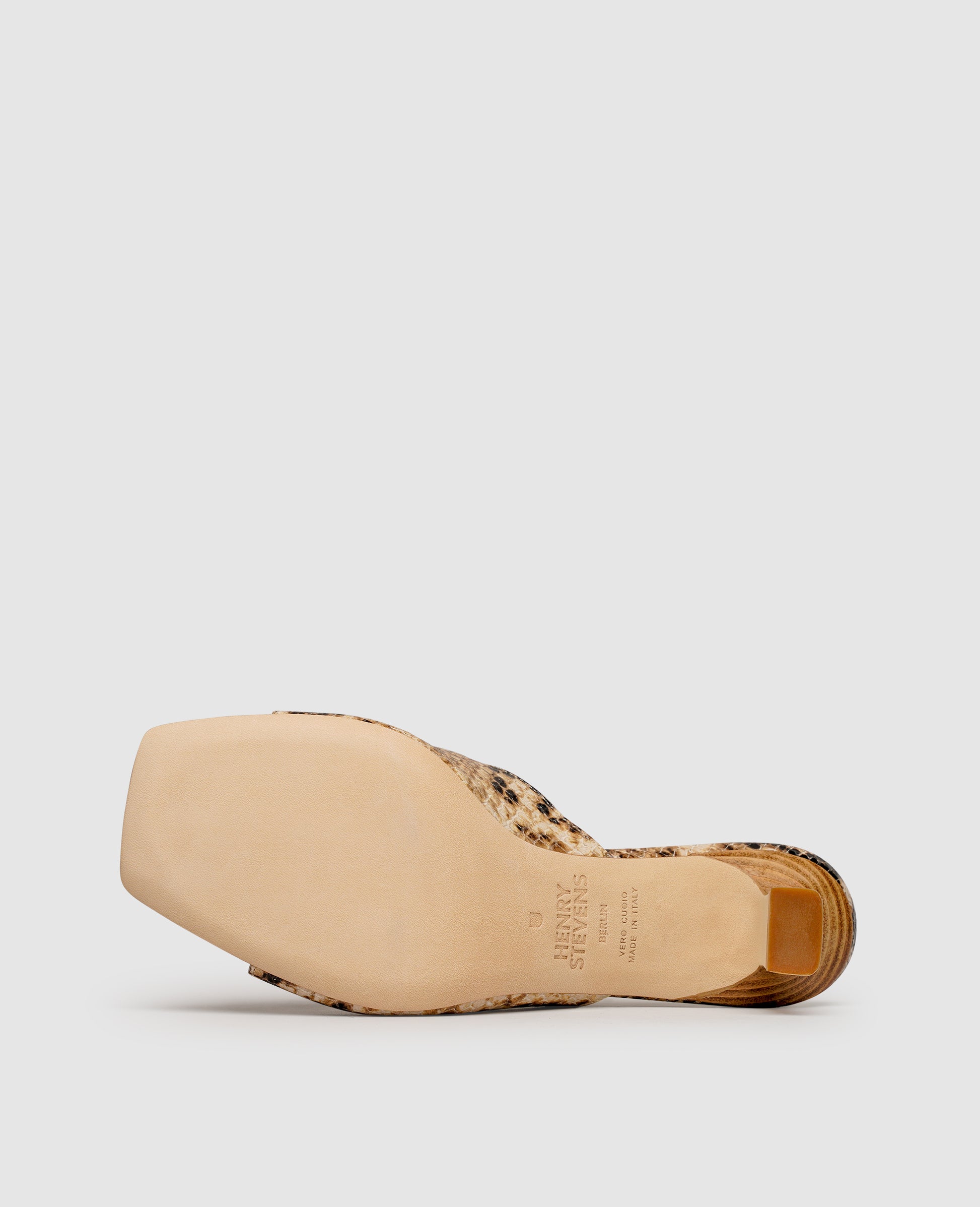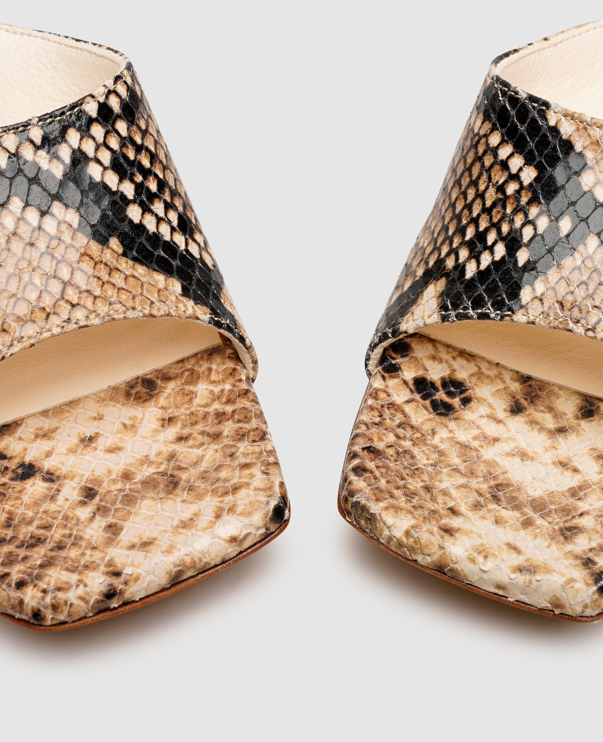 The wearer of these mules can be sure of appreciative glances, with several details that add a touch of extravagance to the model. The fine calfskin leather features an on-trend reptile look and is further accentuated by the square cut of the toe. This elegant and yet also modern ensemble is complimented perfectly by the sculptured five-centimeter heel and classic leather outsole.