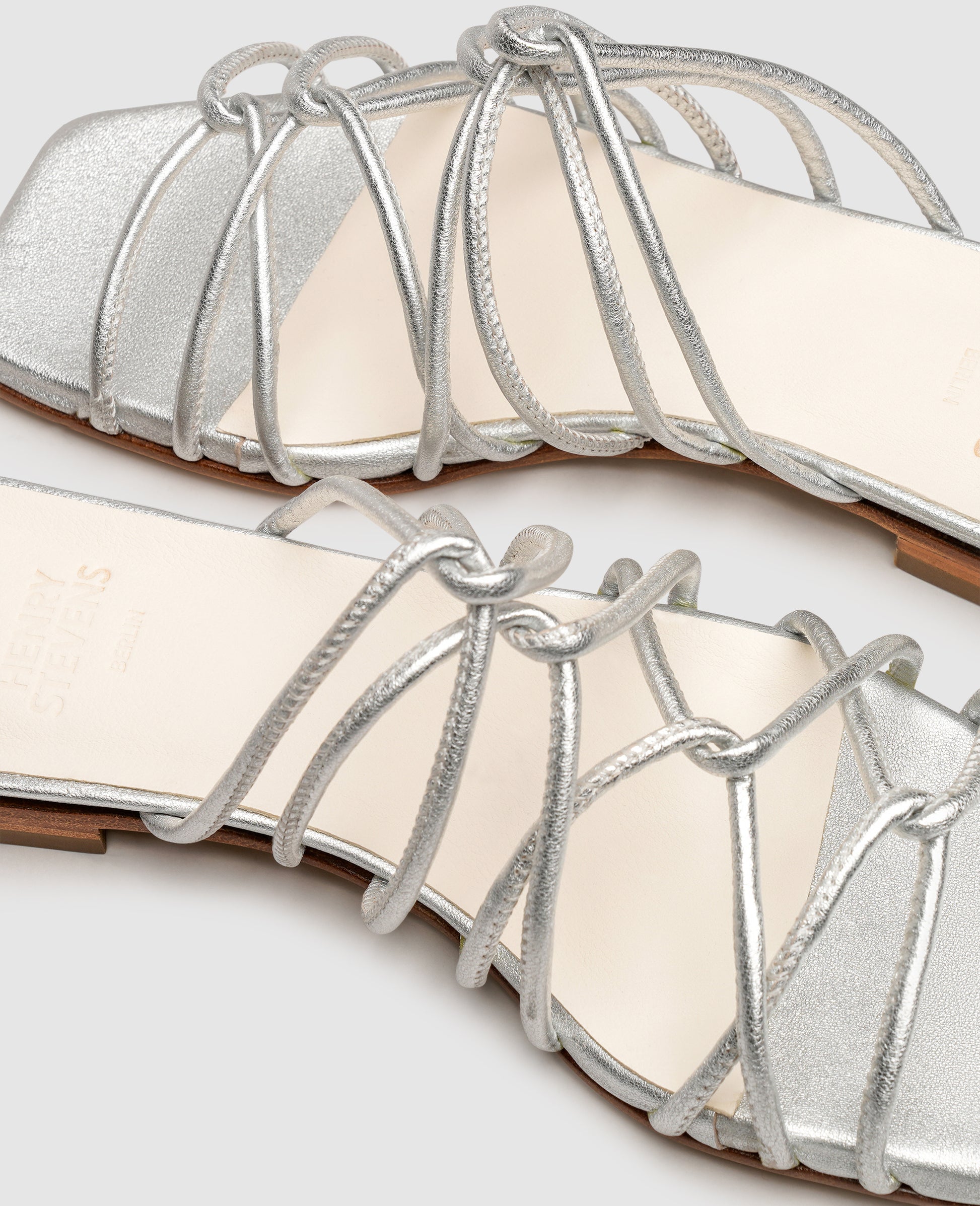 The delicate straps adorning these Henry Stevens' women's sandals have a shimmering sheen. The metallic look of the calfskin leather together with the square shape of the last makes this model an on-trend eye-catcher that, nonetheless, boasts a timeless elegance. The wearer does not have to forgo walking comfort either, thanks to the low one-centimeter heel.