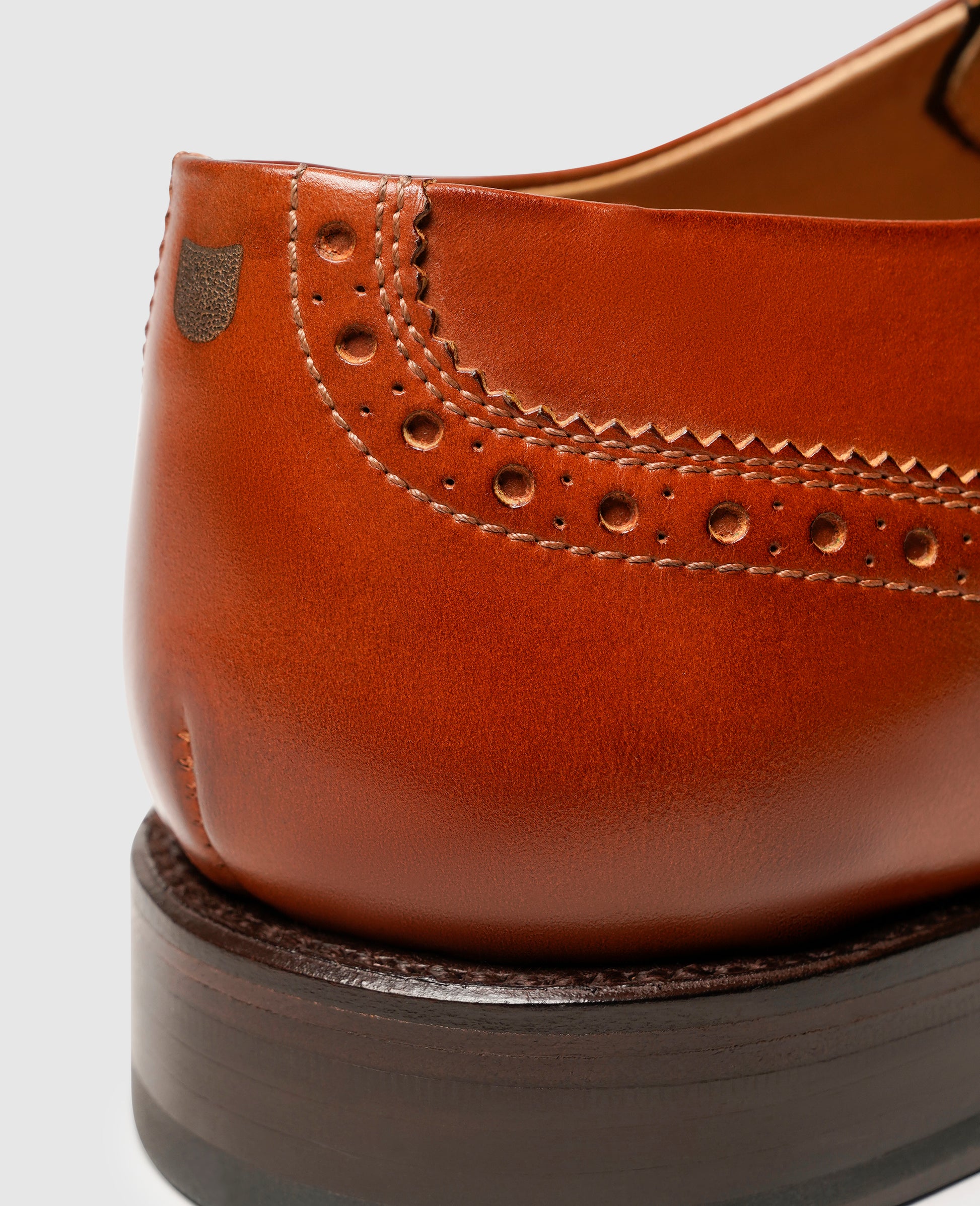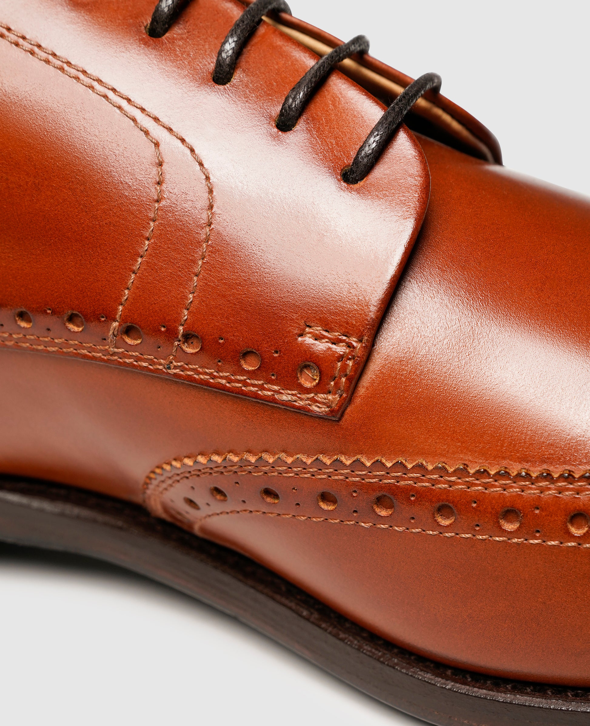 With its Jones model, Henry Stevens offers a classic, Goodyear-welted, handcrafted full-brogue Derby for men with a comfortable, wide design - the perfect choice for both sophisticated business and casual looks. The additional width is accompanied by a timeless design, with opulent perforations that exude a dynamic elegance. The upper features vegetable-tanned calfskin from France, which is further complemented by an inner lining that is also vegetable-tanned, as well as a durable leather outsole.