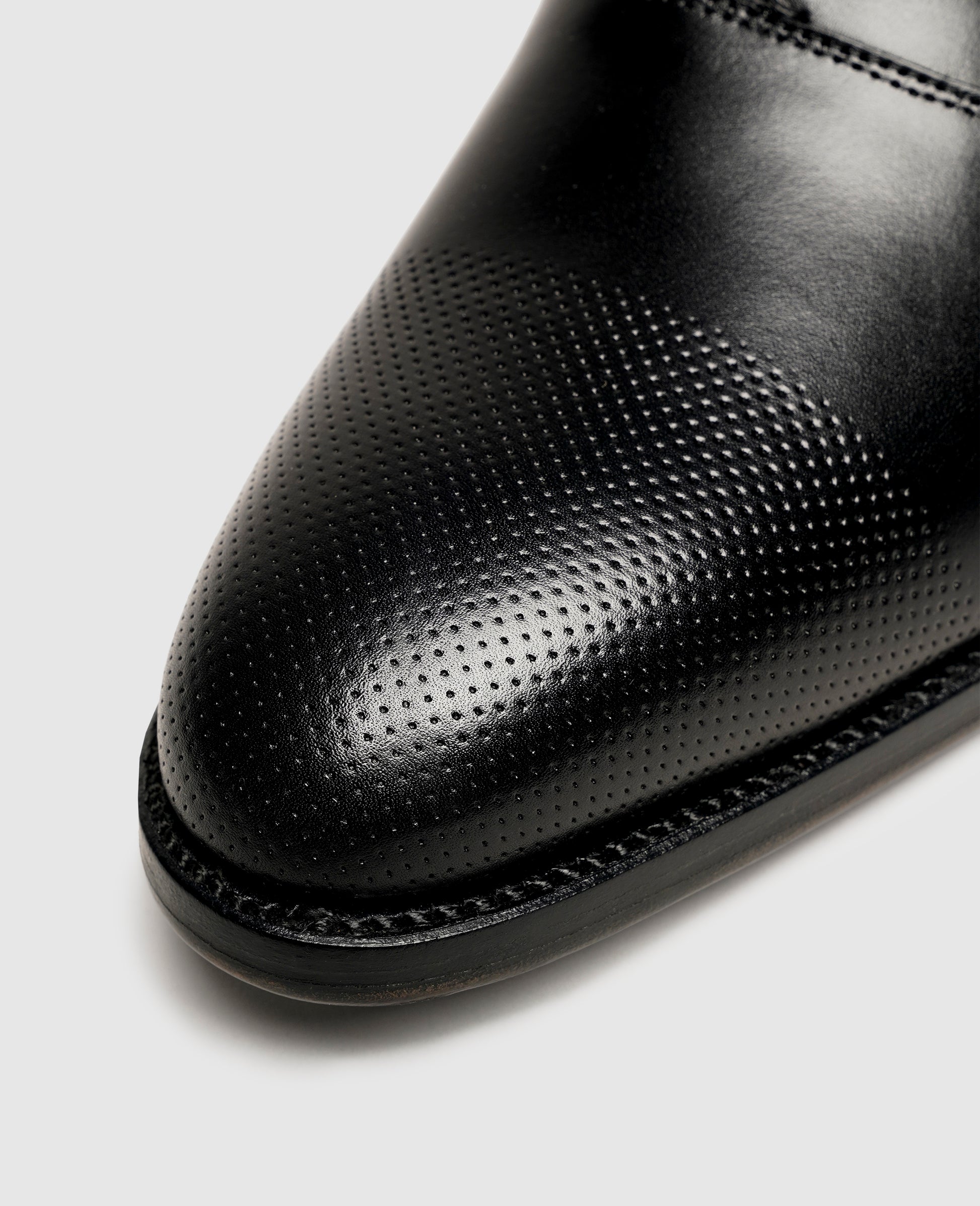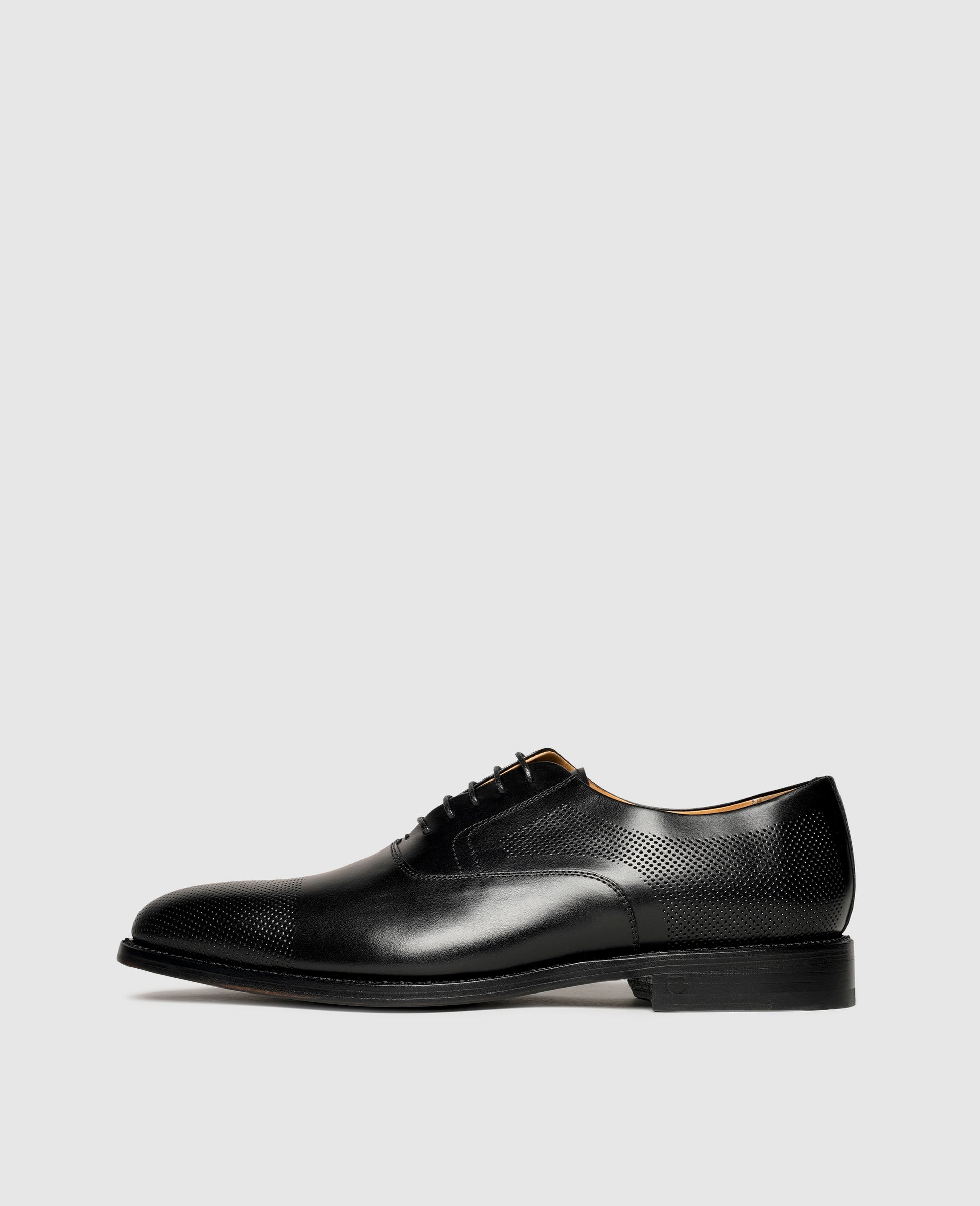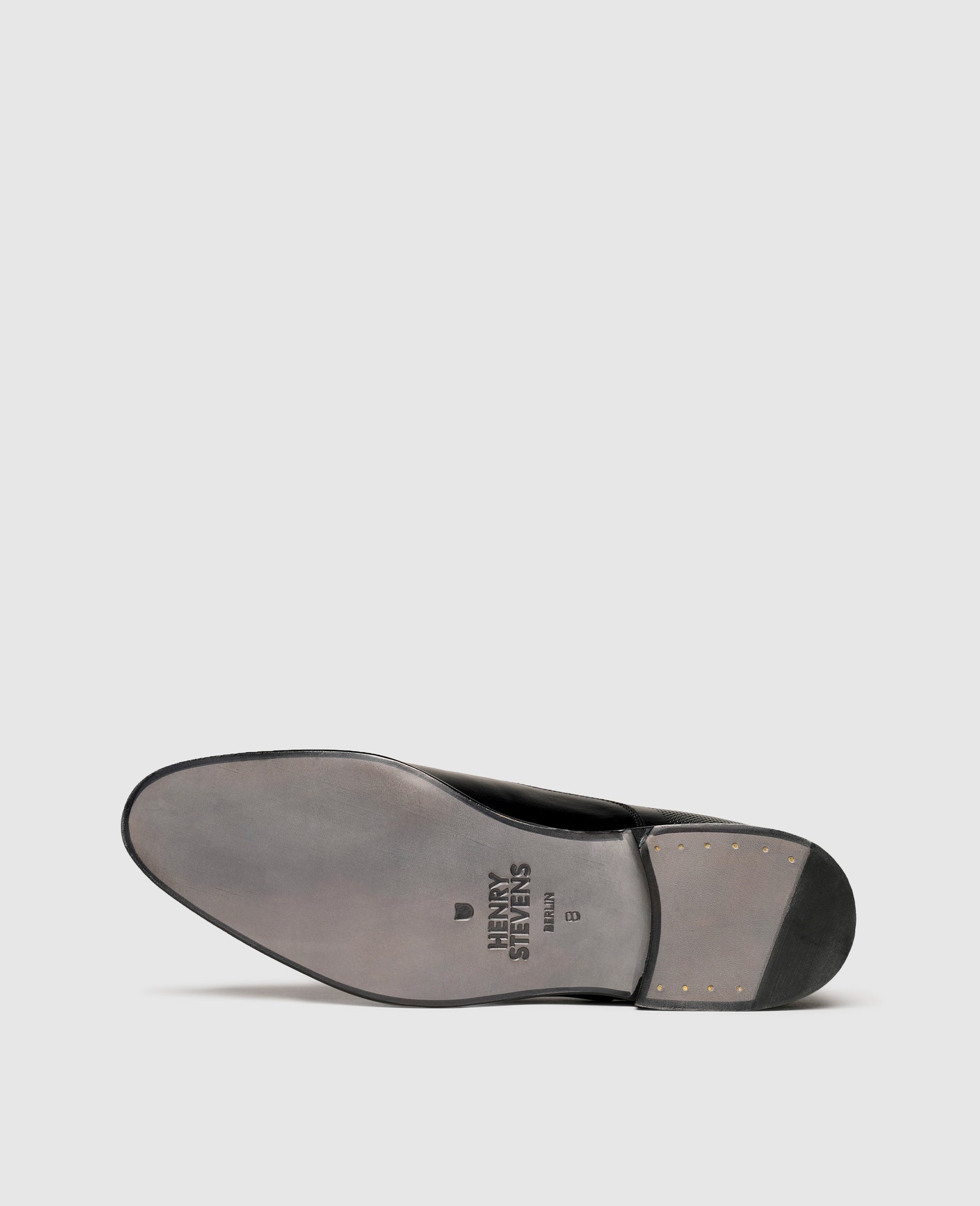 This Goodyear welted cap-toe oxford by Henry Stevens presents a sophisticated combination of grace and opulent dynamism at first glance. Inside the shoe, which is handcrafted in Spain, the vegetable-tanned and breathable leather lining and the comfortable leather footbed support the highest level of comfort. With its smooth and fine-pored newcastle leather and 5-hole lacing, this black shoe for men is particularly comfortable to wear. The unique selling point are decorative micro perforations, which give the shoe that certain something and skillfully showcase its elegance. Thanks to the noble leather outsole, you don't have to miss out on comfort even during long walks. Its dynamic grace transforms this popular lace-up shoe into a versatile companion for confident business looks and upscale casual wardrobes.