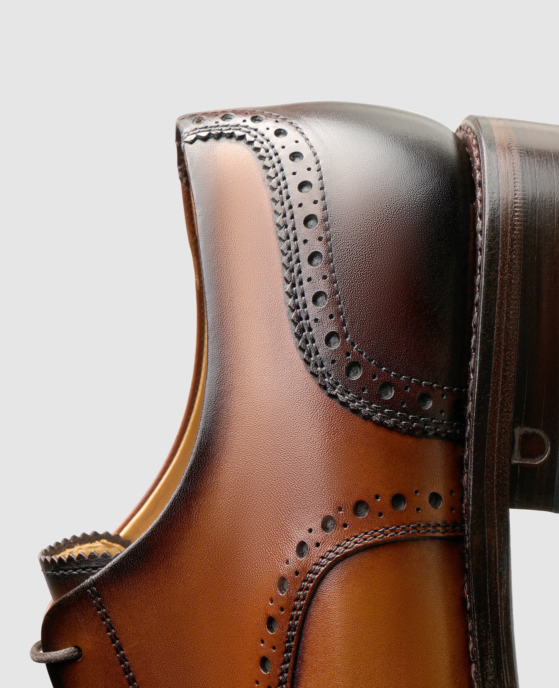 This Goodyear-welted, handcrafted full-leather shoe from Henry Stevens is excitingly unconventional. Traditionally opulently decorated, the full-brogue Derby features an exciting pattern of perforations along the edges of the upper and the curved toe and heel caps. The two-tone upper leather, refined by an elaborate hand finish, is a real eye-catcher, providing individual shades of color and a breathtaking shine on the shoe's upper. The dynamic character of this exceptional lace-up shoe for men is supported by its modern last shape and open lacing. The distinguished leather outsole, exquisite materials, and meticulous manufacturing complement the exciting look of this full-brogue Derby with its exceptional comfort and durability.