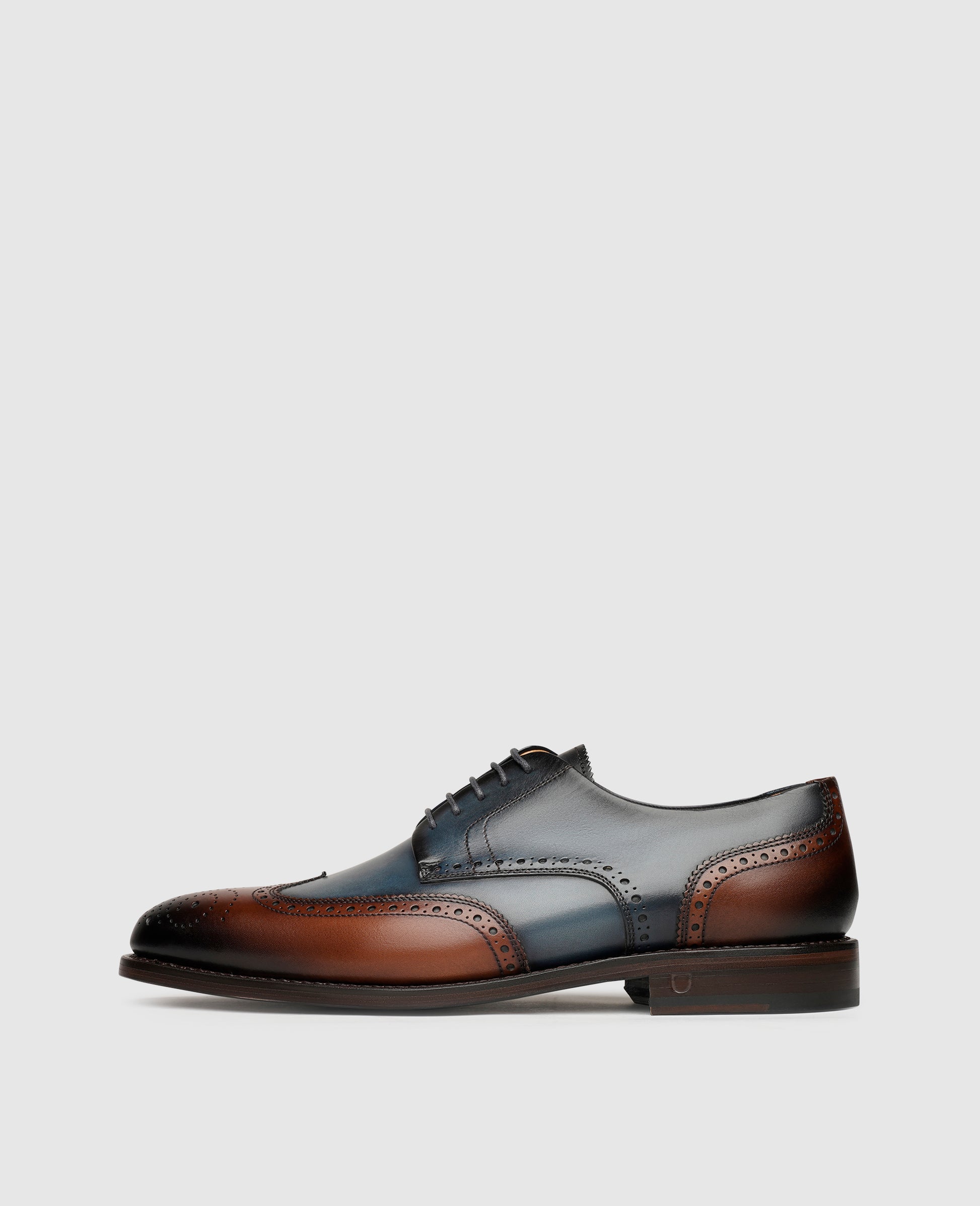 This Goodyear-welted, handcrafted full-leather shoe from Henry Stevens is excitingly unconventional. Traditionally opulently decorated, the full-brogue Derby features an exciting pattern of perforations along the edges of the upper and the curved toe and heel caps. The two-tone upper leather, refined by an elaborate hand finish, is a real eye-catcher, providing individual shades of color and a breathtaking shine on the shoe's upper. The dynamic character of this exceptional lace-up shoe for men is supported by its modern last shape and open lacing. The distinguished leather outsole, exquisite materials, and meticulous manufacturing complement the exciting look of this full-brogue Derby with its exceptional comfort and durability.
